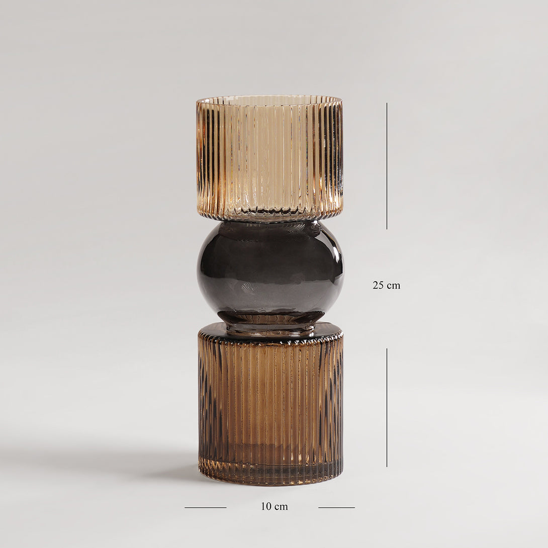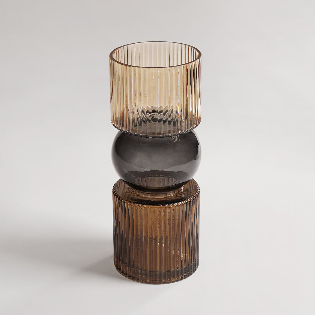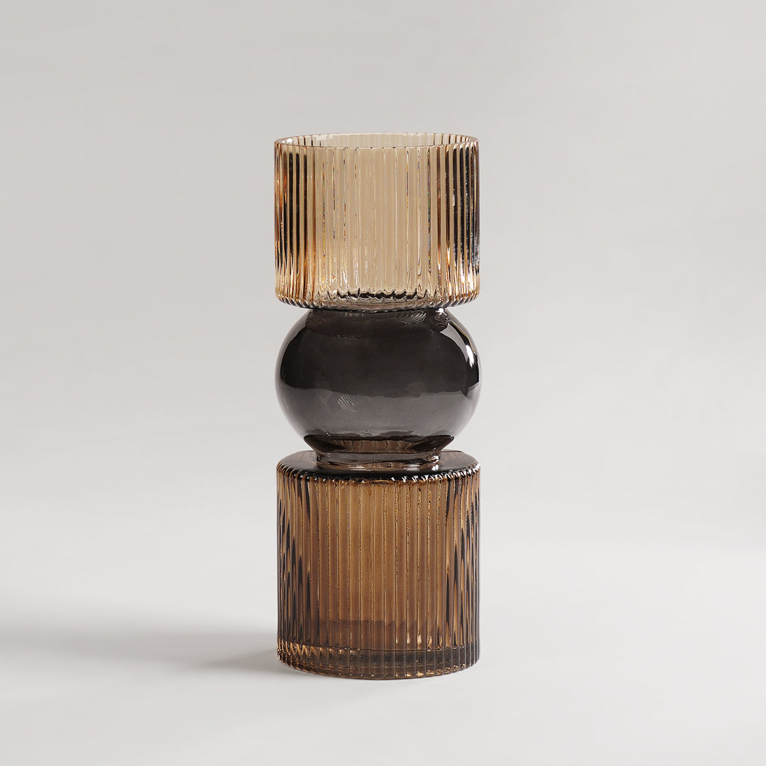 Add contemporary elegance to your space with this ribbed glass vase, featuring layered amber and smoky hues for a luxe vibe. Its sculptural geometric design makes it perfect as a modern statement piece or chic floral holder.