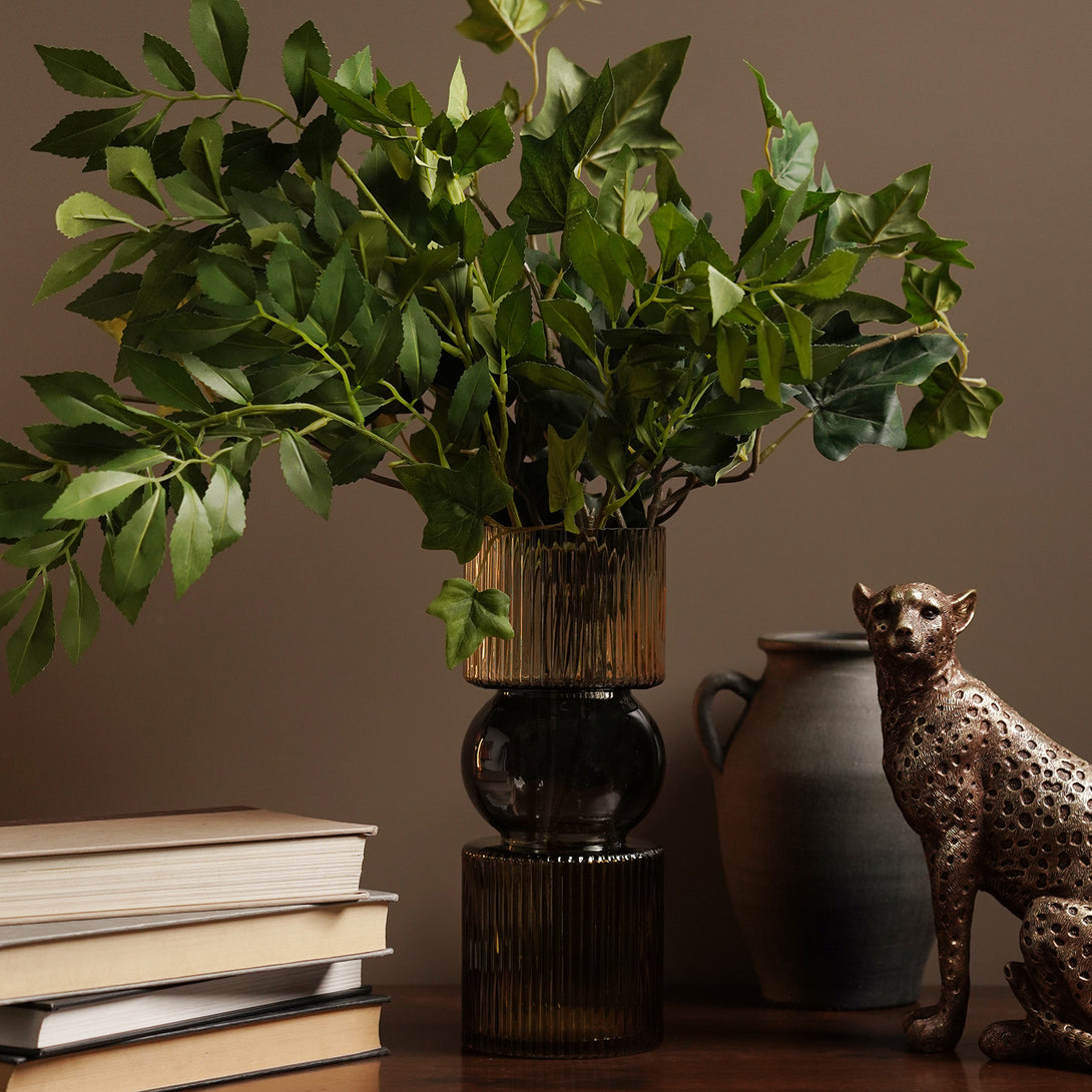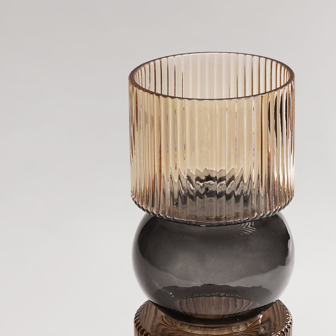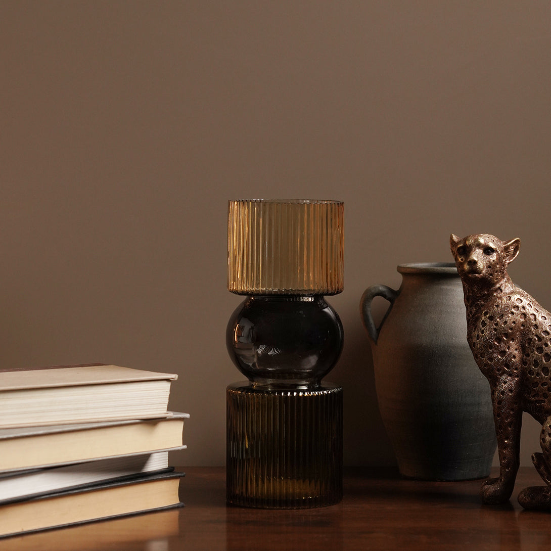Add contemporary elegance to your space with this ribbed glass vase, featuring layered amber and smoky hues for a luxe vibe. Its sculptural geometric design makes it perfect as a modern statement piece or chic floral holder.