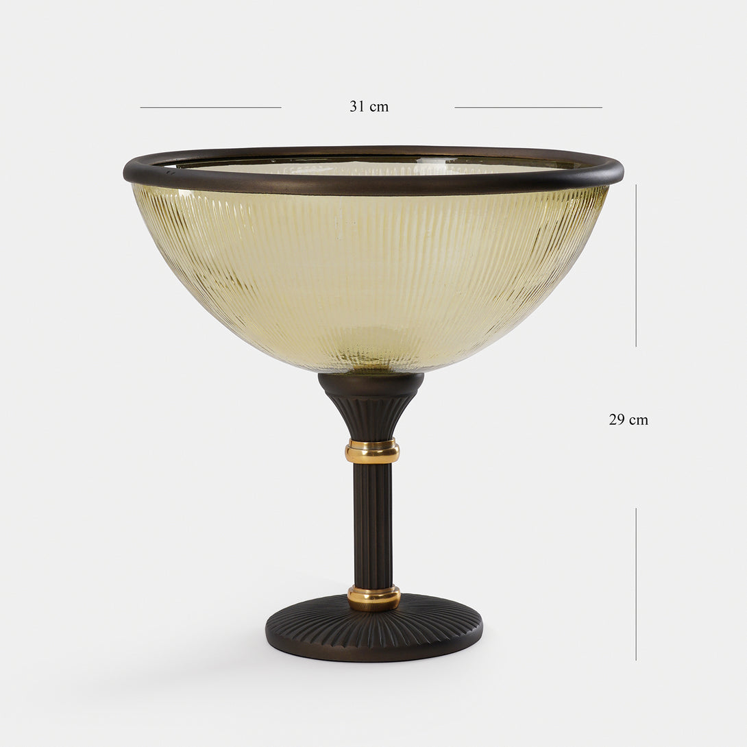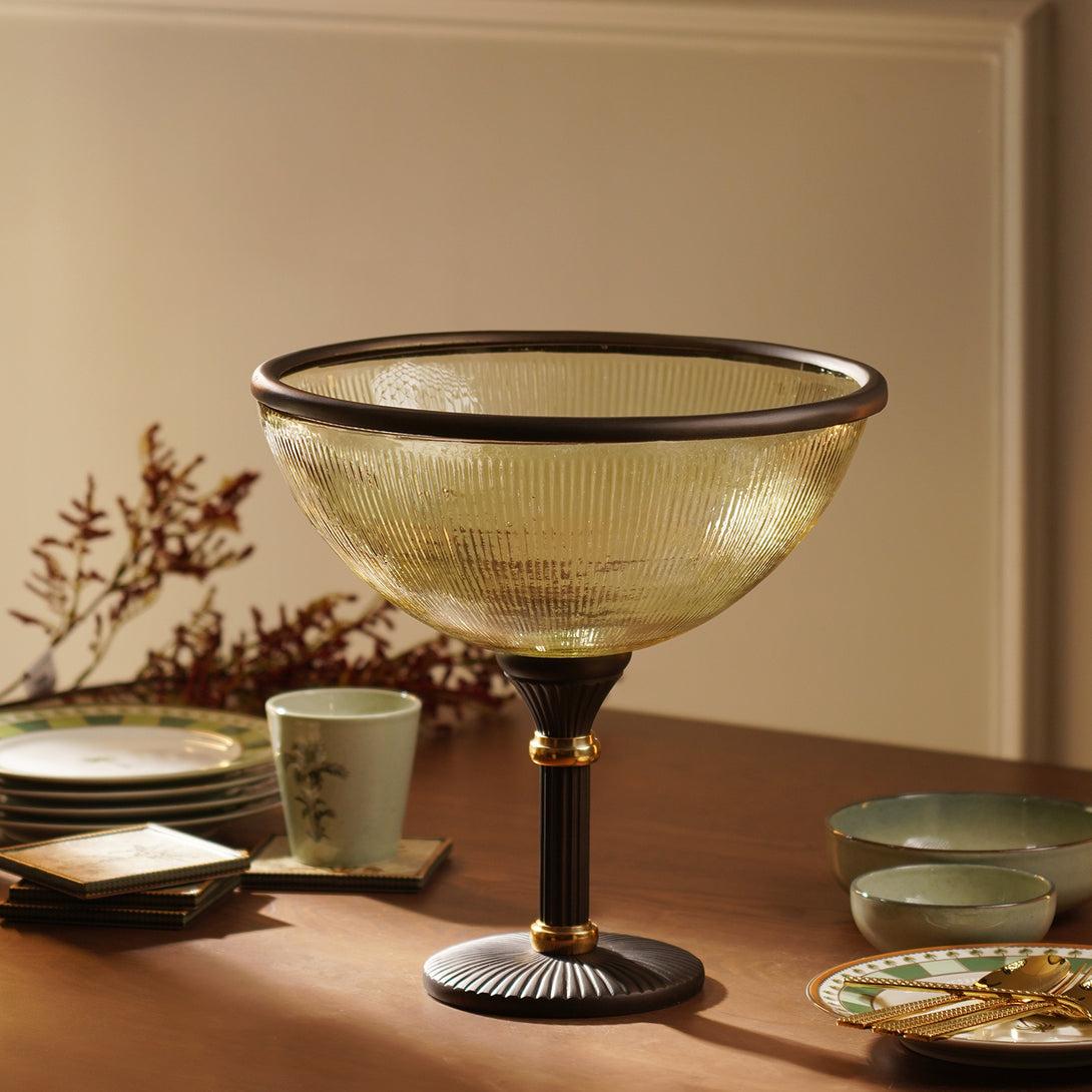 This amber glass decorative bowl with a stand features an antique finish with a striking centrepiece that blends elegance and functionality for dining or living spaces.
