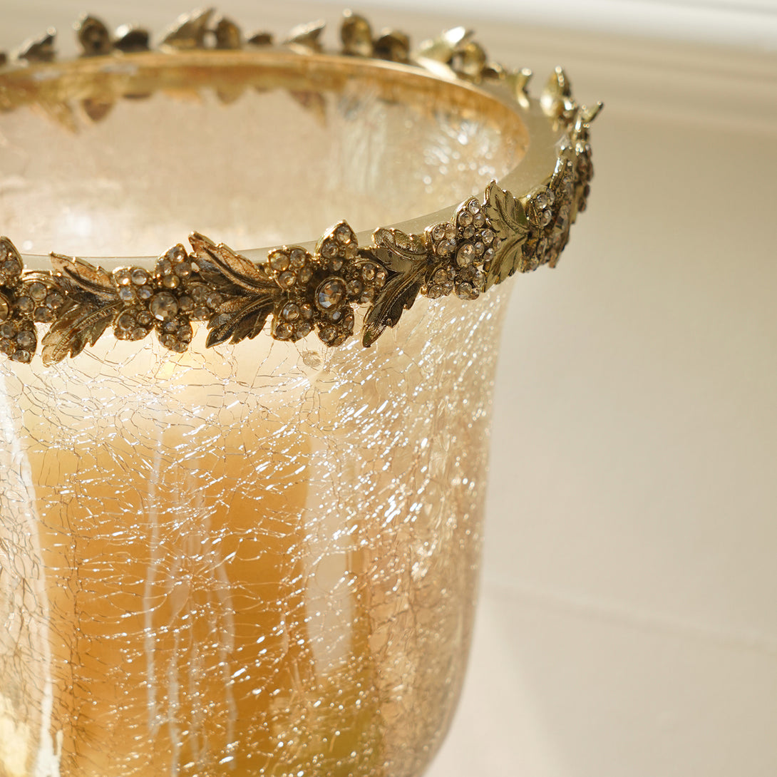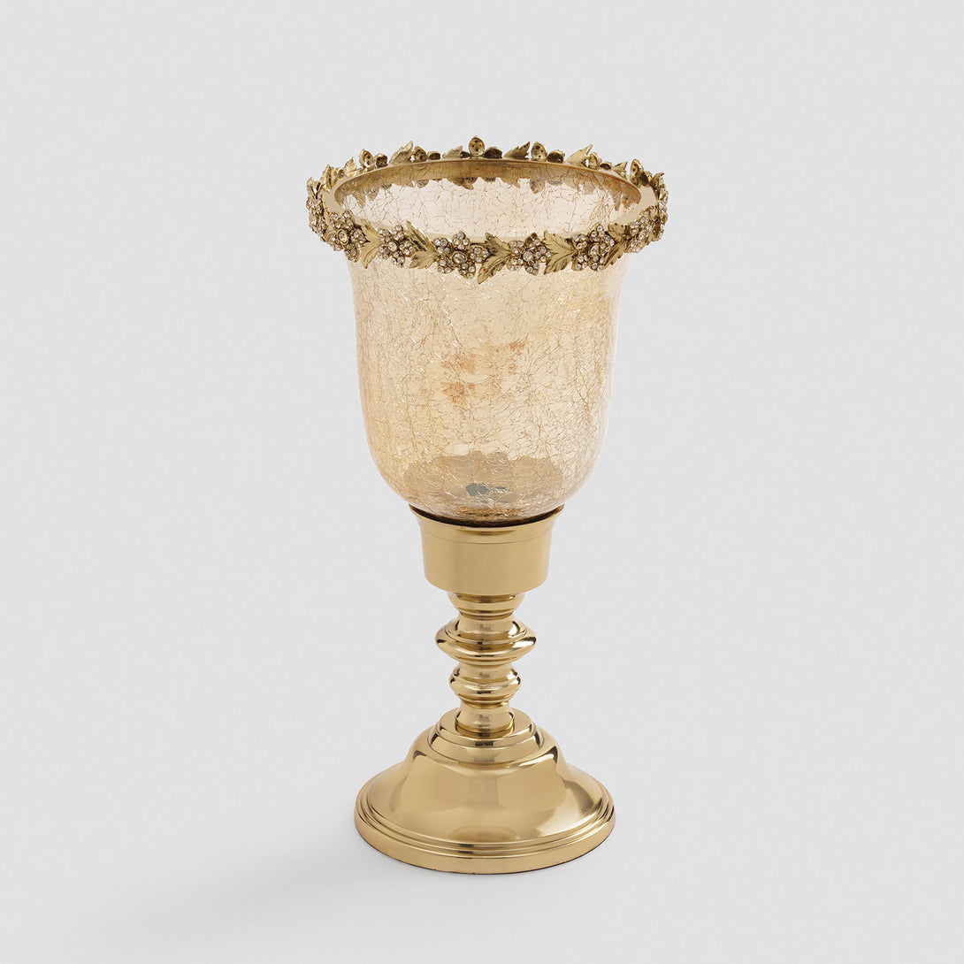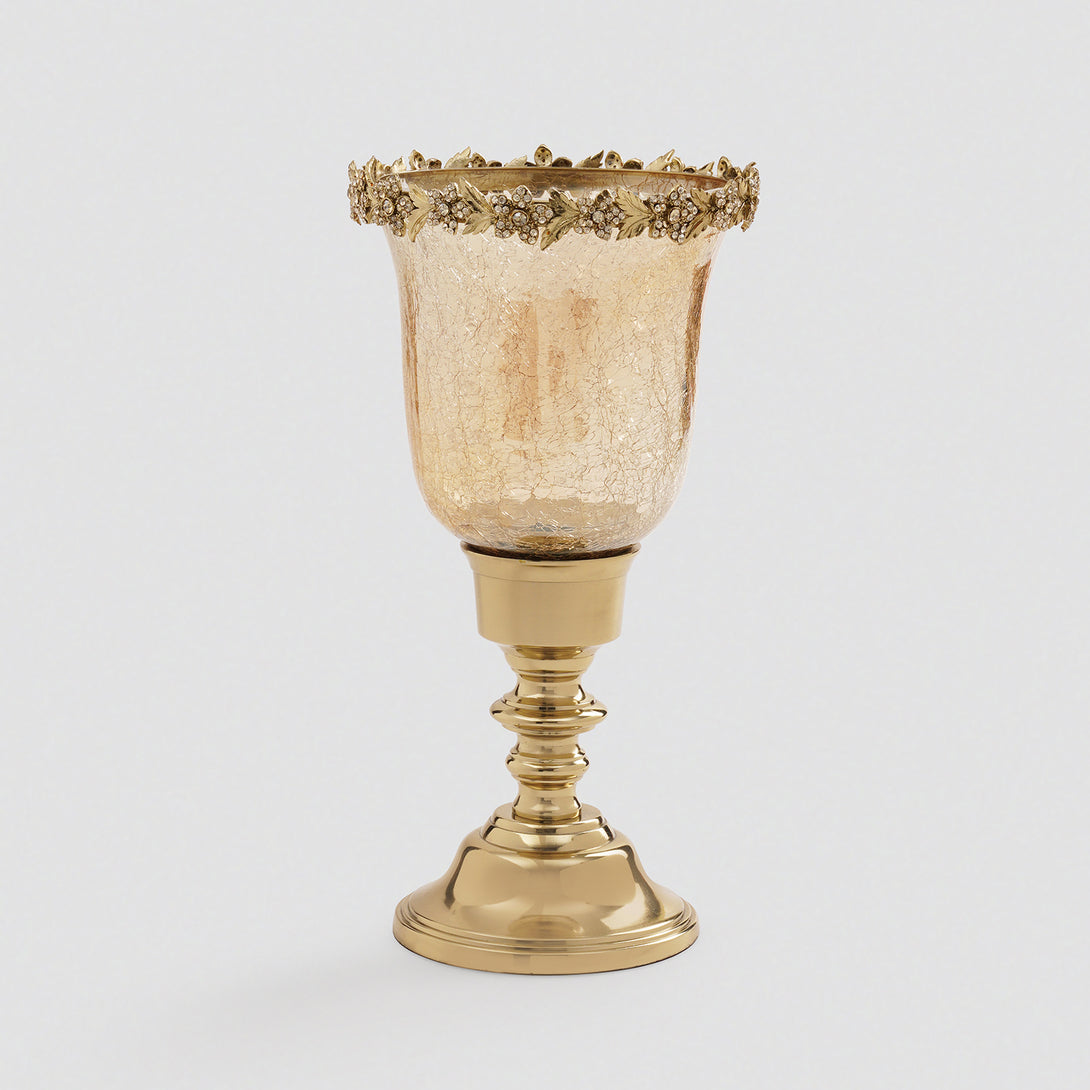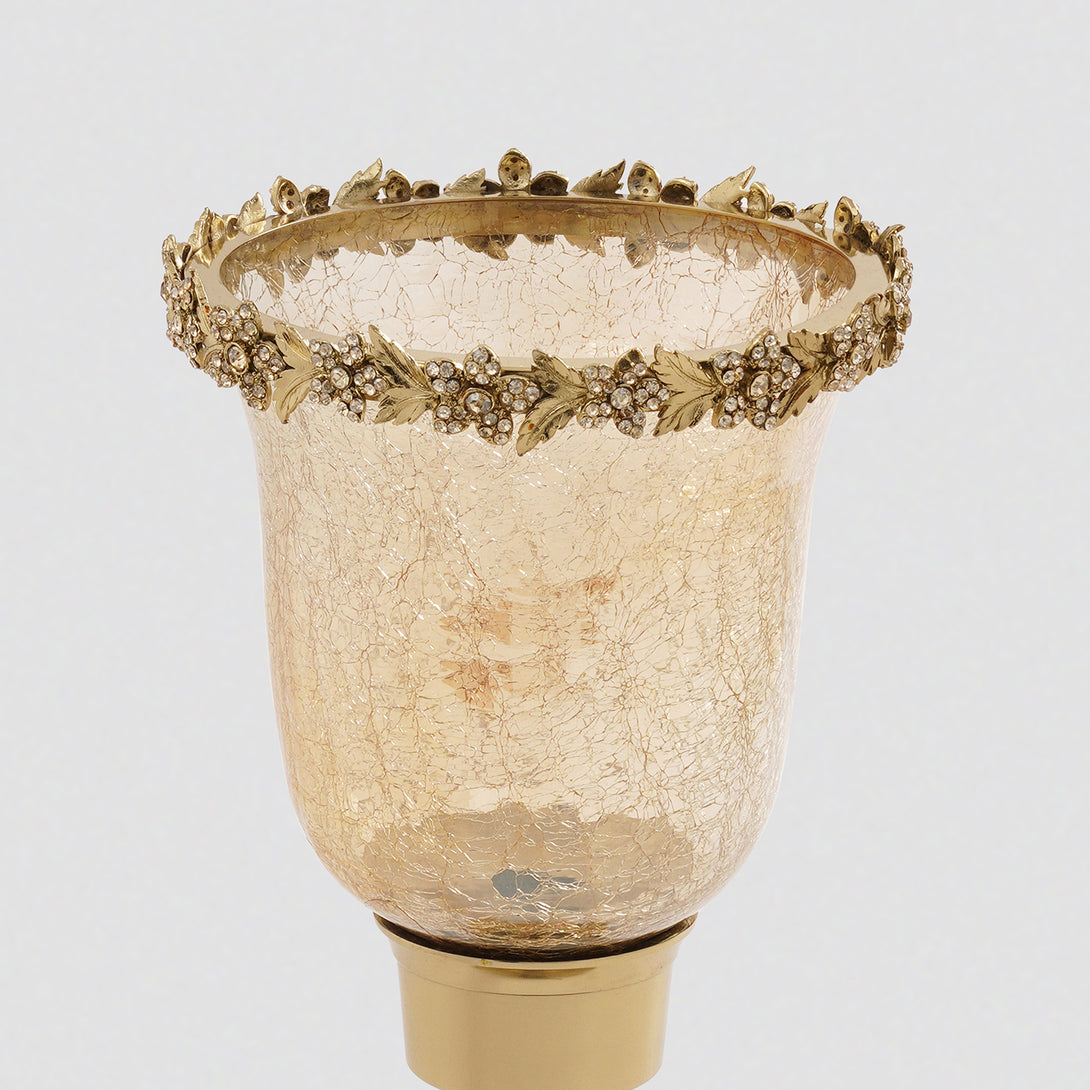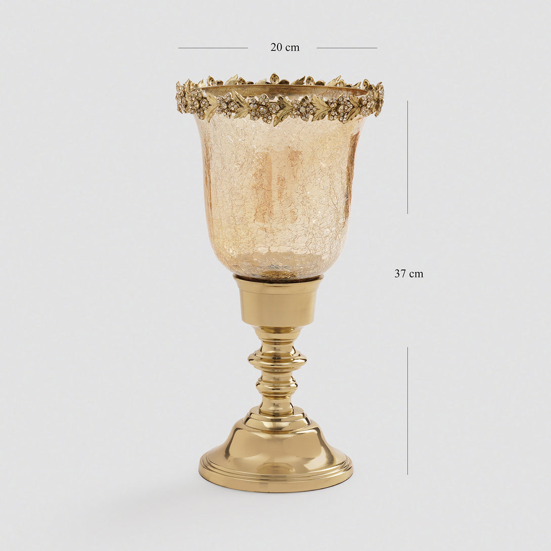This tall, regal candle holder features a crackle-finish glass shade adorned with a decorative floral rim, resting on a polished golden pedestal stand. It radiates grandeur and warmth, ideal for luxe interiors, festive occasions, or as a striking centerpiece.