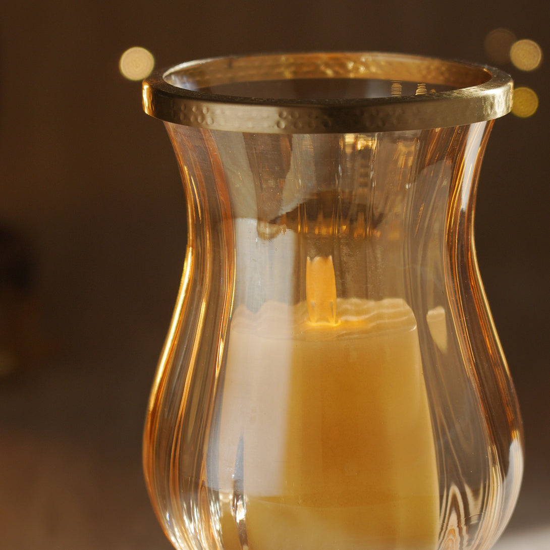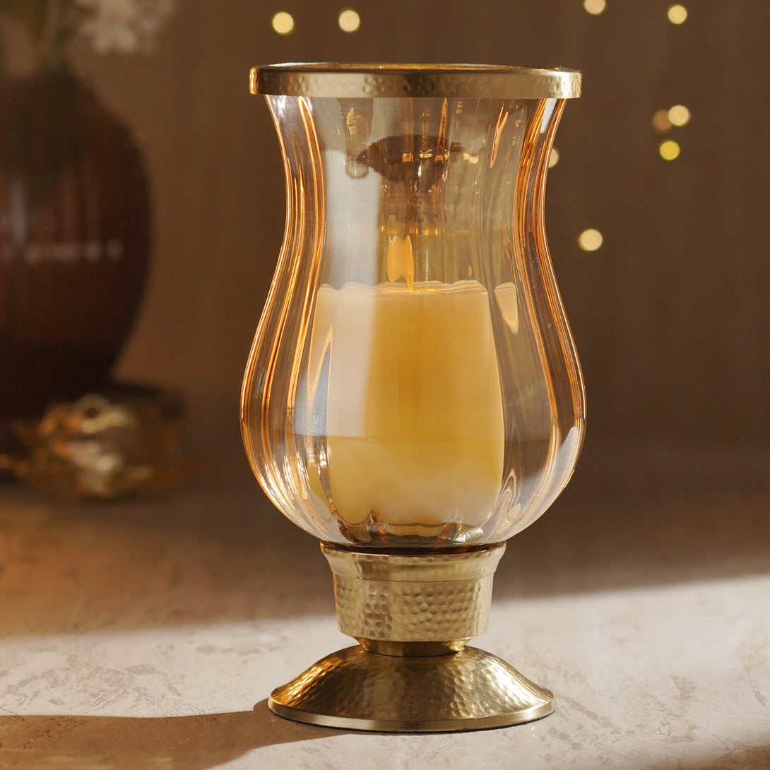 This fluted glass hurricane with a hammered gold-finish rim and base is perfect to house a pillar candle. It creates a warm, ambient glow, perfect for elevating table settings or adding charm to cozy corners.