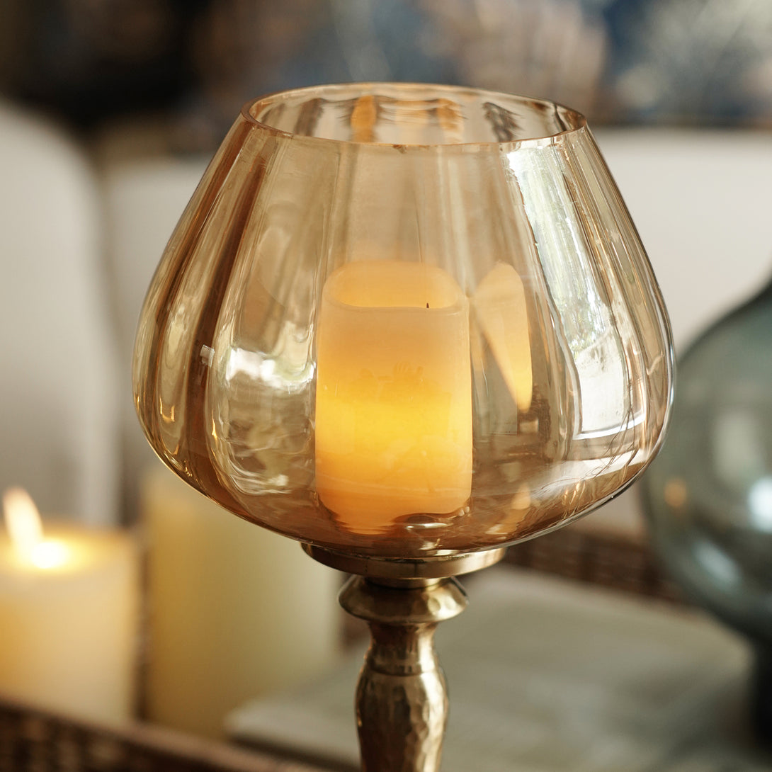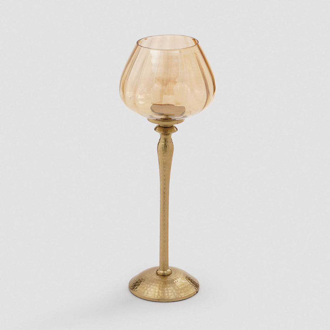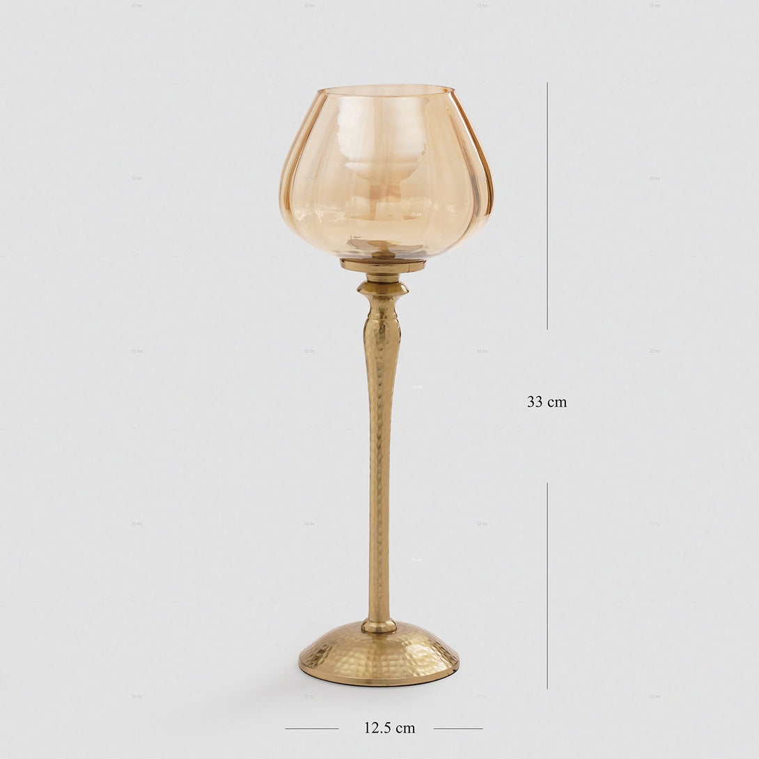 This stem features a hammered gold-finish stem and base, topped with a rounded amber glass cup that houses a candle. It exudes sophistication, making it ideal for formal dining setups, festive dĂŠcor, or as an elegant accent in living spaces.