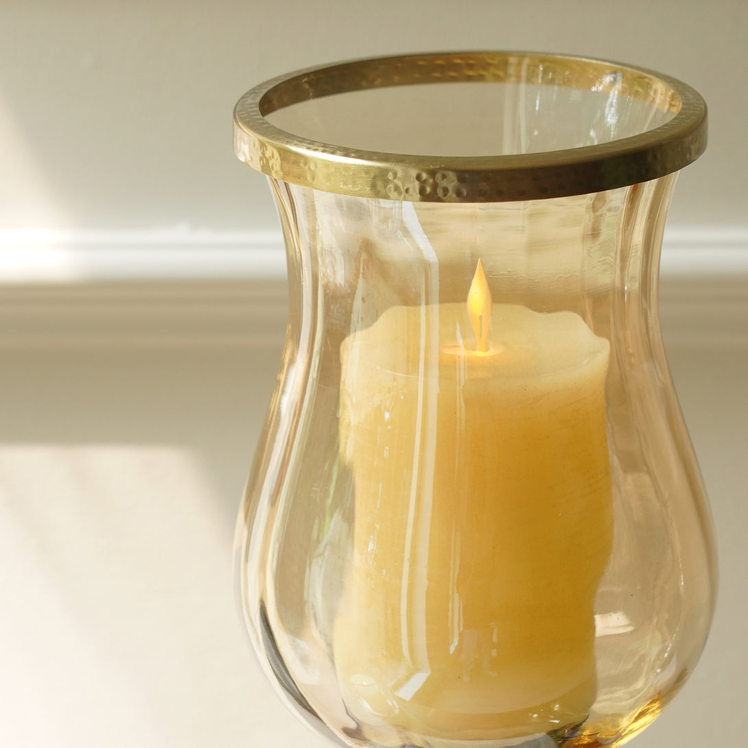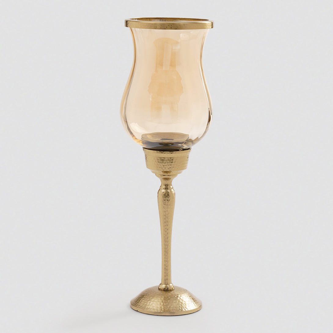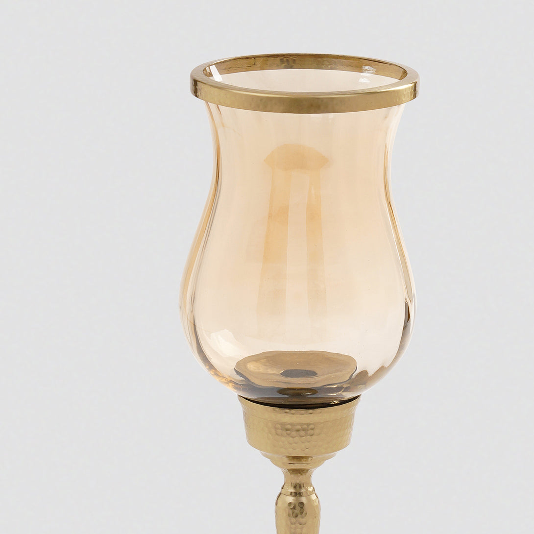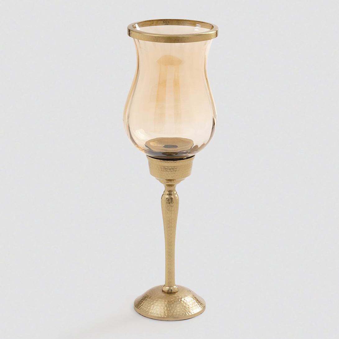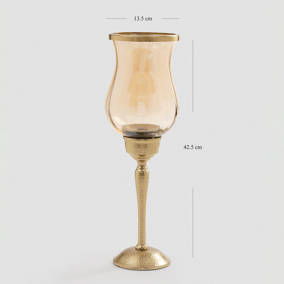 It is designed with a fluted glass shade rimmed in gold, set on a hammered golden pedestal stem. It beautifully diffuses candlelight, making it perfect for creating a warm, elegant glow in dining rooms, living areas, or festive setups.