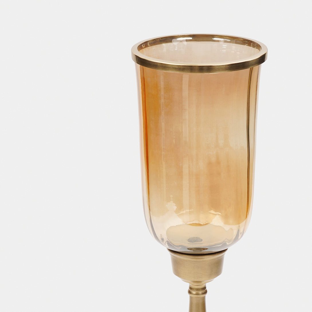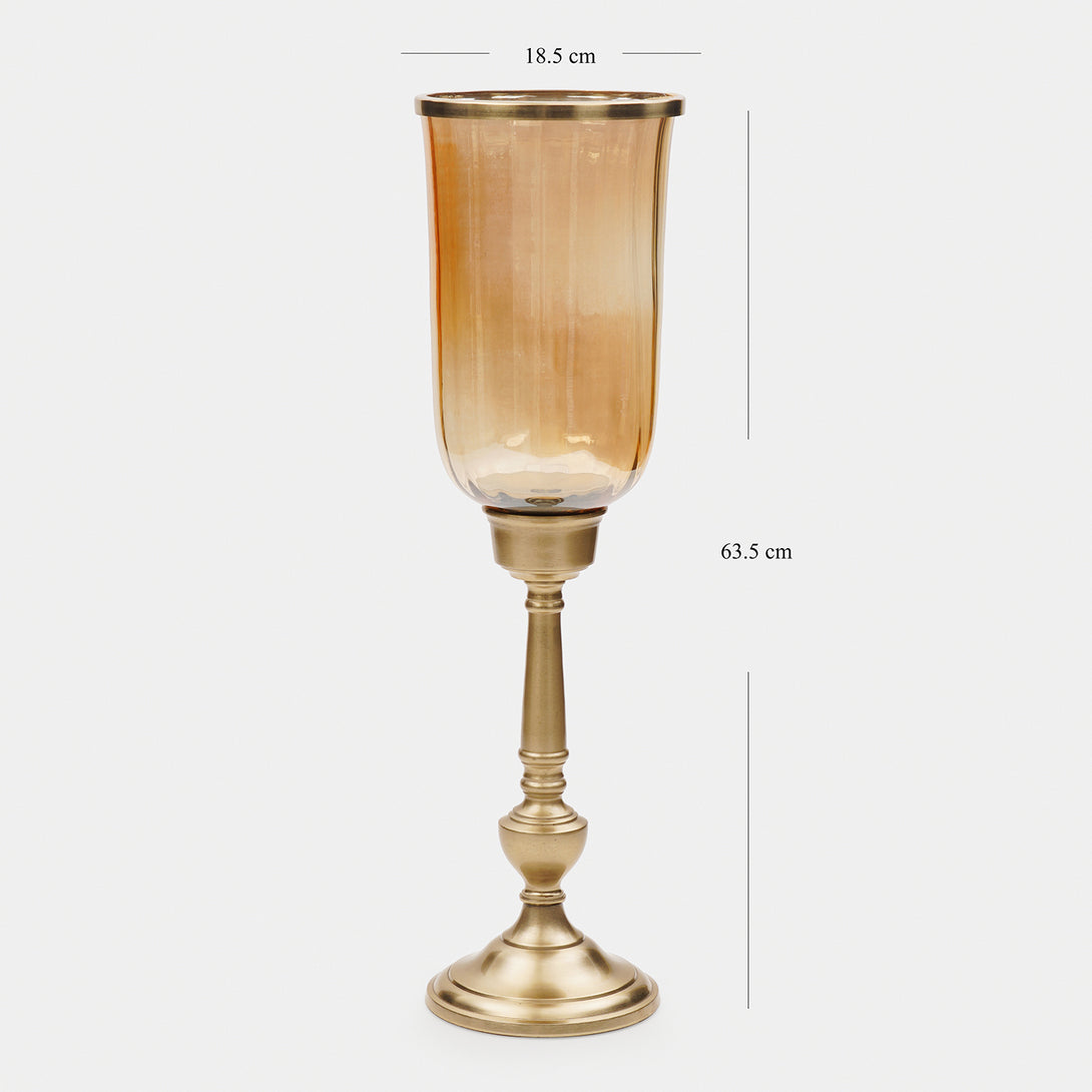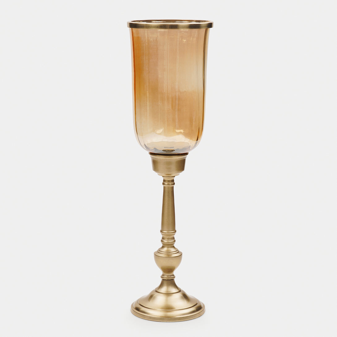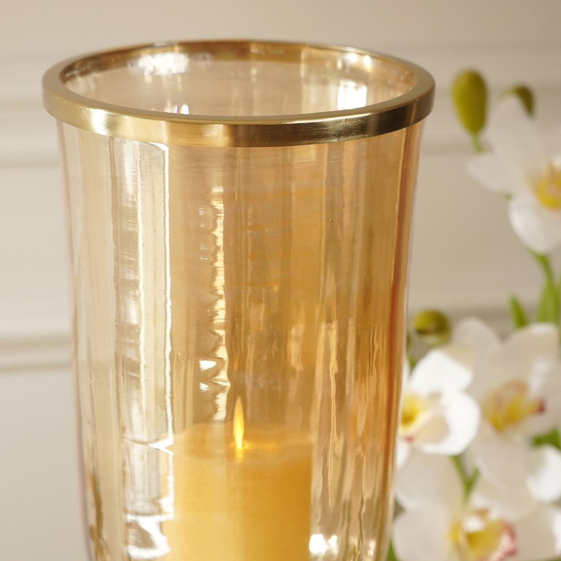Elevate your space with this tall glass hurricane candle holder, featuring a warm golden glow and an elegant metallic base. Perfect for creating a cozy, sophisticated ambiance in any room.