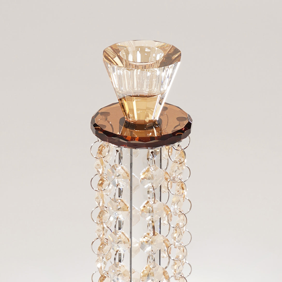 Enhance your table setting with this elegant crystal taper candle holder, featuring cascading amber-hued crystal strands.Â