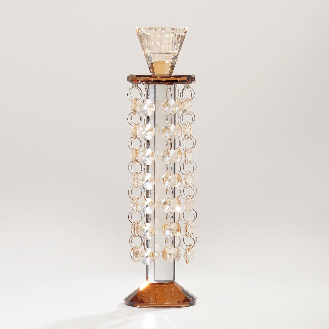 Amber Glass Tapered Candle Holder With Hanging Crystals