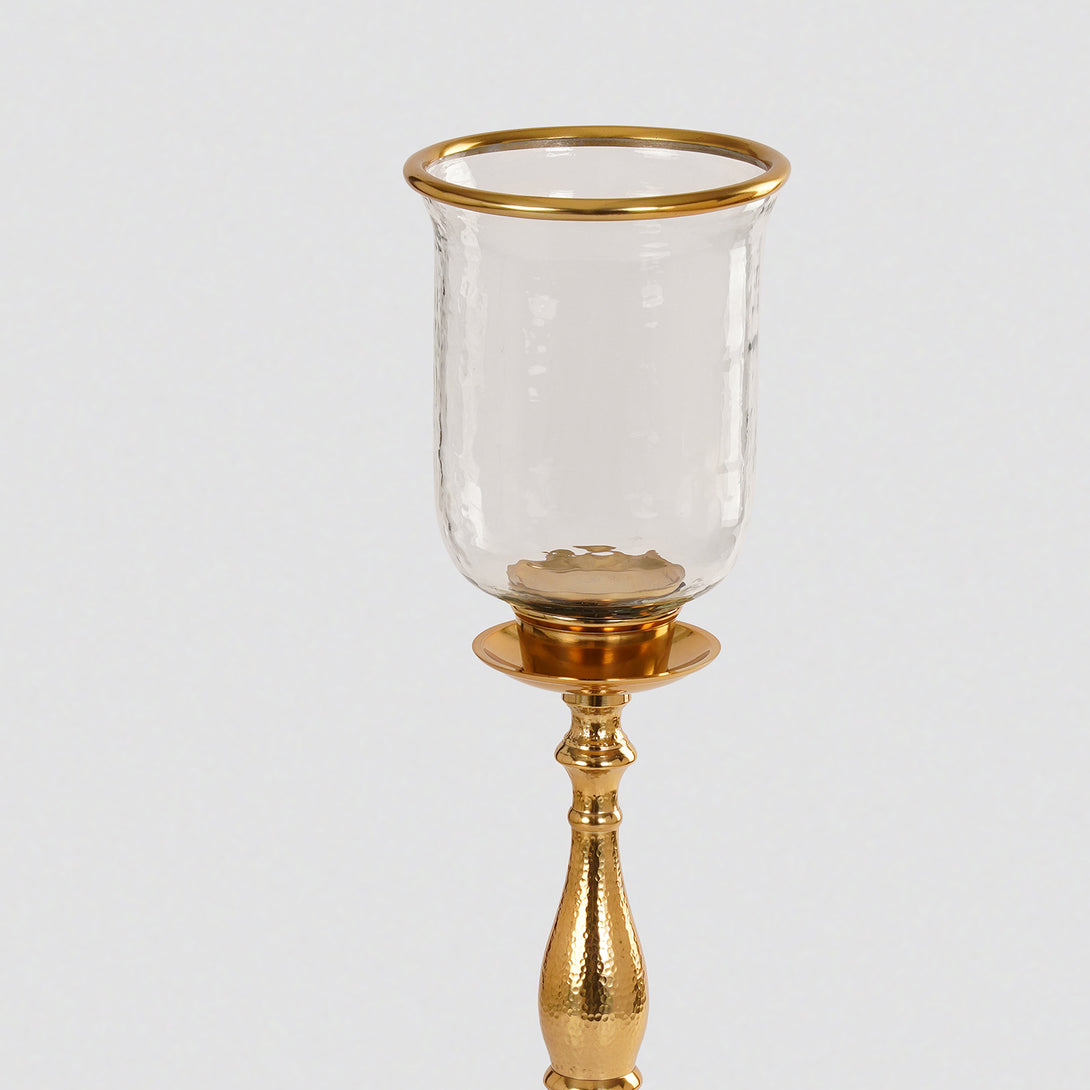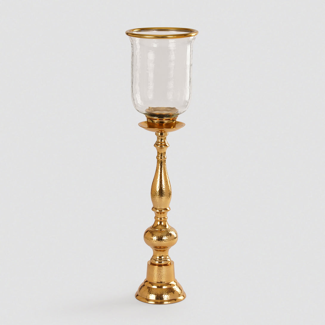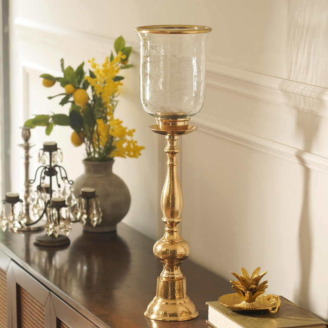 This hammered gold hurricane pairs a textured metallic base with a clear glass top for an elegant finish. Designed to enhance ambient lighting, it beautifully combines timeless craftsmanship with modern sophistication.