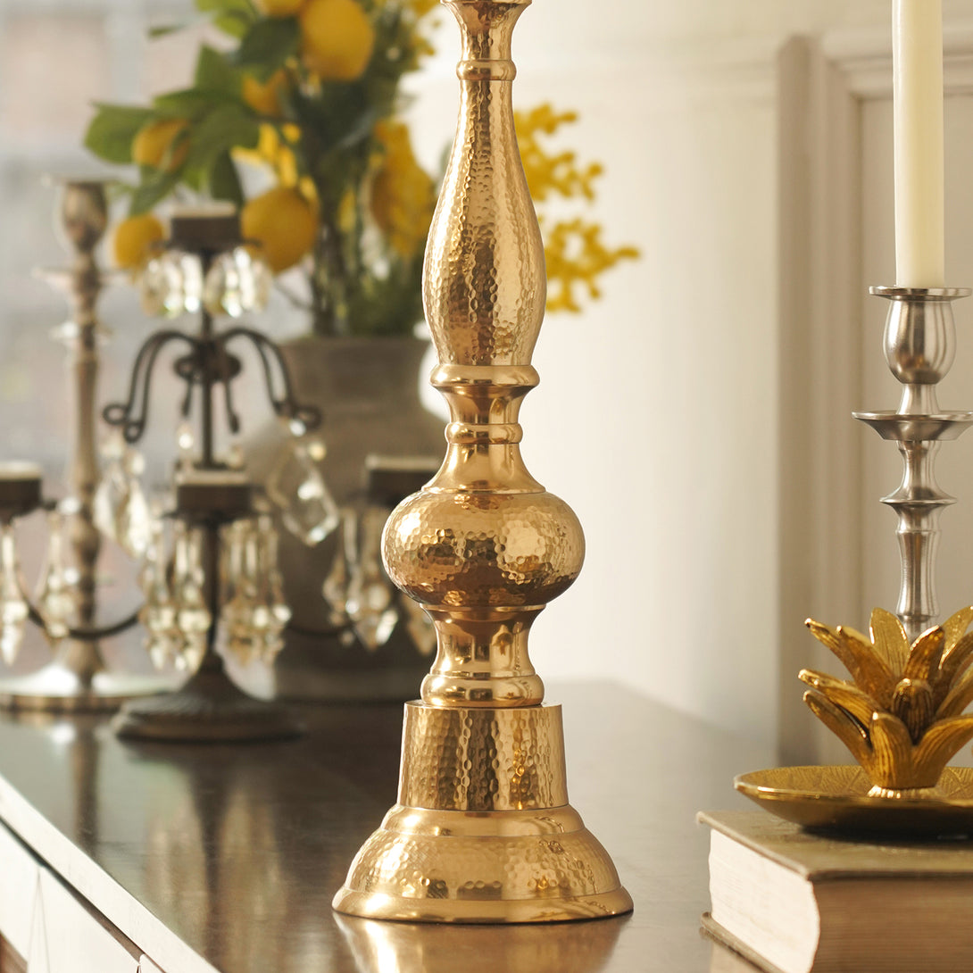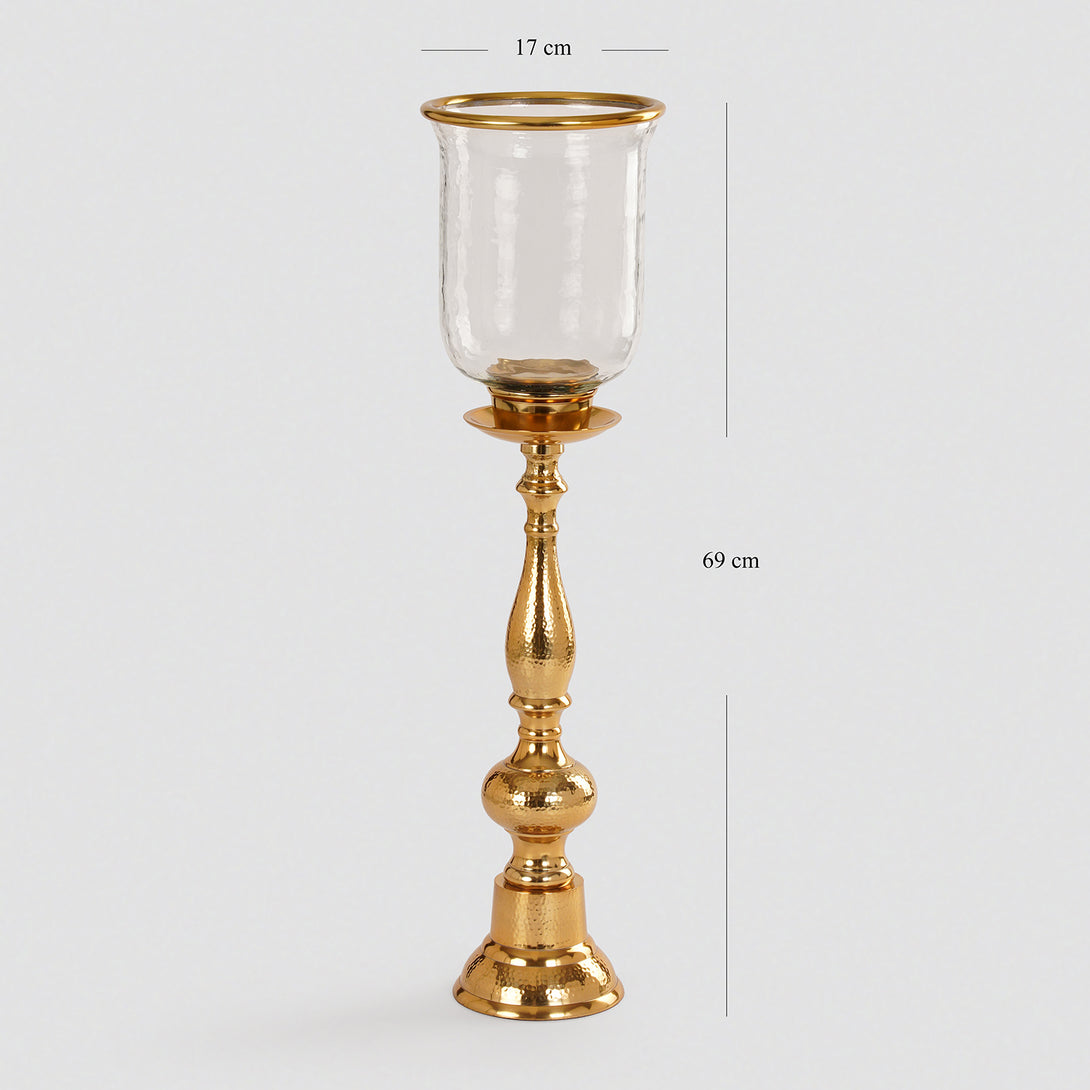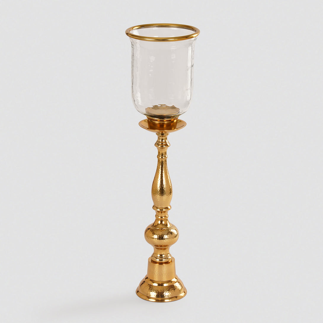 This hammered gold hurricane pairs a textured metallic base with a clear glass top for an elegant finish. Designed to enhance ambient lighting, it beautifully combines timeless craftsmanship with modern sophistication.