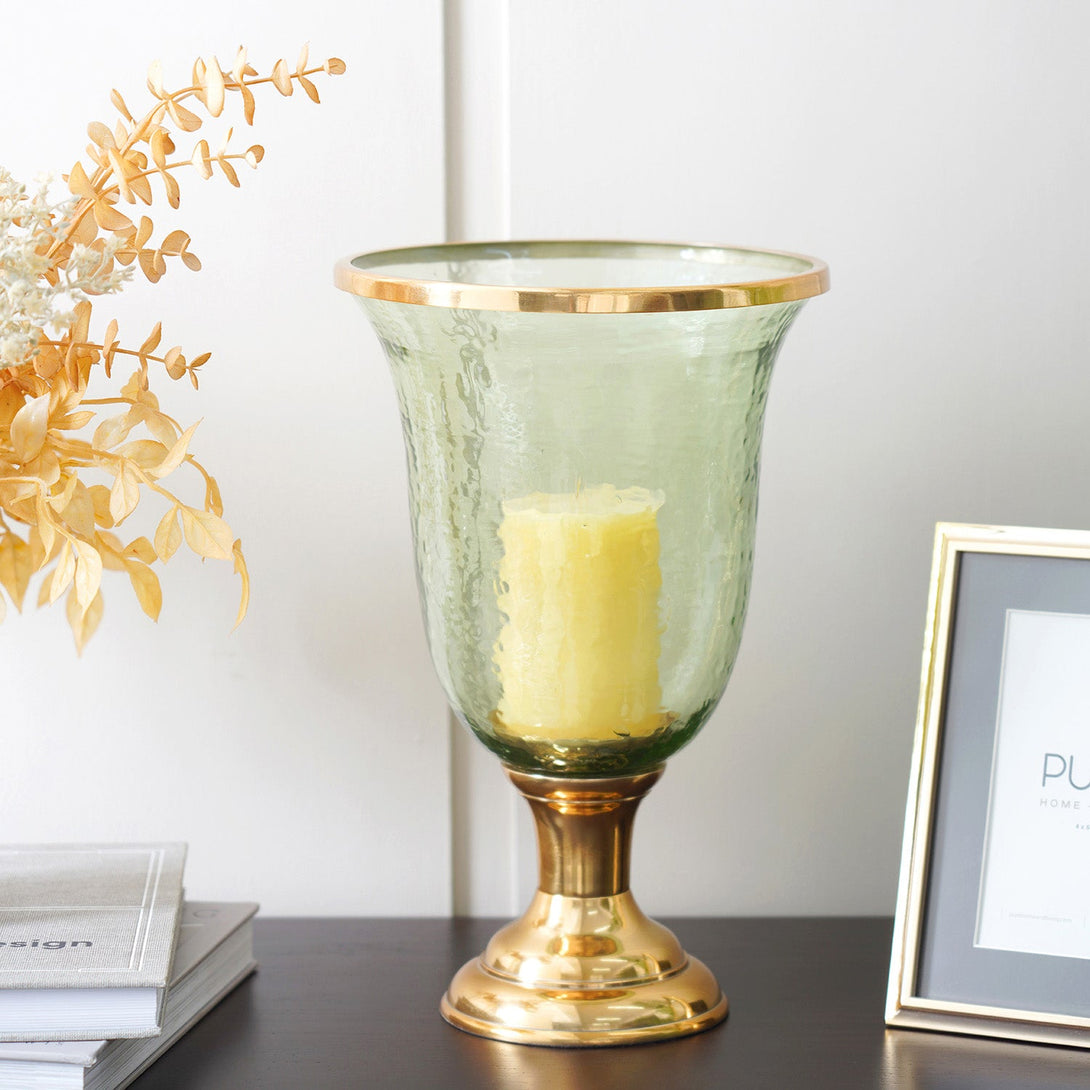 A fine gold rim sits atop the edge of the large glass body of the Angel hurricane. Supported by an elegant, metal base, this piece is ideal to house your large candles, bouquets or by itself. Place this hurricane with dacor of different heights to give your space a layered look.