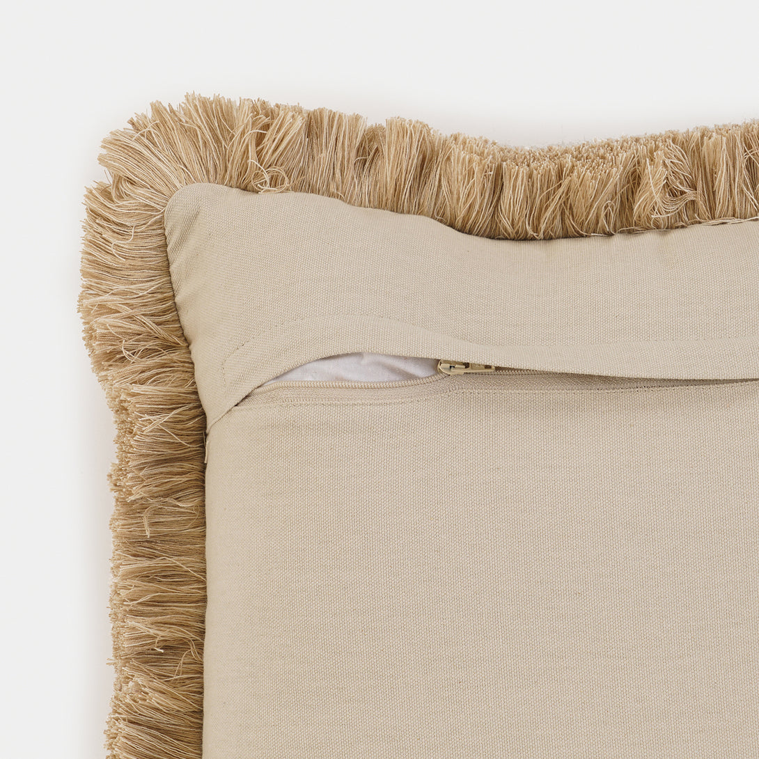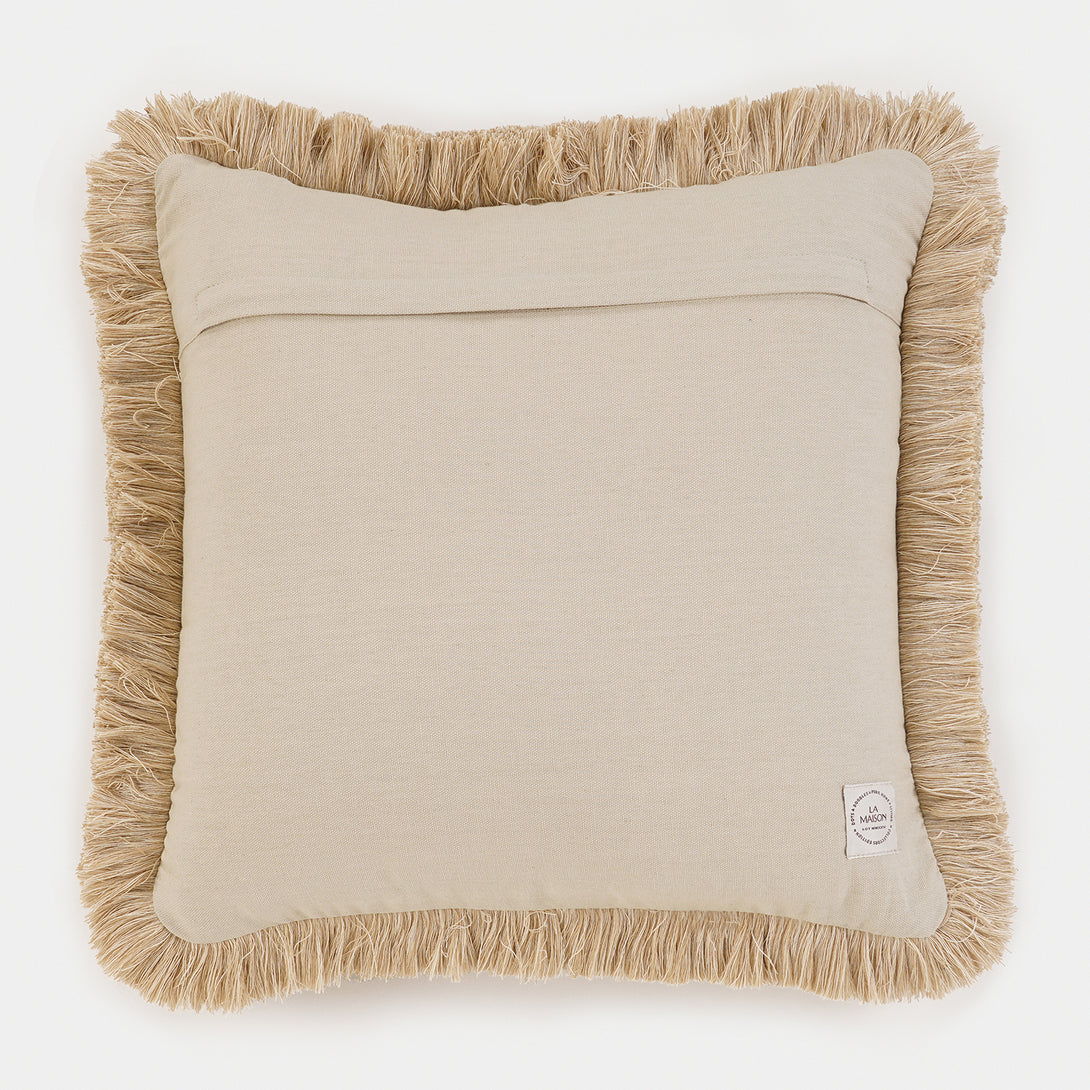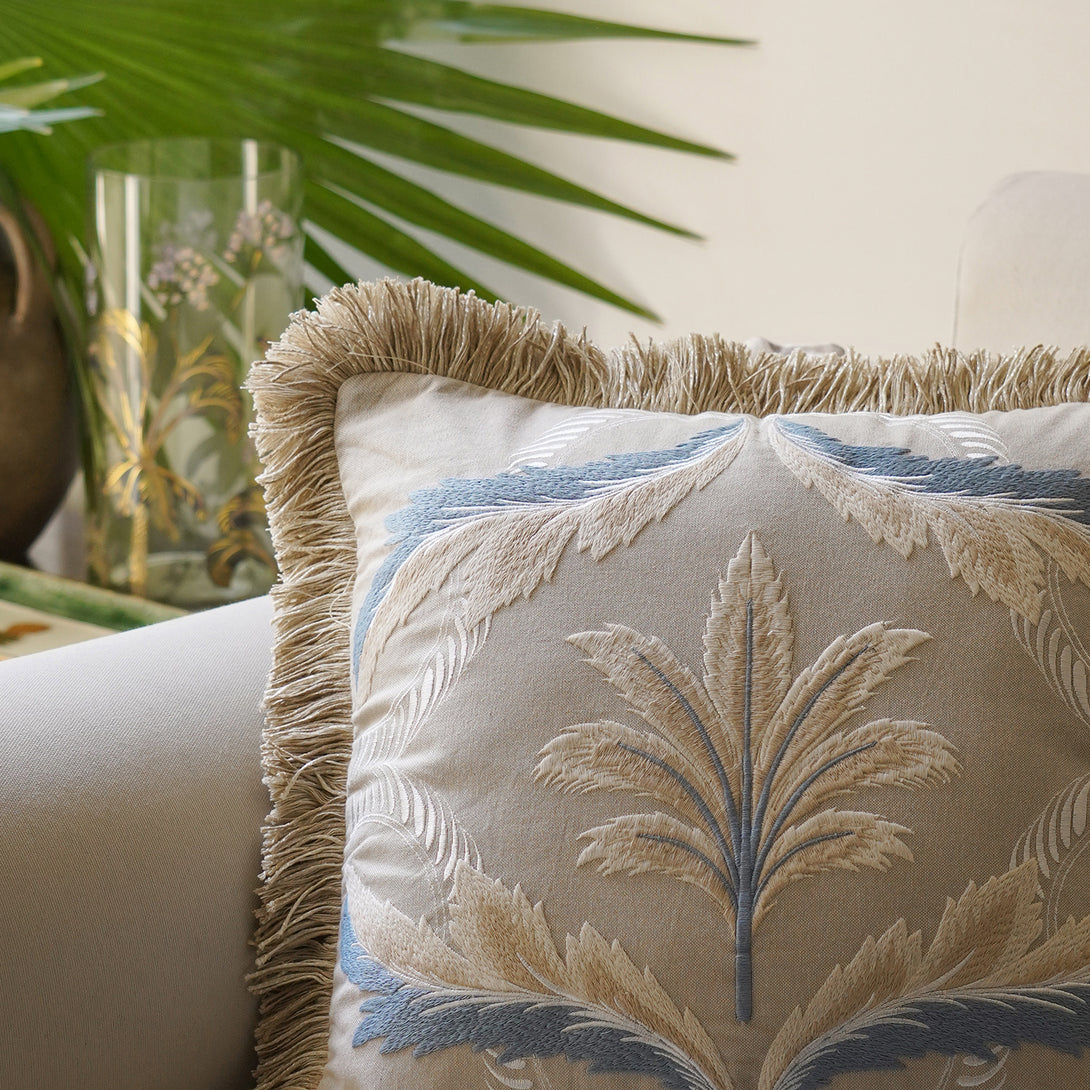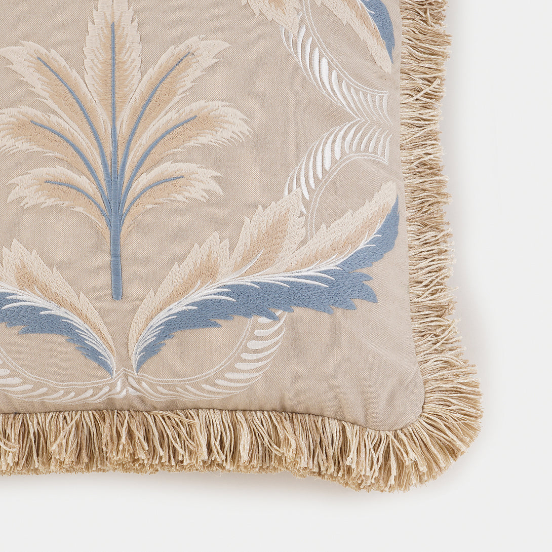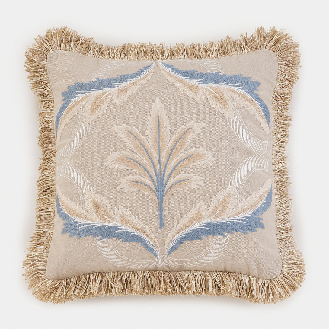 This beige cushion cover showcases elegant embroidery in soft blue and taupe tones, forming a refined botanical motif. Finished with textured fringes, it exudes timeless sophistication and adds a luxurious touch to any interior setting.