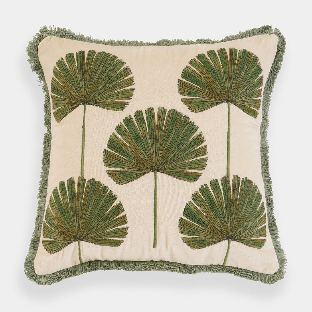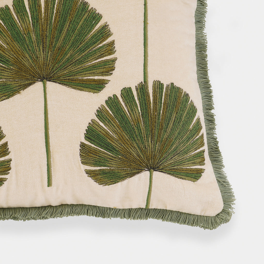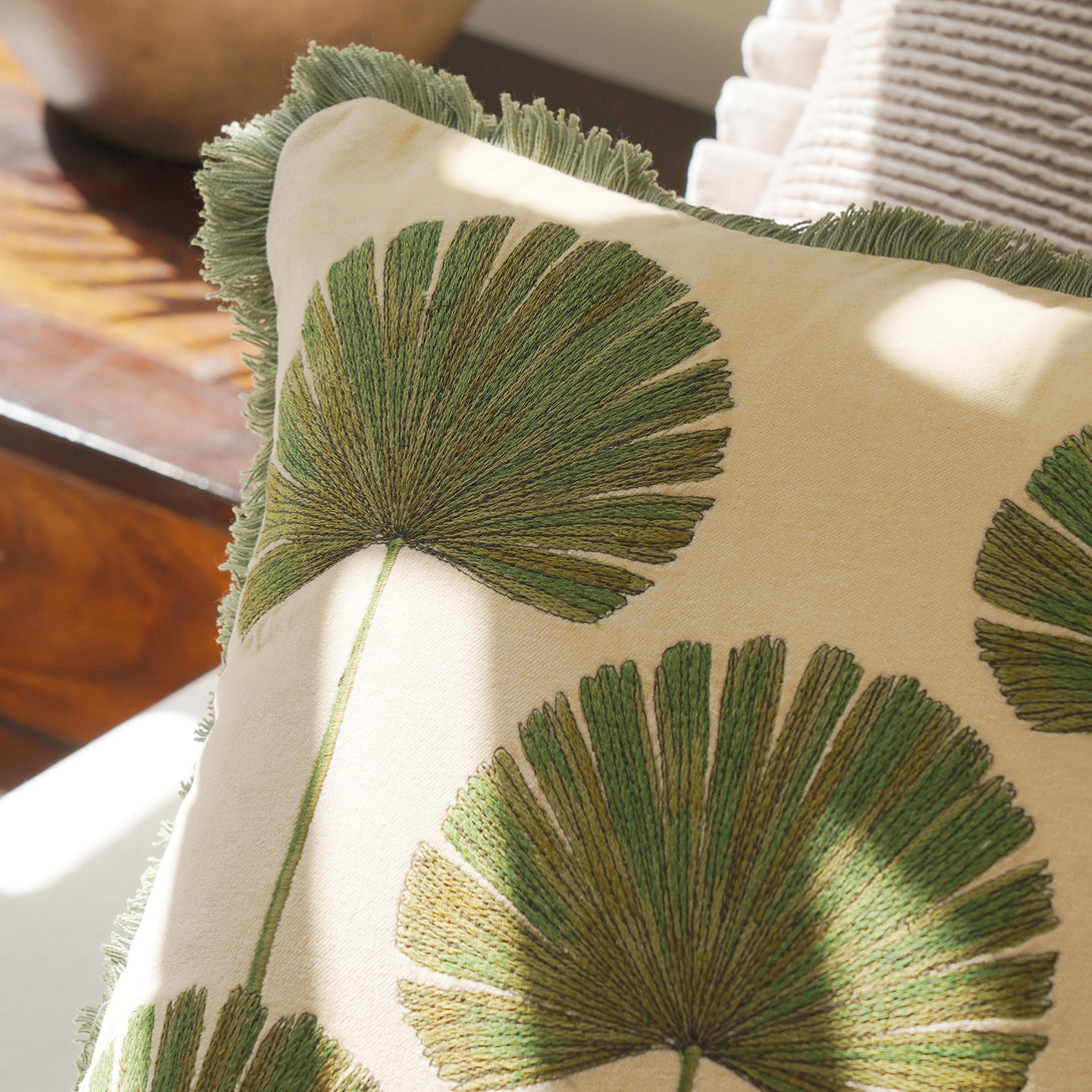 This beige cushion cover features intricate green embroidered palm leaf motifs arranged in a balanced design. The soft velvet texture and green fringed edges lend a refreshing, tropical charm to your decor.