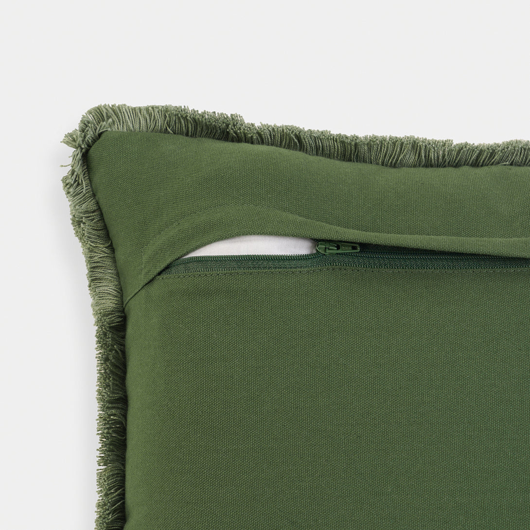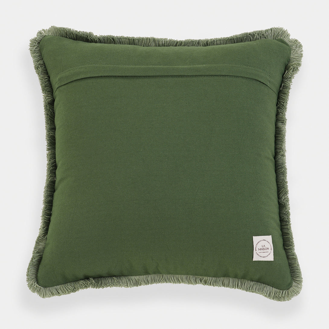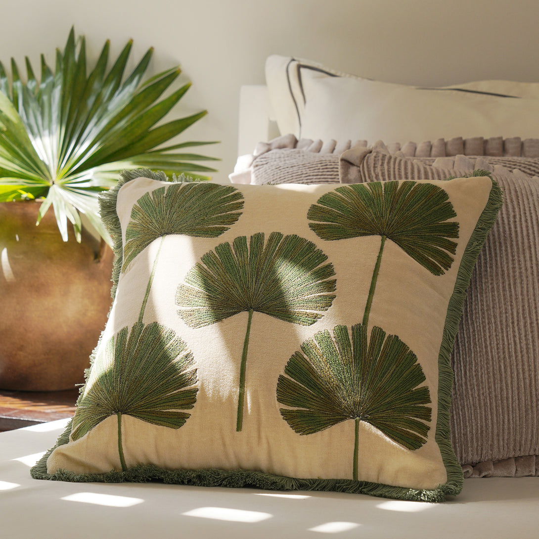 This beige cushion cover features intricate green embroidered palm leaf motifs arranged in a balanced design. The soft velvet texture and green fringed edges lend a refreshing, tropical charm to your decor.