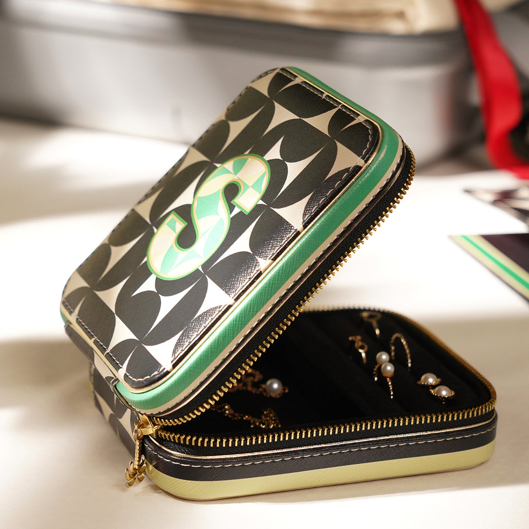 Chic and compact, this black and green 'U' faux leather jewellery box keeps your treasures safe and tangle-free on the go. Its bold design and secure structure make it the perfect companion for stylish, organized travel.