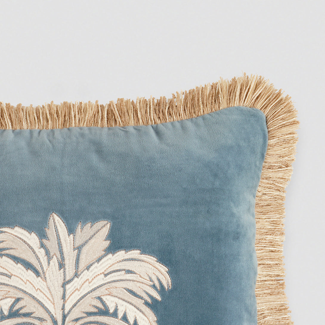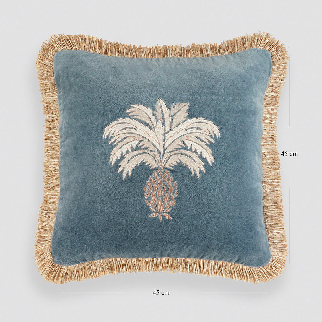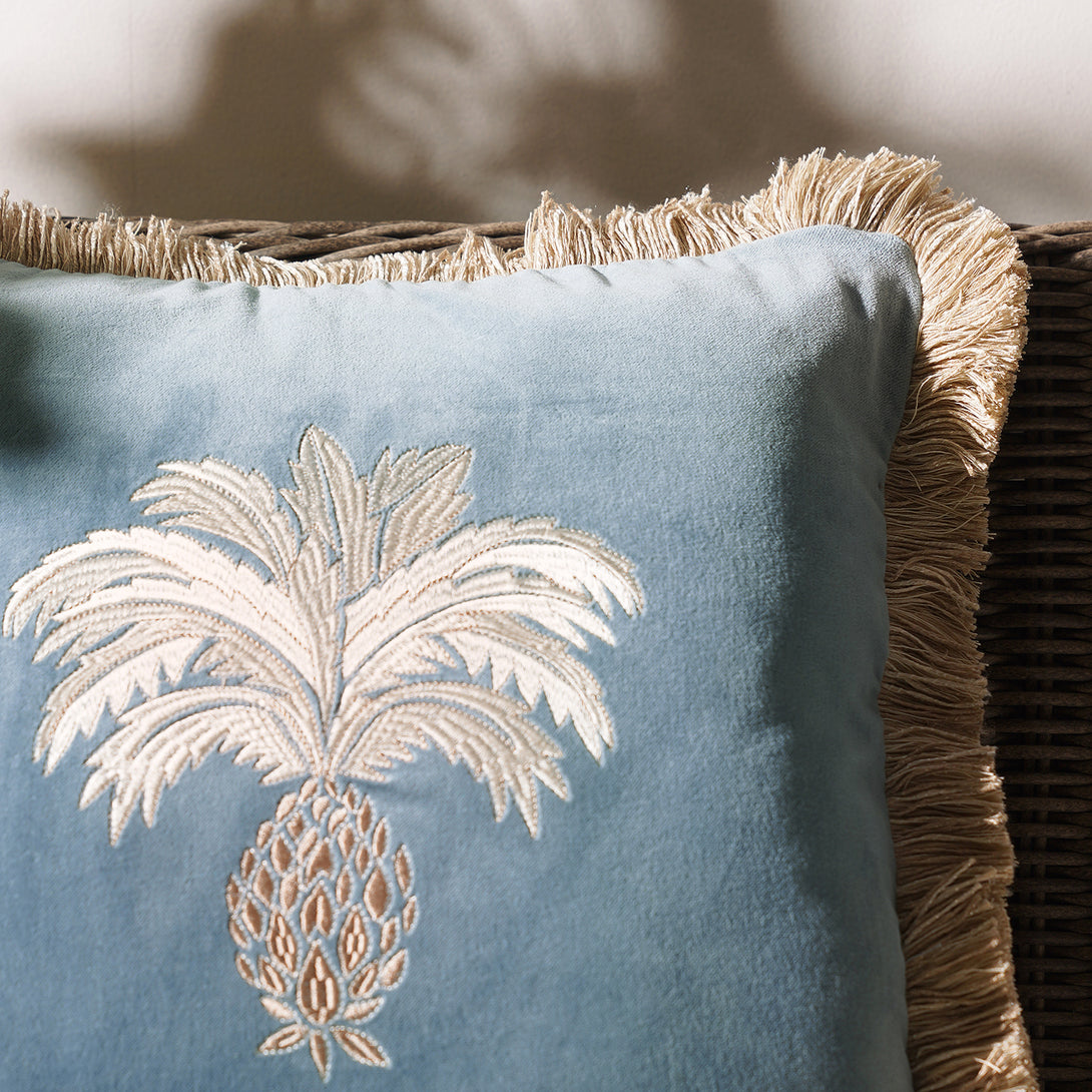 This elegant cushion features intricate pineapple embroidery on a luxe soft blue fabric, framed with plush fringe detail.