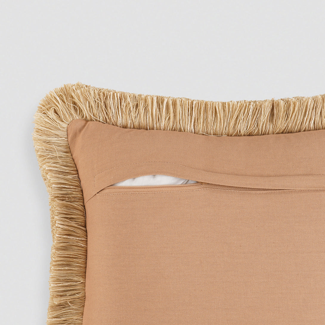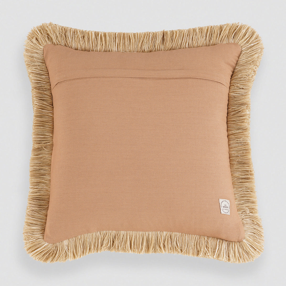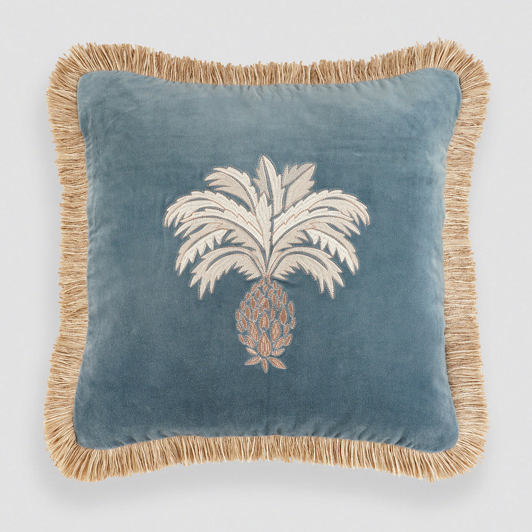 This elegant cushion features intricate pineapple embroidery on a luxe soft blue fabric, framed with plush fringe detail.