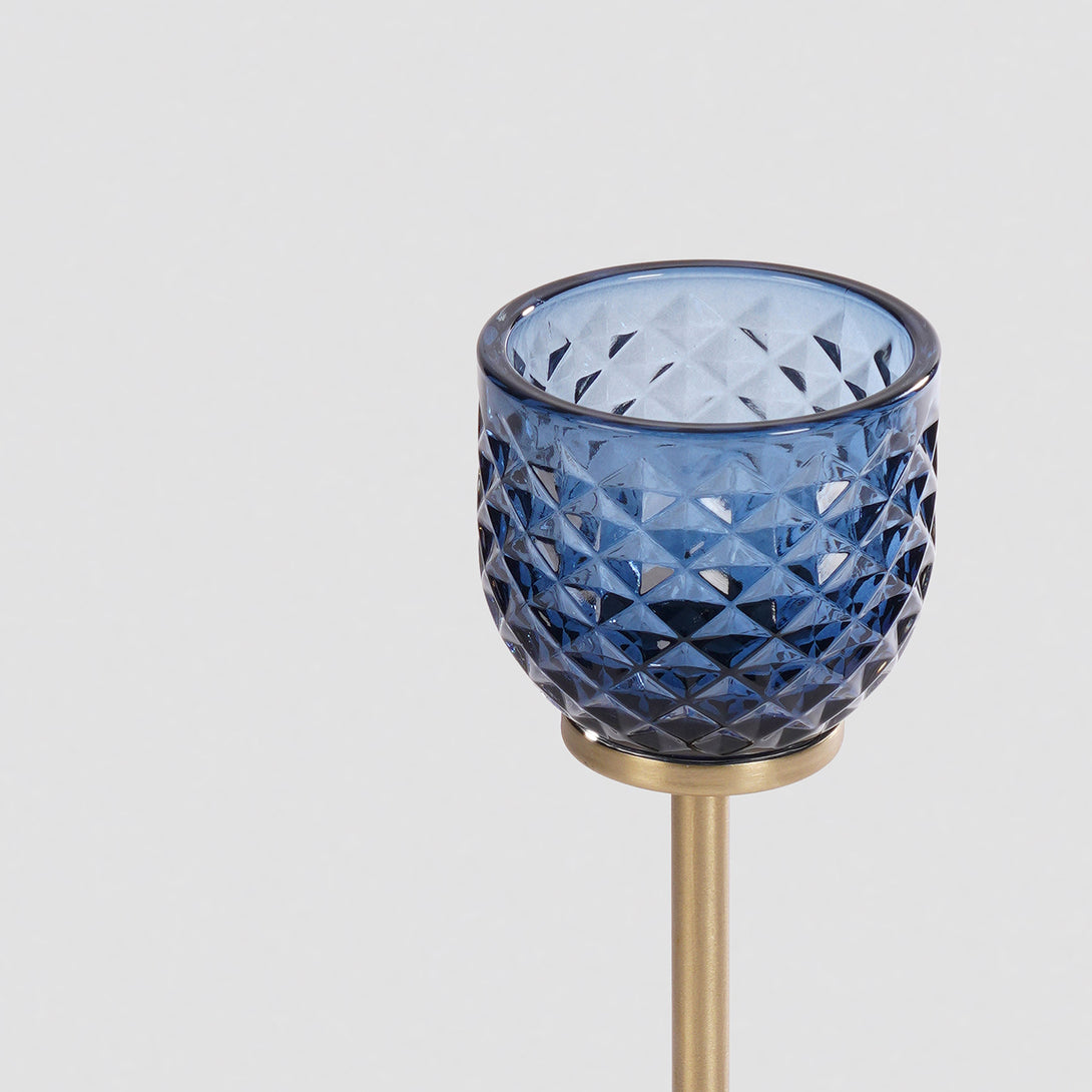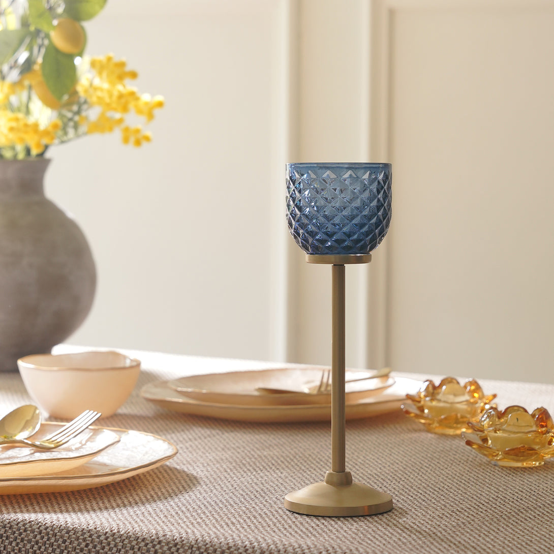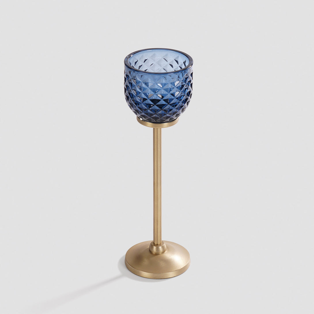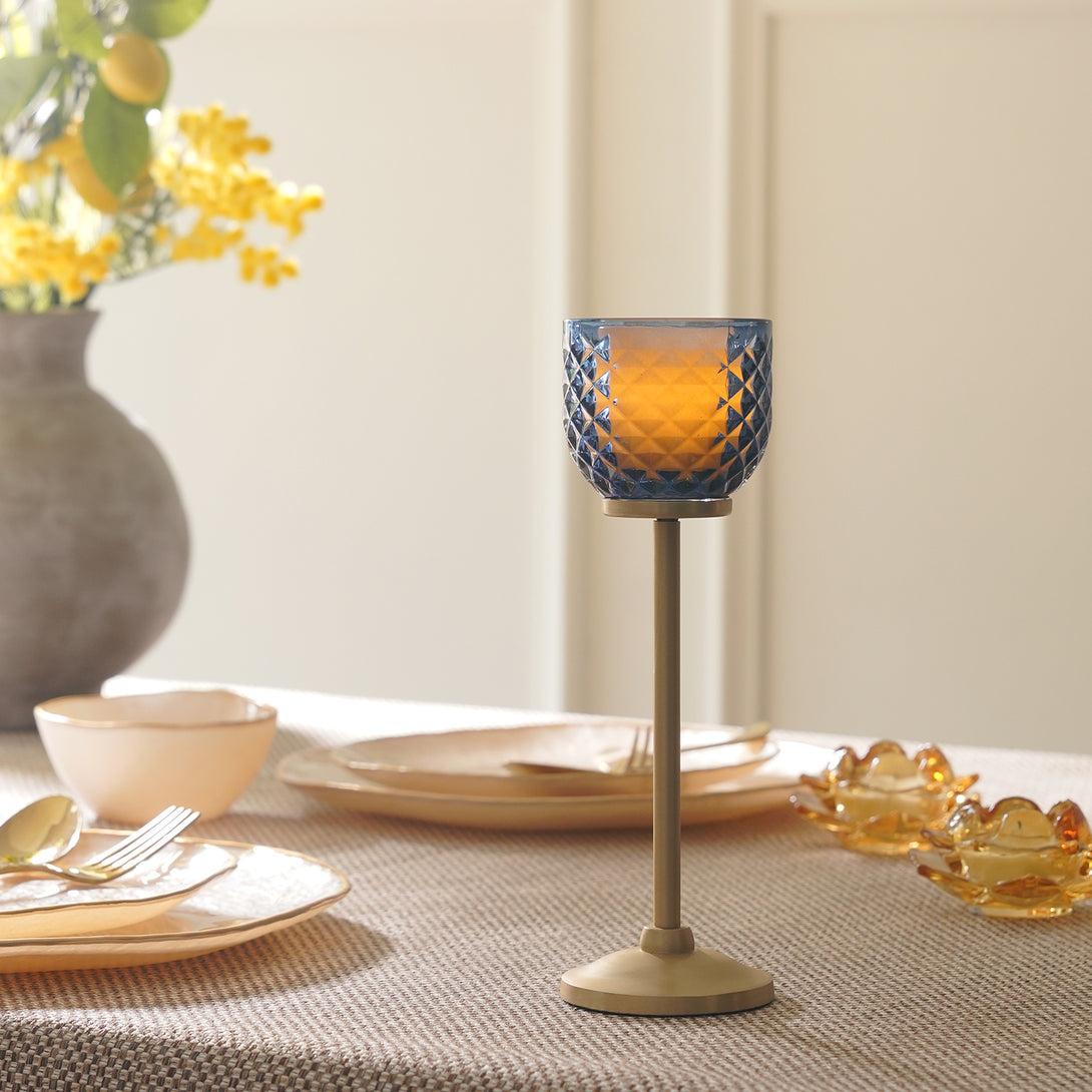 This blue glass votive holder on a tall metallic stand brings a warm, golden glow to any space. Its diamond texture beautifully reflects candlelight, creating a striking play of light and shadow that feels both modern and timeless.