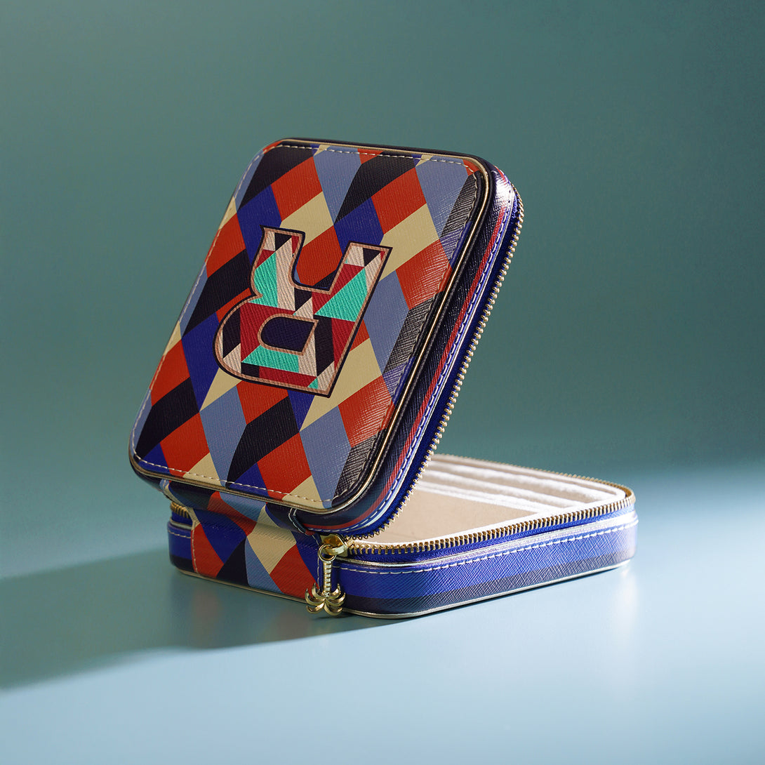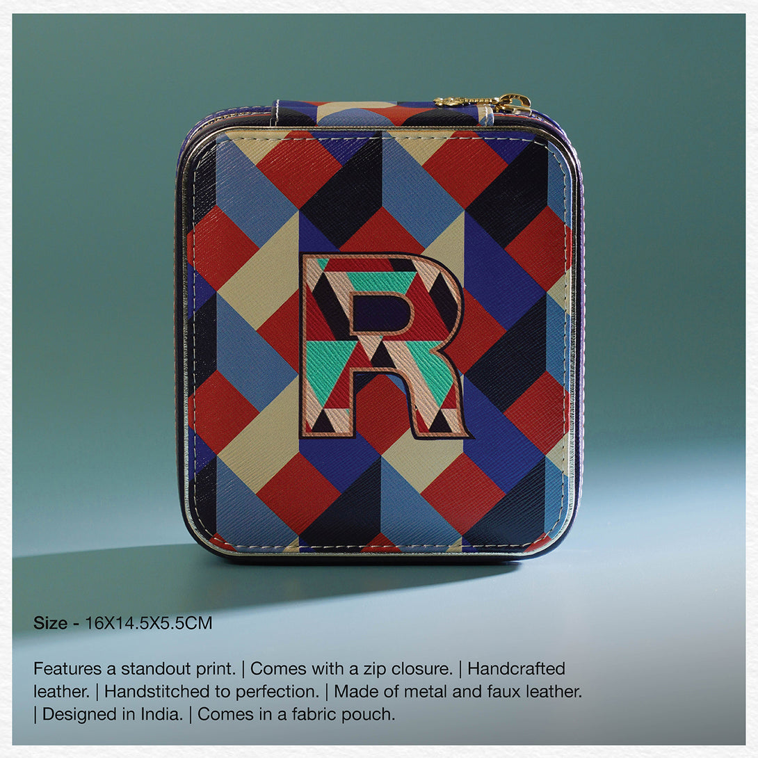 Chic and compact, this blue and peach 'R' faux leather jewellery box keeps your treasures safe and tangle-free on the go. Its bold design and secure structure make it the perfect companion for stylish, organized travel.