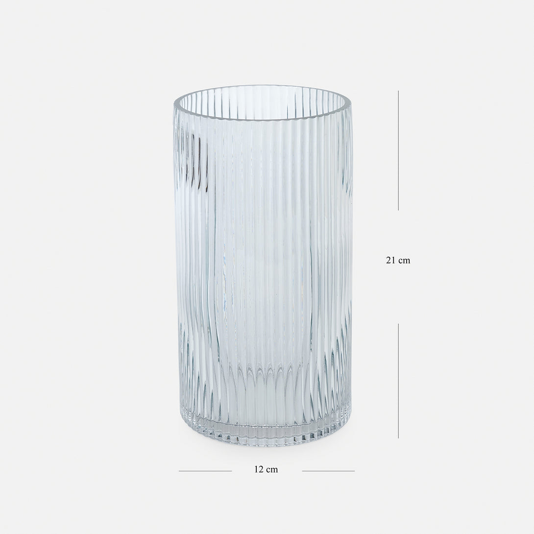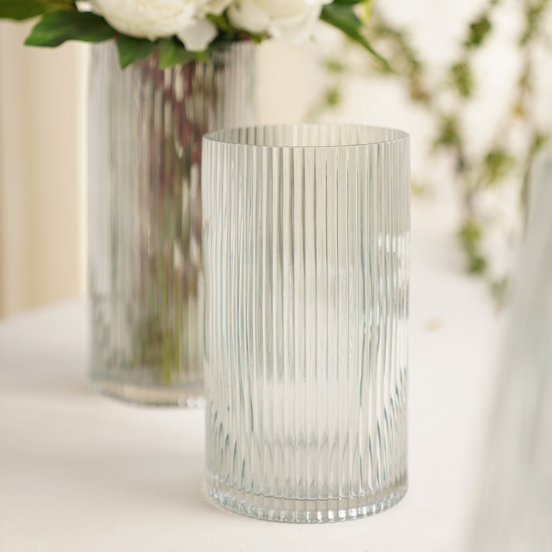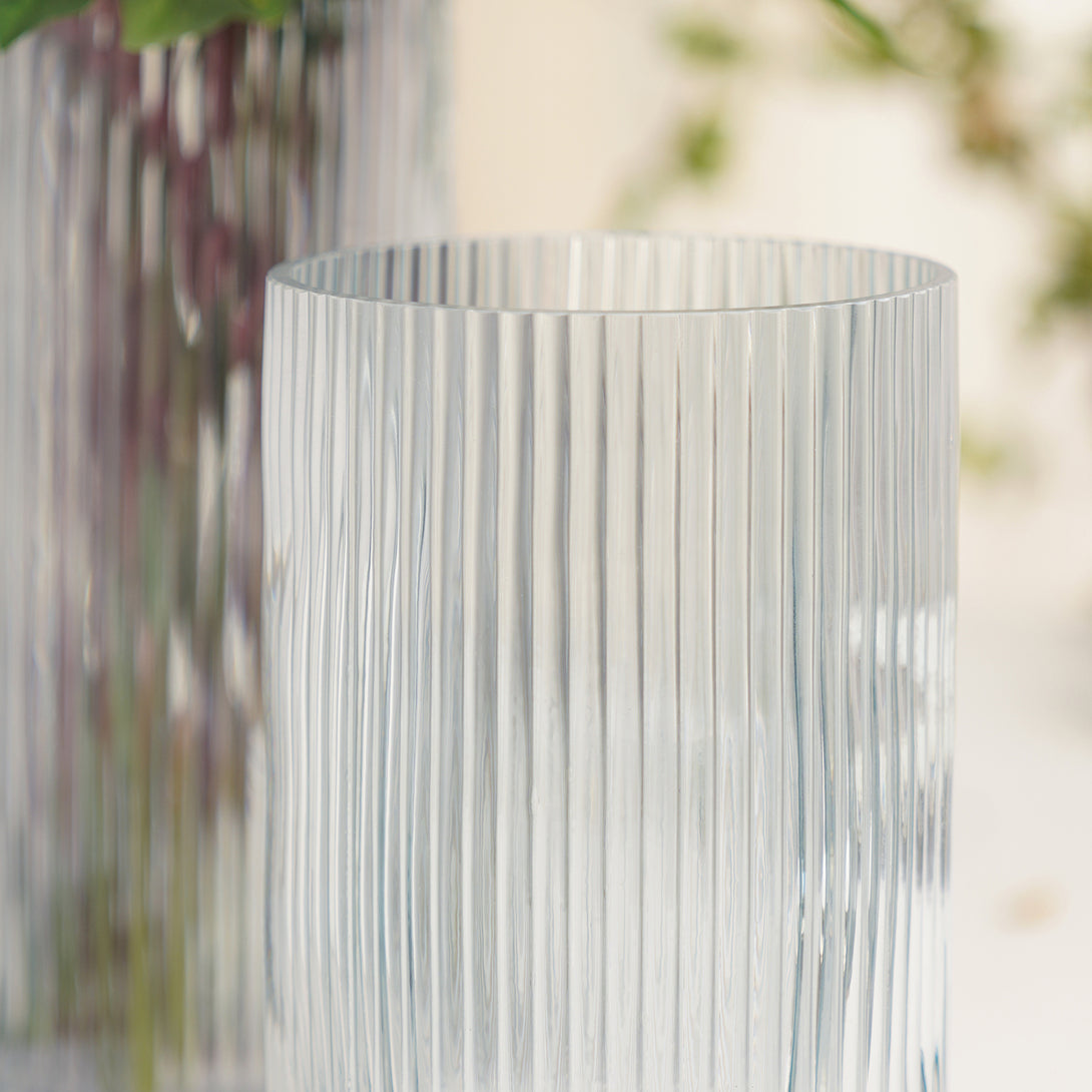 A sleek, ribbed straight glass vase perfect for showcasing your favorite flowers with elegant simplicity. Its timeless design adds a touch of sophistication to any room or event décor.