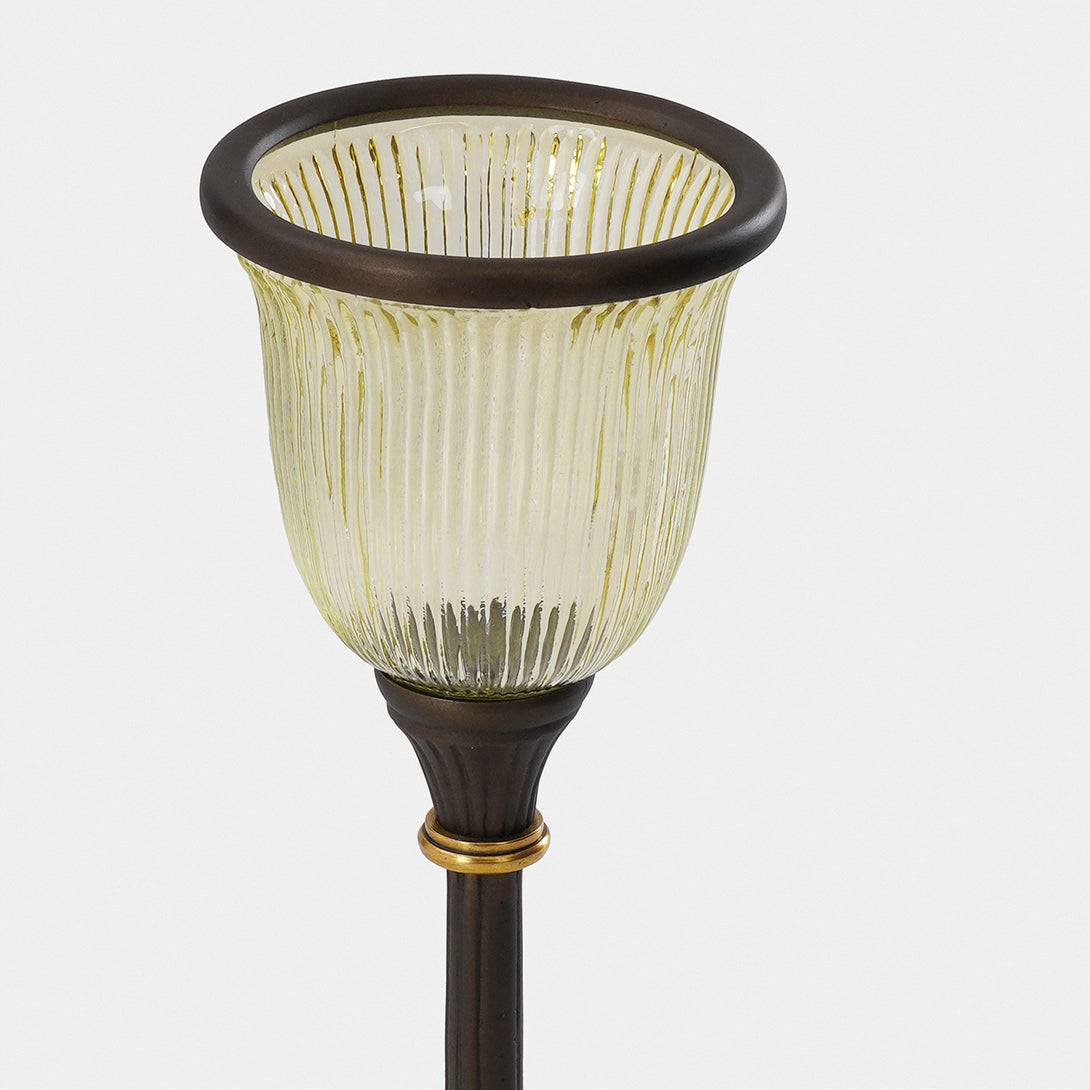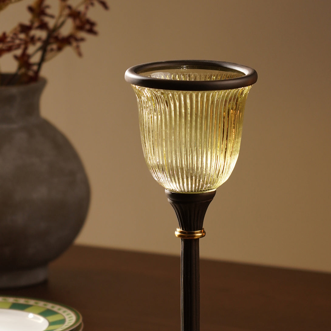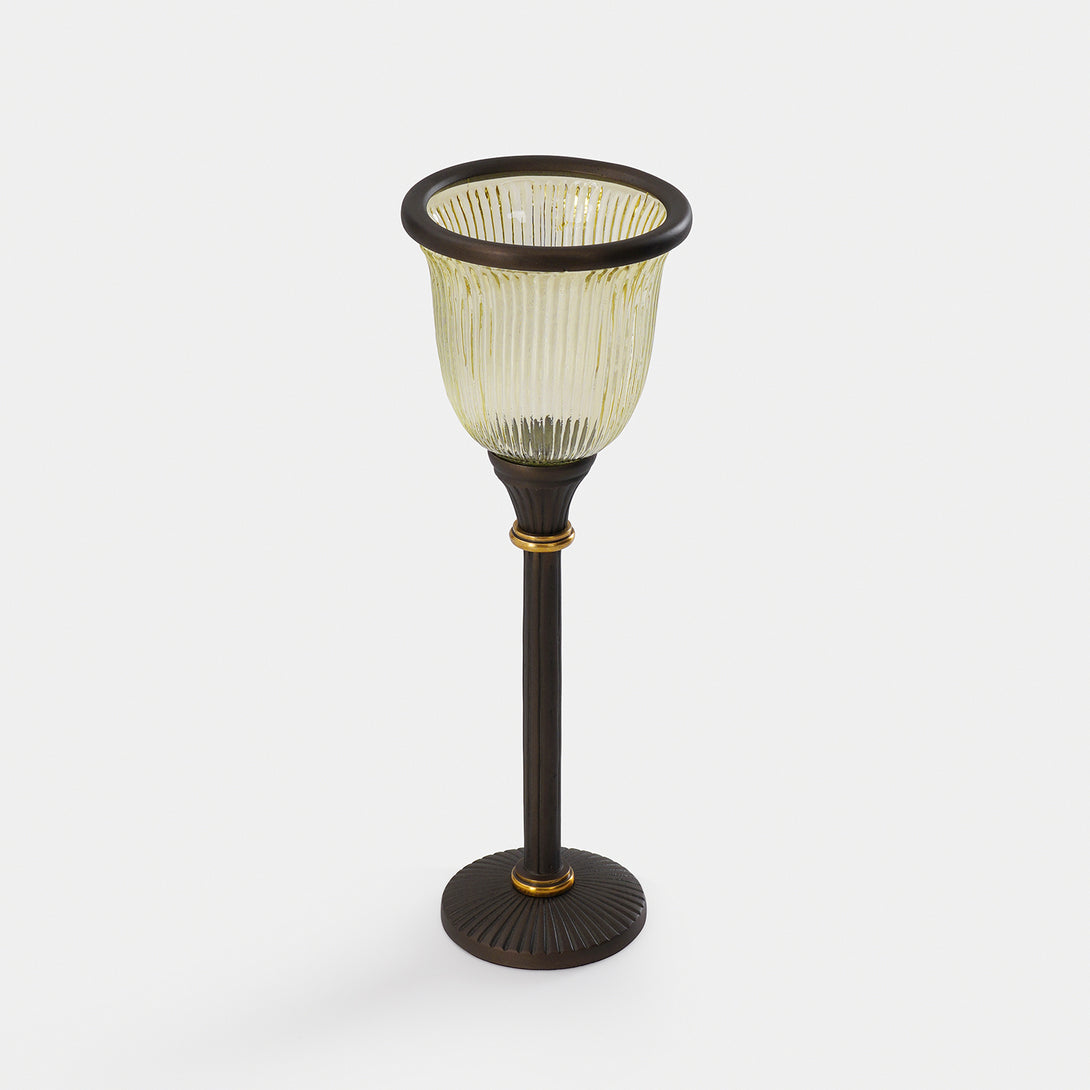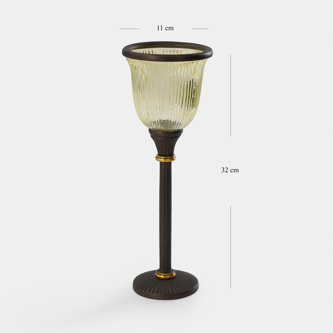 This tall antique finished candle holder is a tall, elegant stem and warm-toned glass. Perfect for adding a vintage charm and soft glowing ambience to any room.