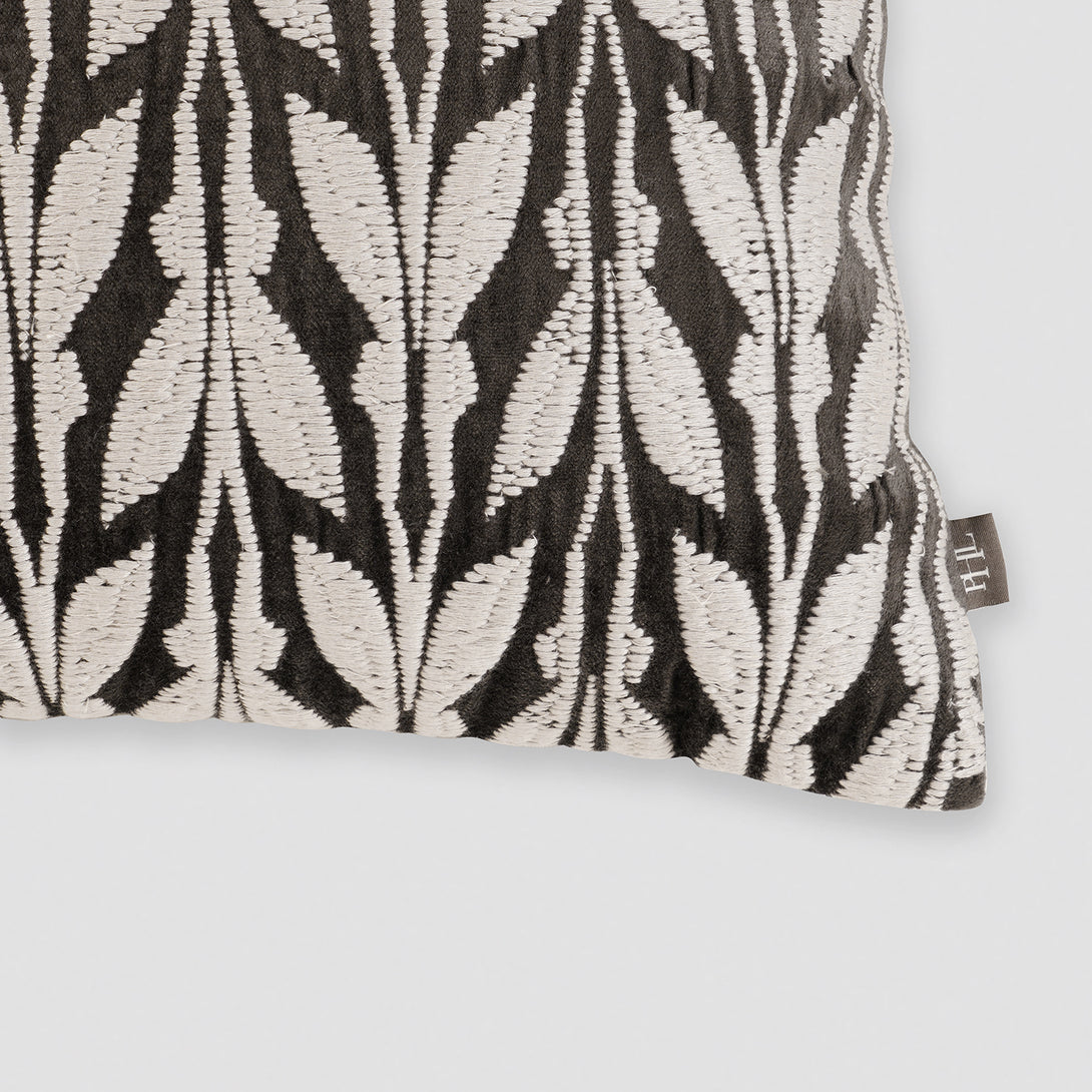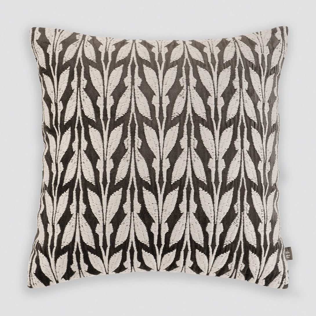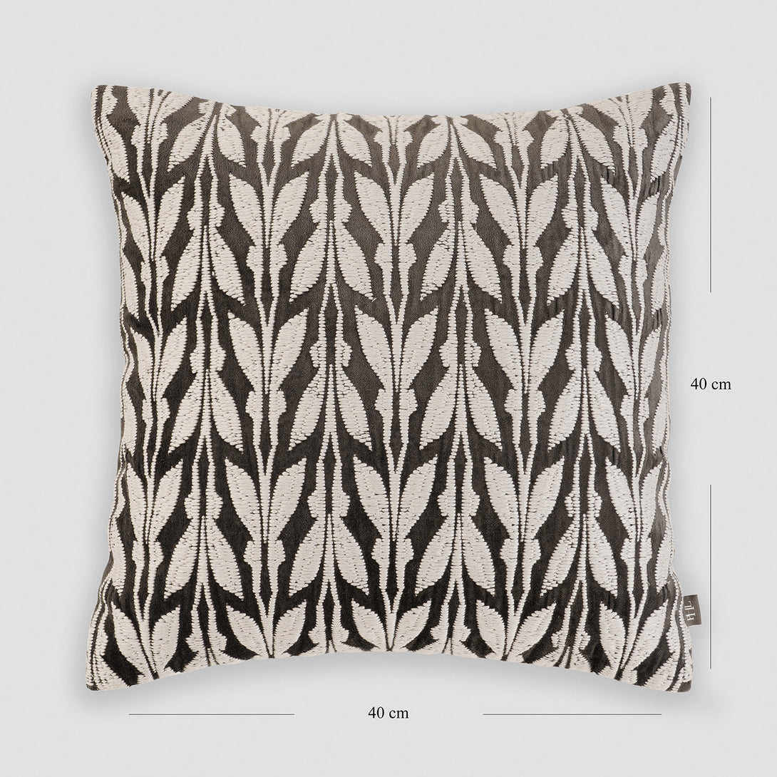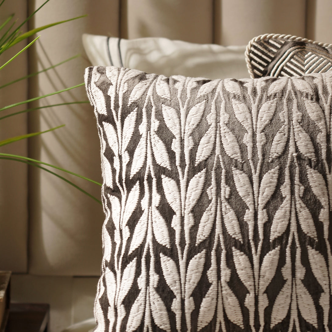 Elegant embroidered cushion cover featuring a bold monochrome leaf motif, adding depth and texture to any space. Crafted with premium fabric, it blends modern artistry with timeless sophistication for versatile home styling.