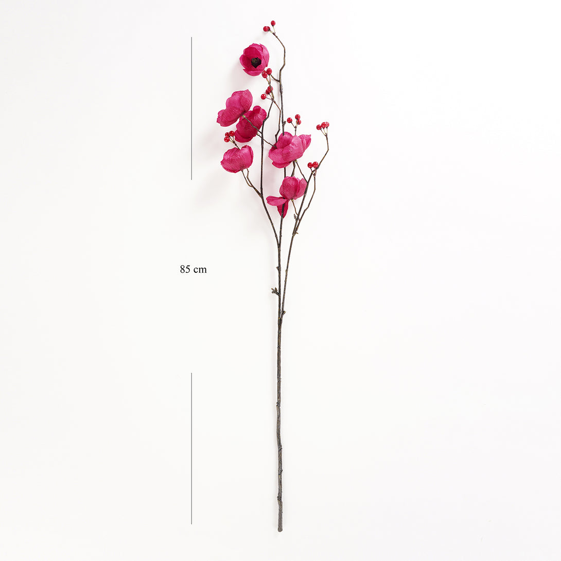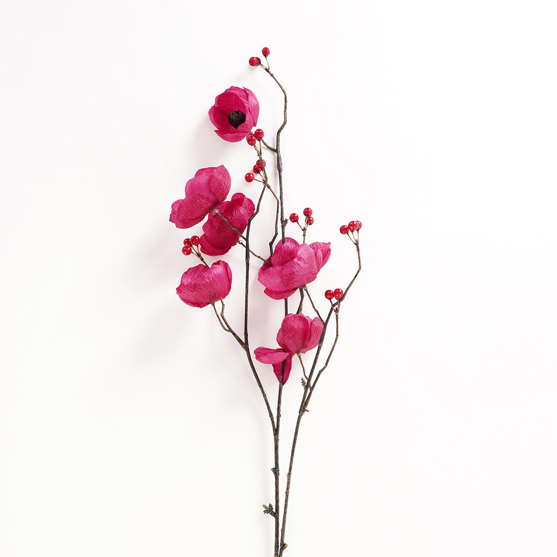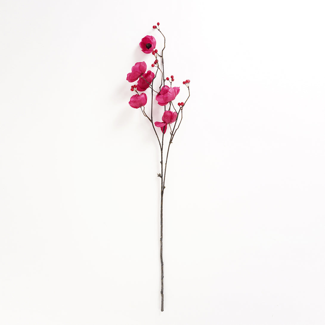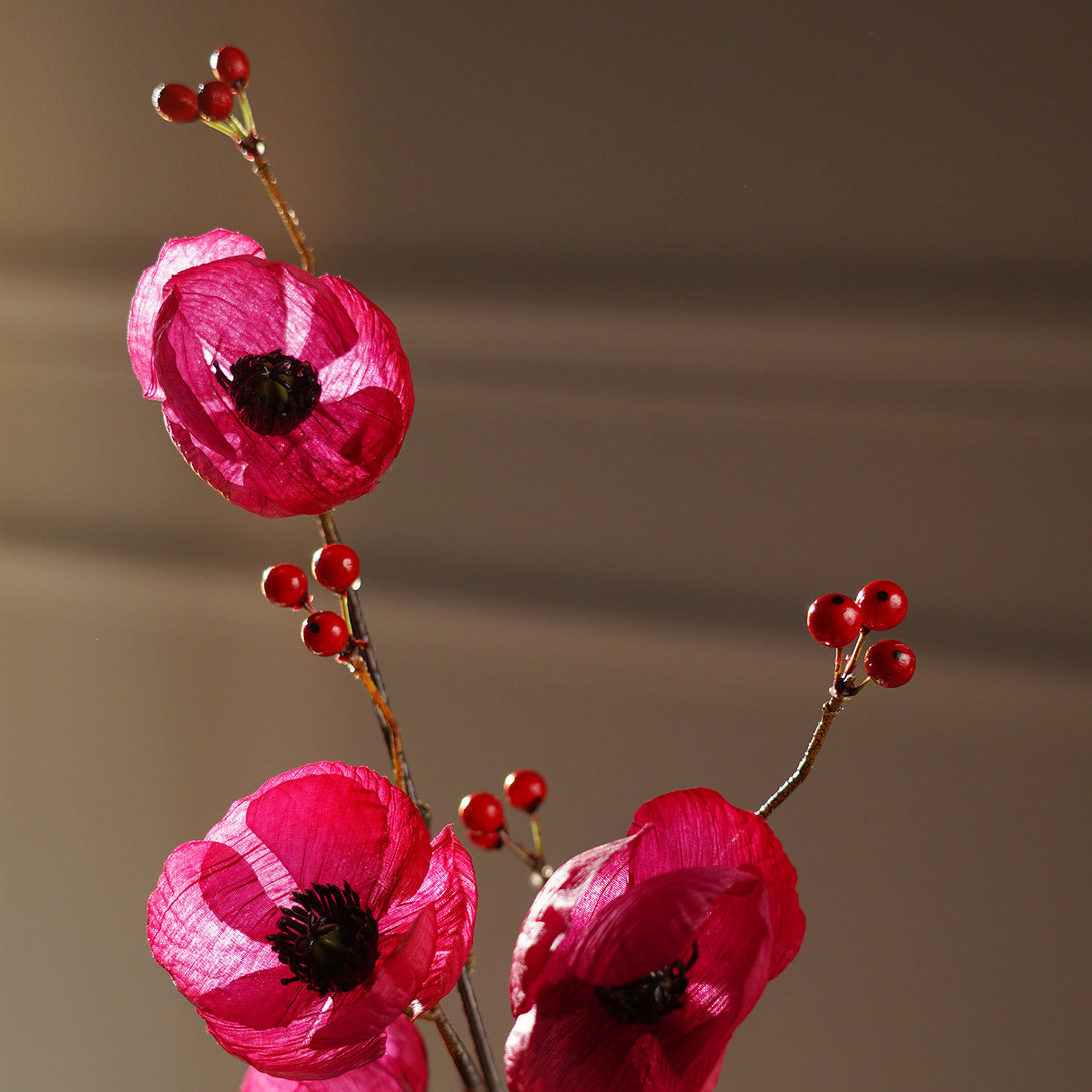 This burgundy poppy berry artificial stem will brighten up any space with its vibrant blooms and berry accents. Ideal for creating cheerful arrangements or displaying solo in a statement vase.