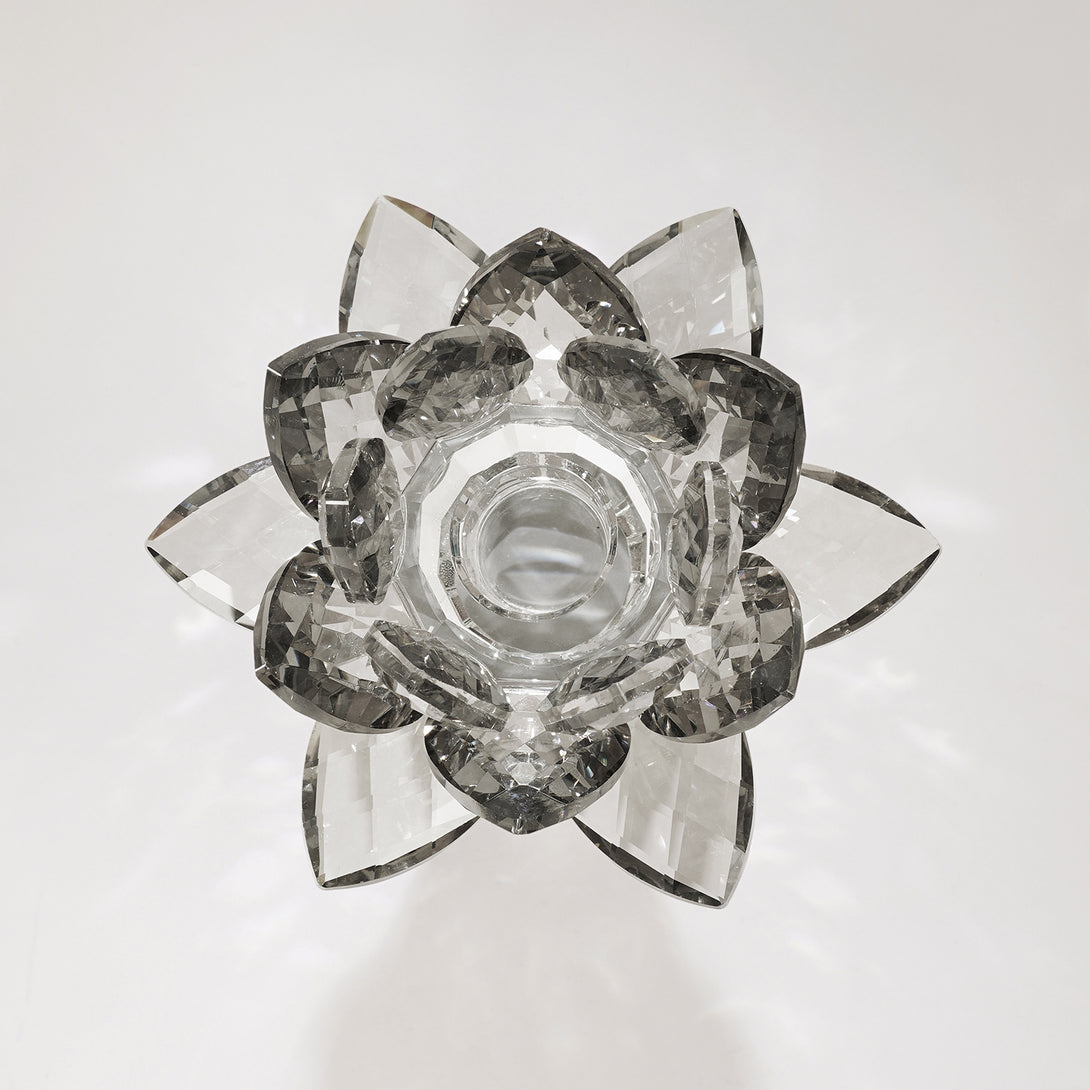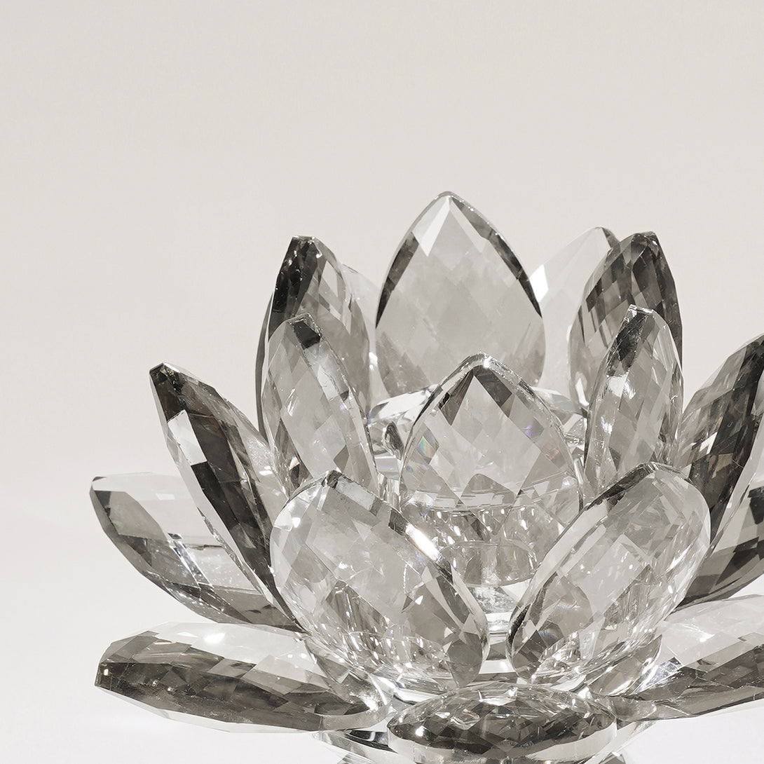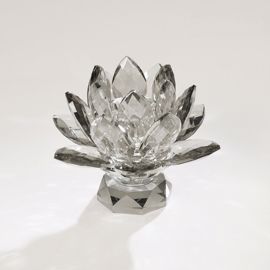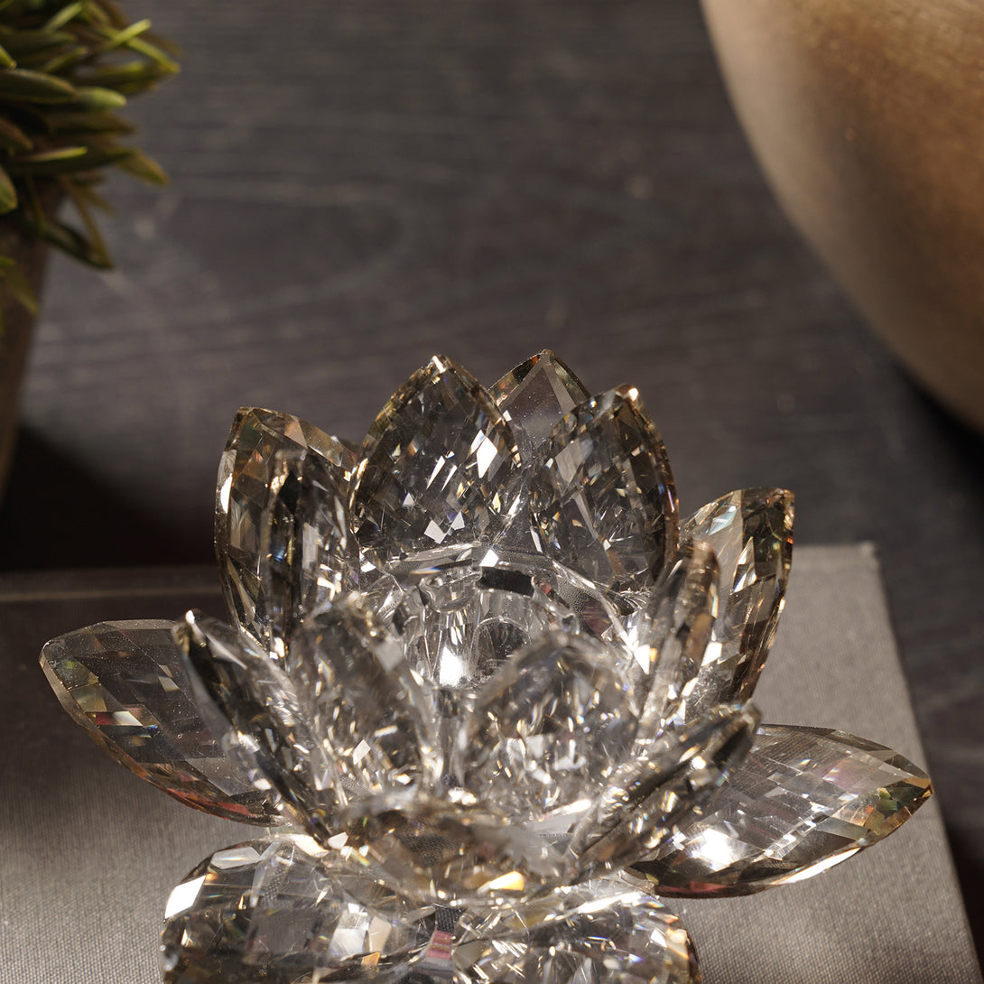 Illuminate your space with this stunning crystal lotus tealight holder, radiating divine elegance and light play. Expertly faceted petals create a dazzling sparkle effect, perfect for pooja decor or luxe table styling.