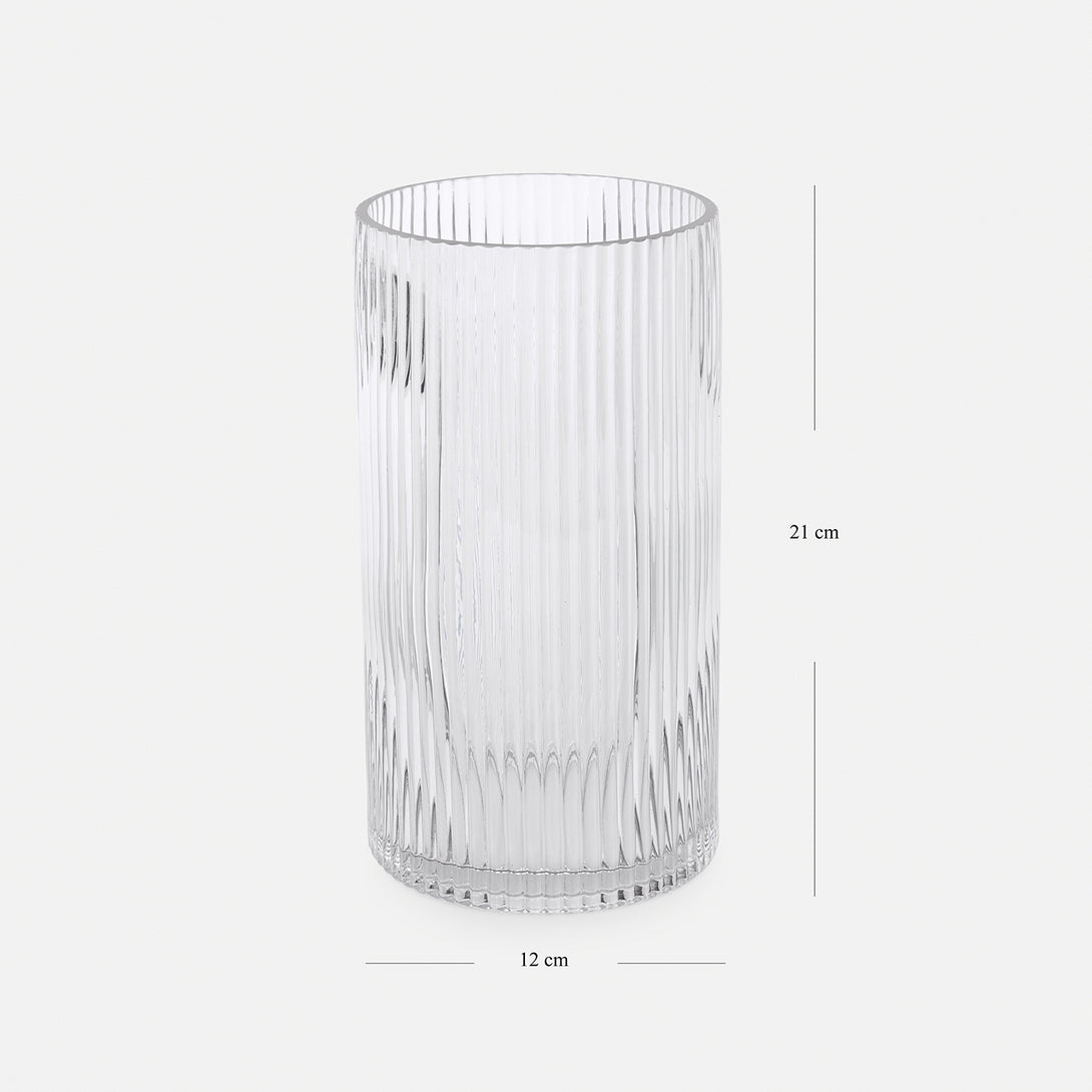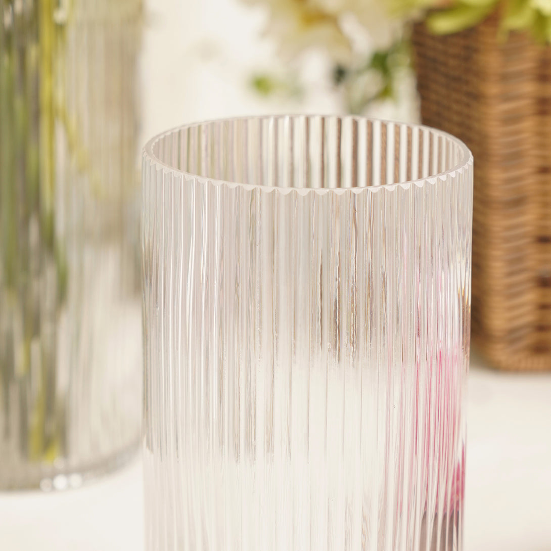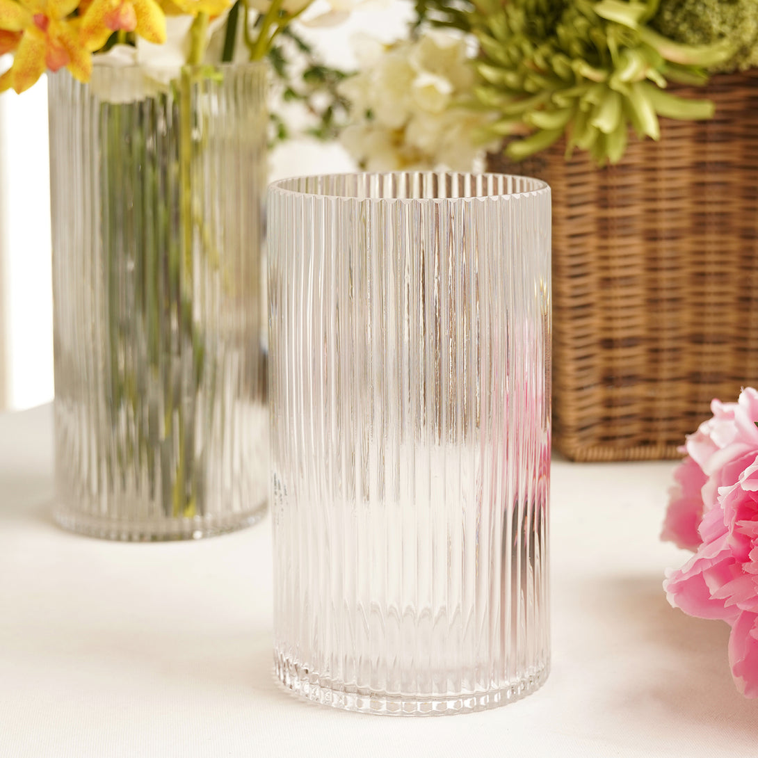 A sleek, clear ribbed straight glass vase perfect for showcasing your favorite flowers with elegant simplicity. Its timeless design adds a touch of sophistication to any room or event dĂŠcor.