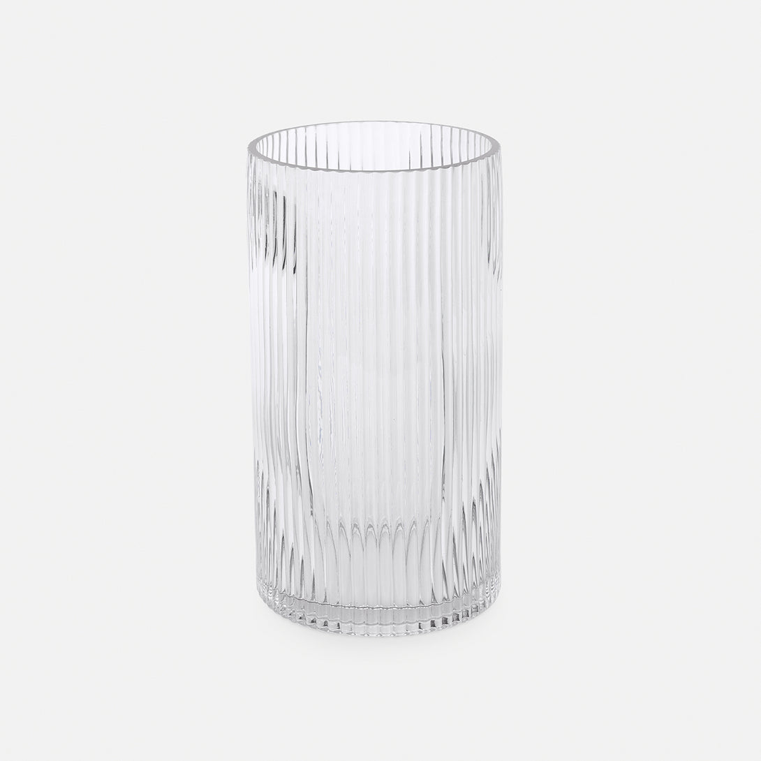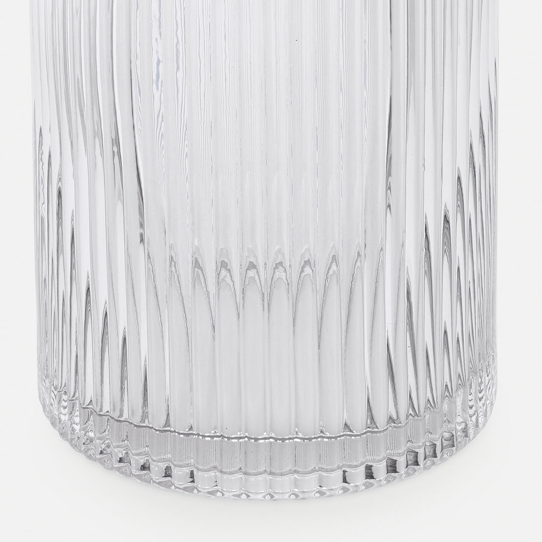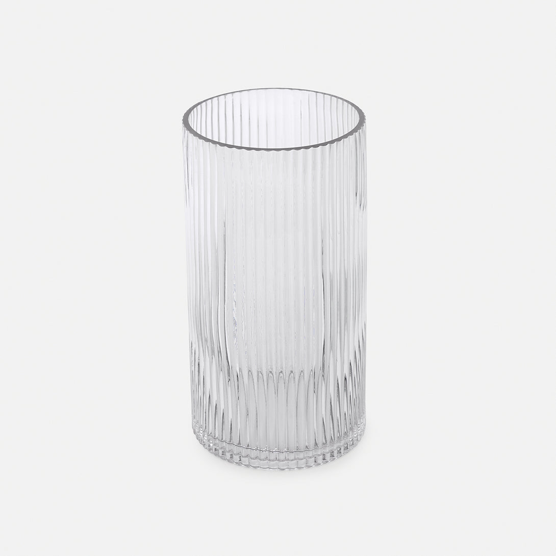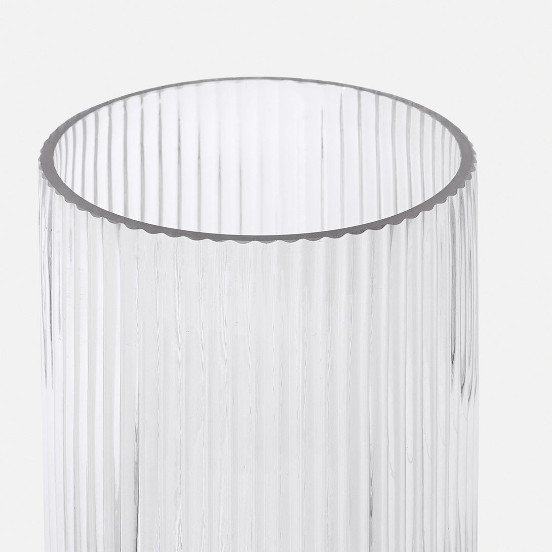 A sleek, clear ribbed straight glass vase perfect for showcasing your favorite flowers with elegant simplicity. Its timeless design adds a touch of sophistication to any room or event dĂŠcor.