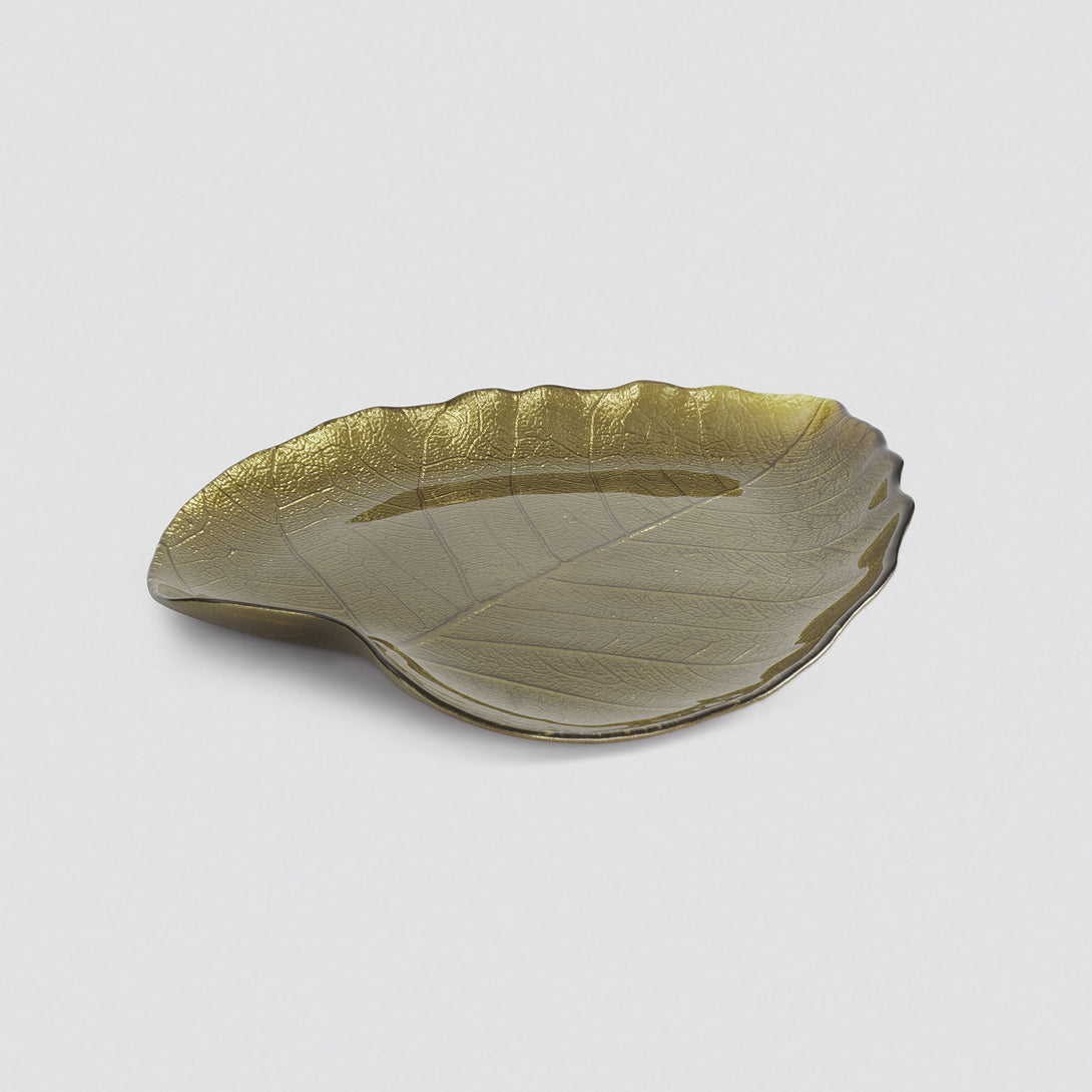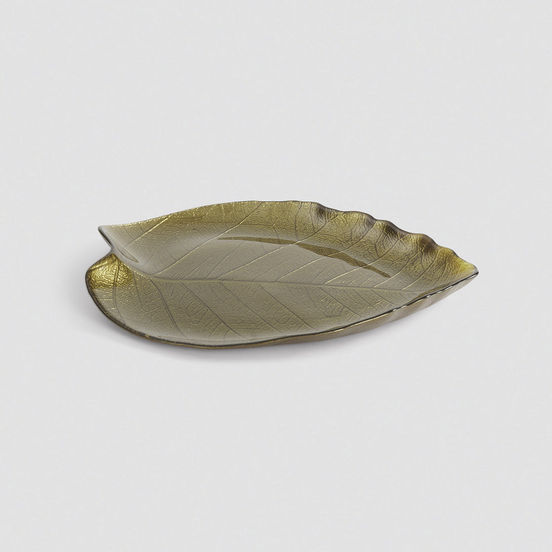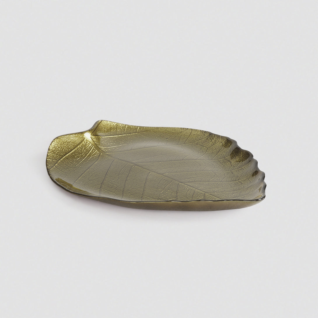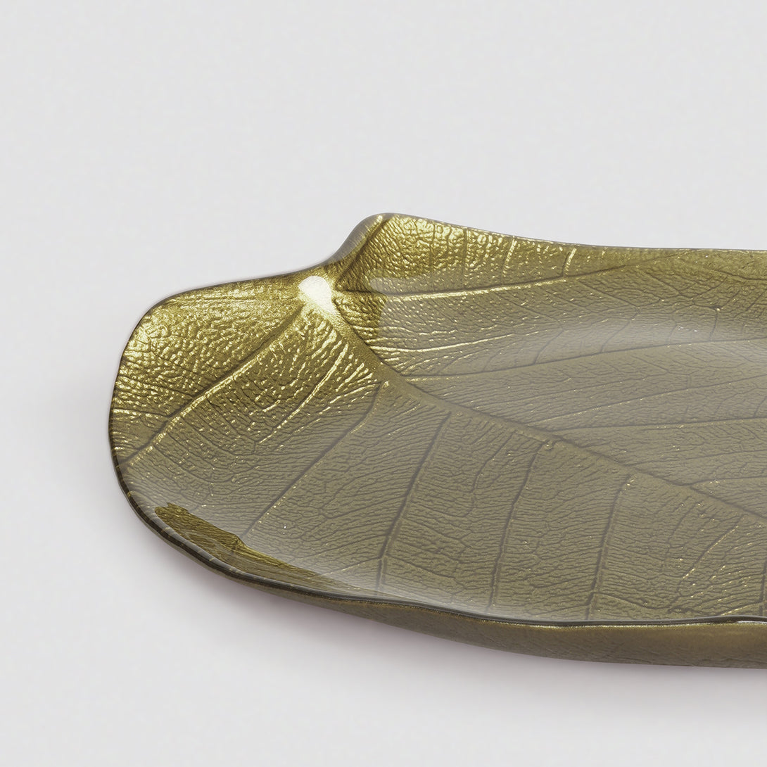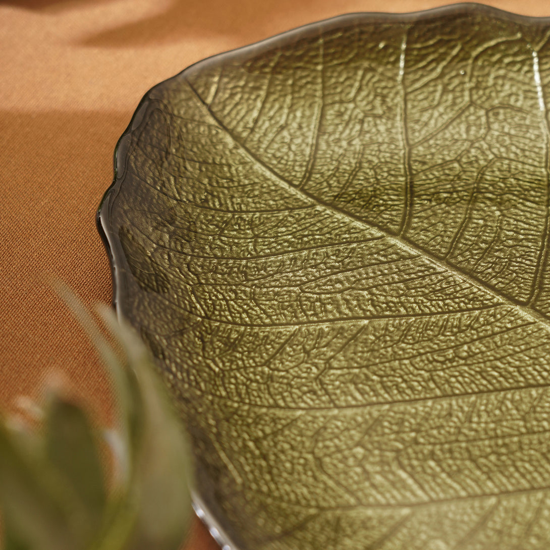 Stylish dark green leaf-shaped decorative platter with detailed vein textures and a glossy finish. Perfect for serving or display, it brings an earthy elegance and organic charm to any table setting.