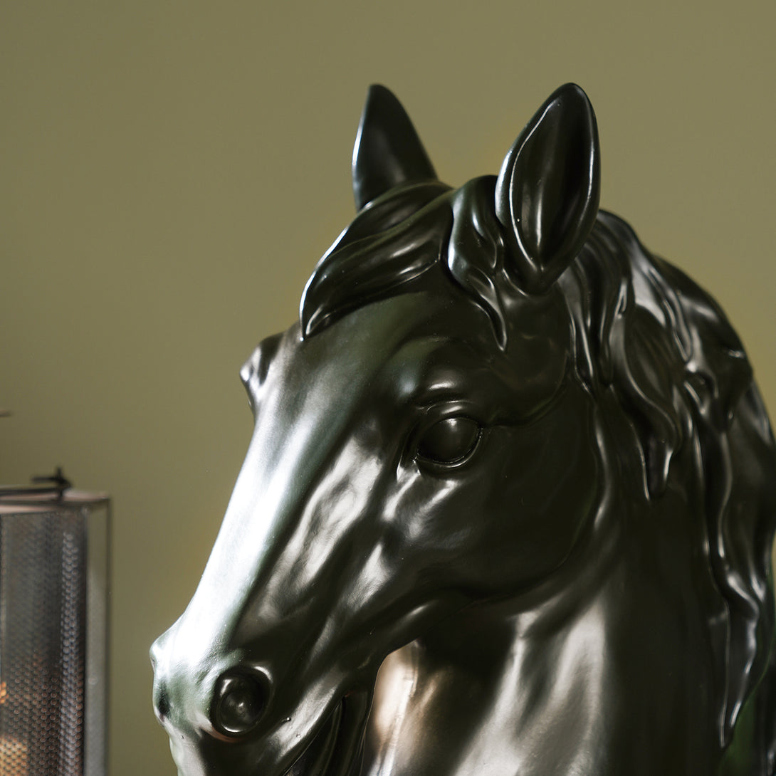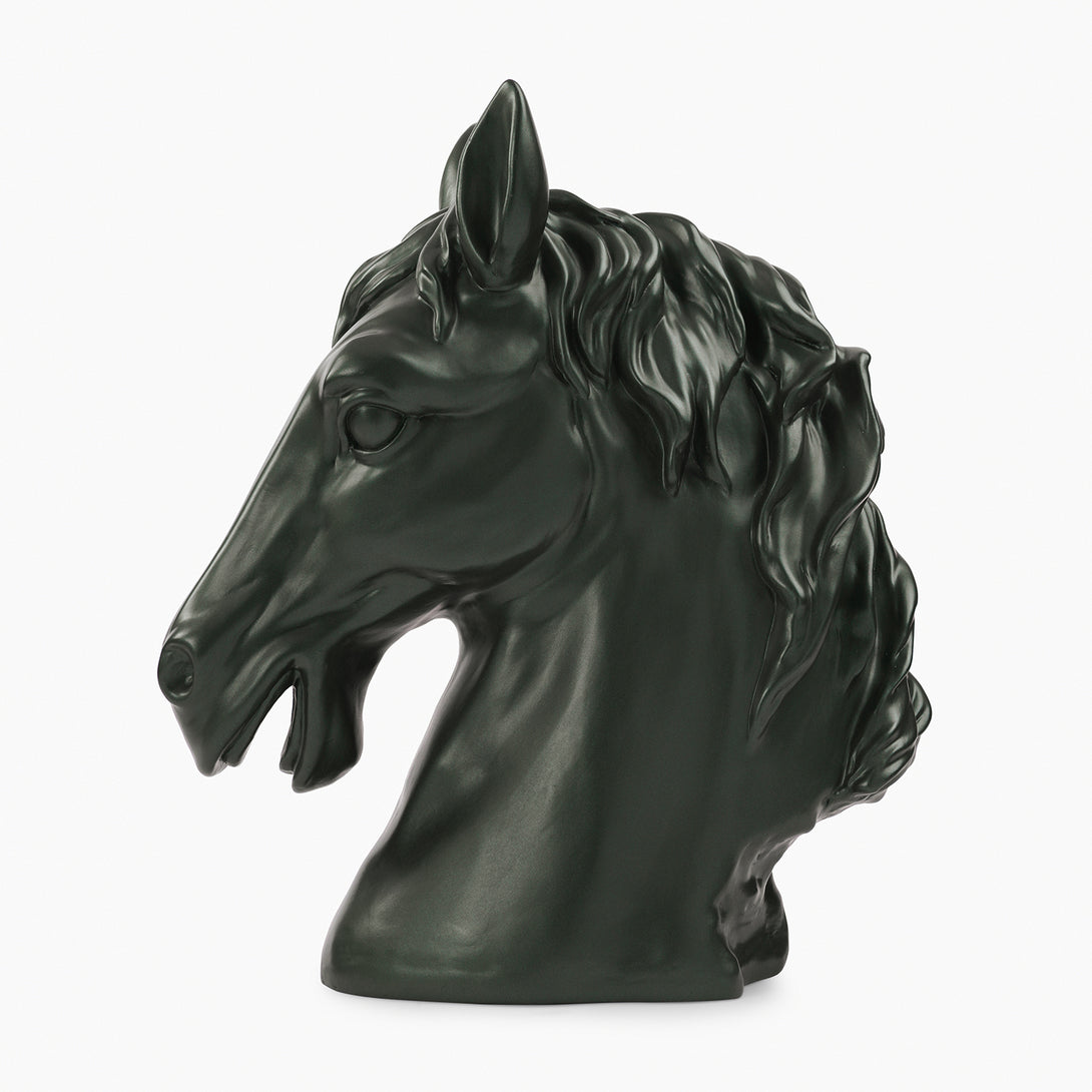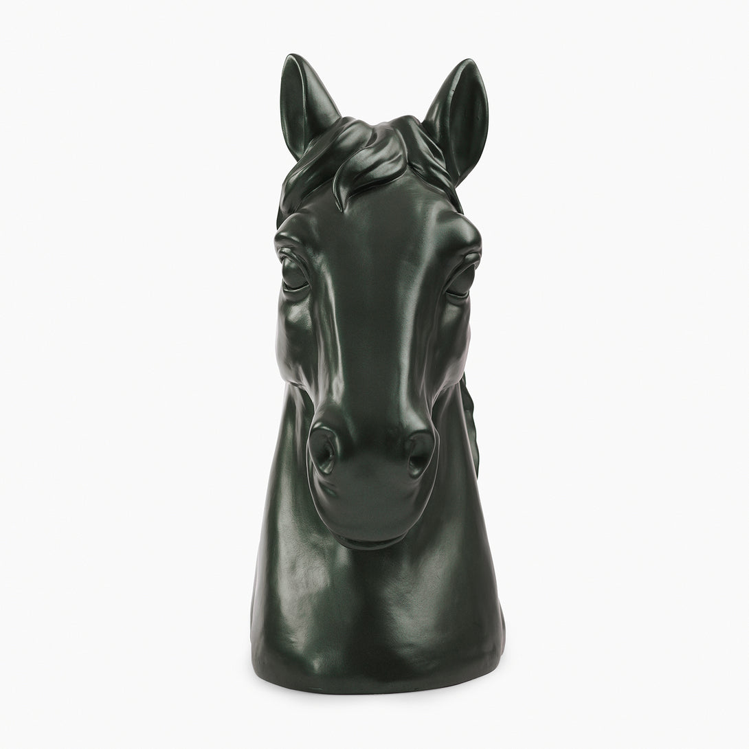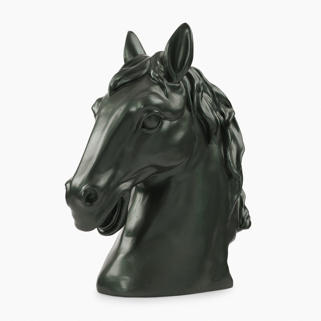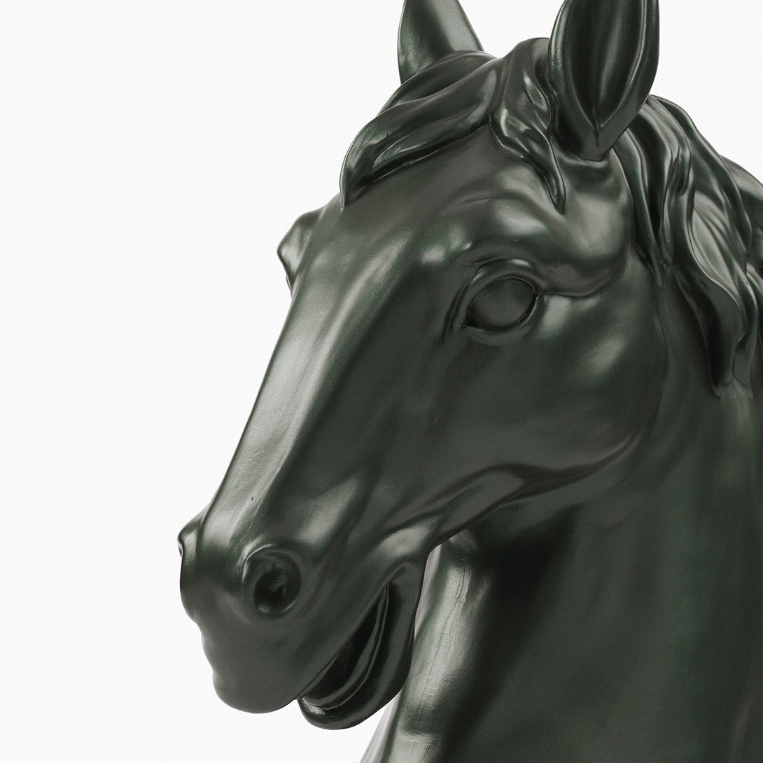 Add a touch of class and elegance to your space with this dark green horse head figurine.