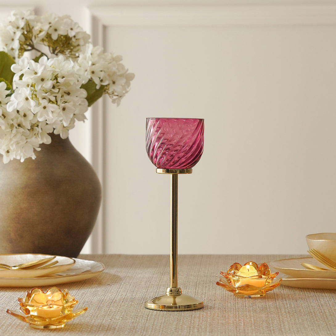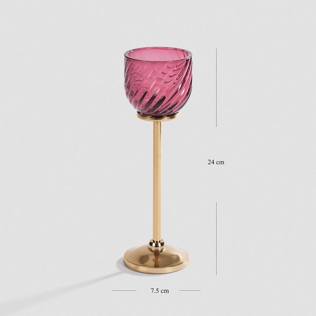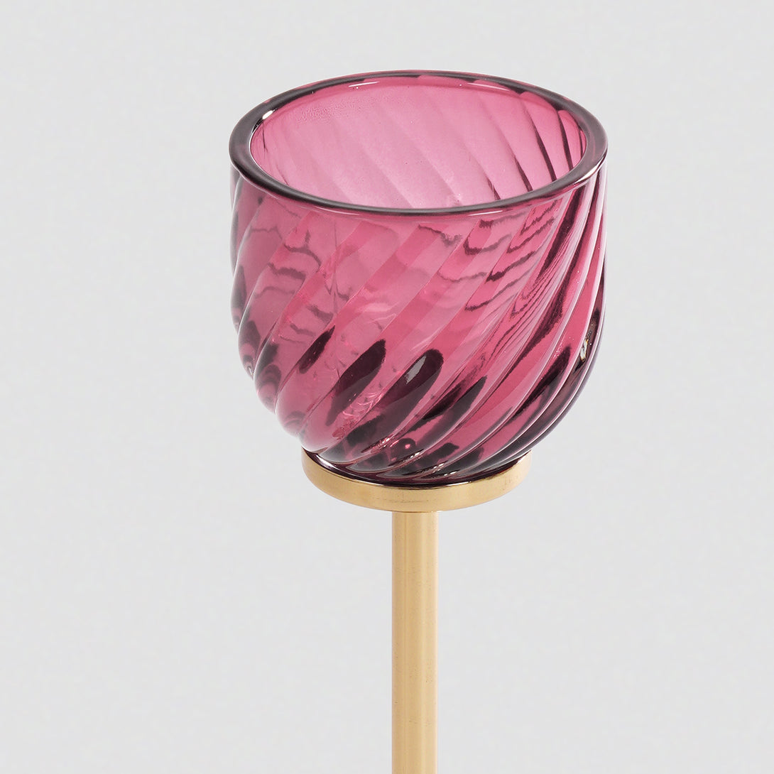 This dark pink glass votive holder on a tall metallic stand brings a warm, golden glow to any space. Its swirling texture beautifully reflects candlelight, creating a striking play of light and shadow that feels both modern and timeless.