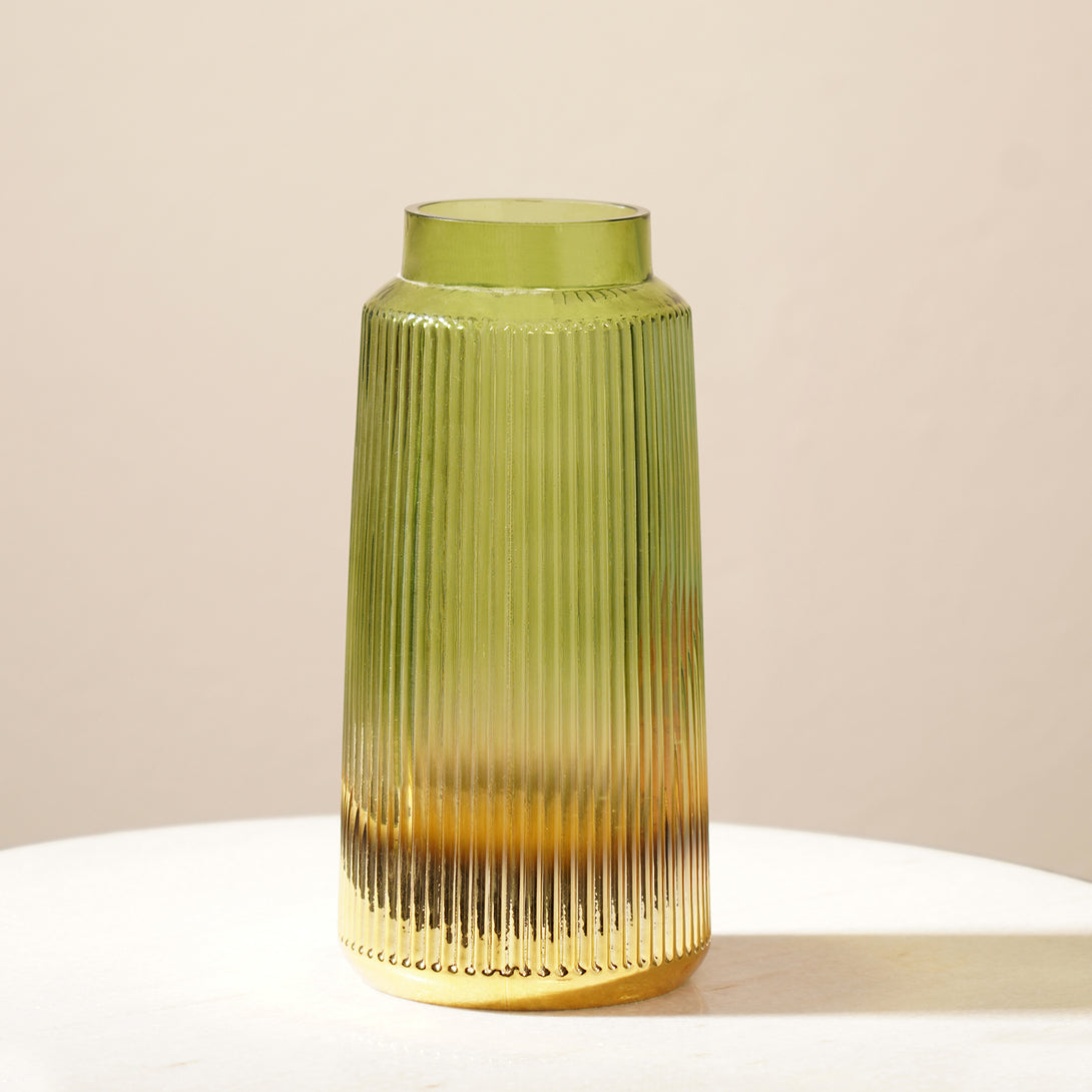 Lend a flourish to your dining table or entryway mantel with this green vase. Crafted in glass, it features a ribbed texture and a shaded gold bottom thatll surely complement the stems and add an eye-catching element to your decor.