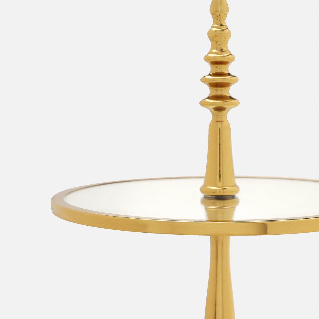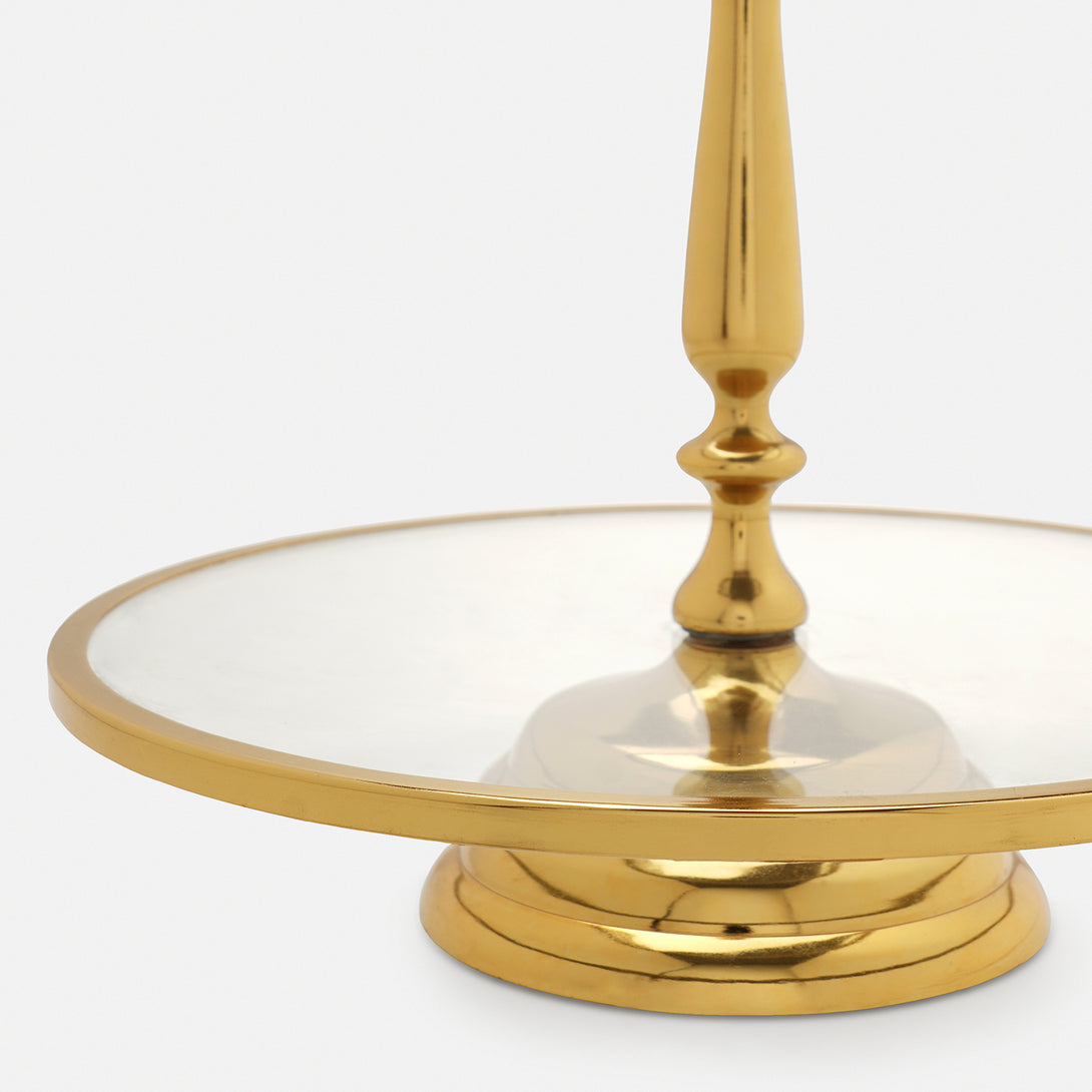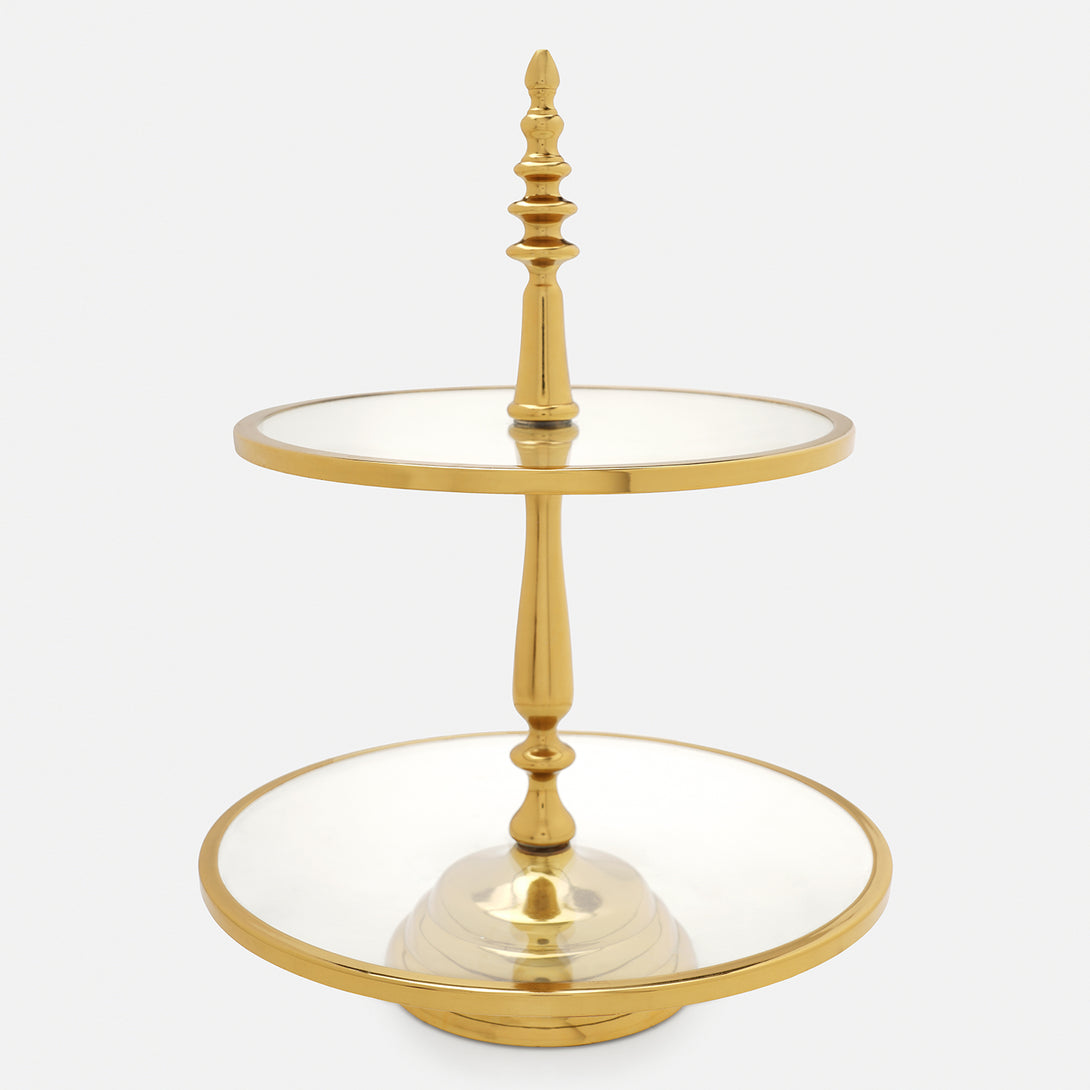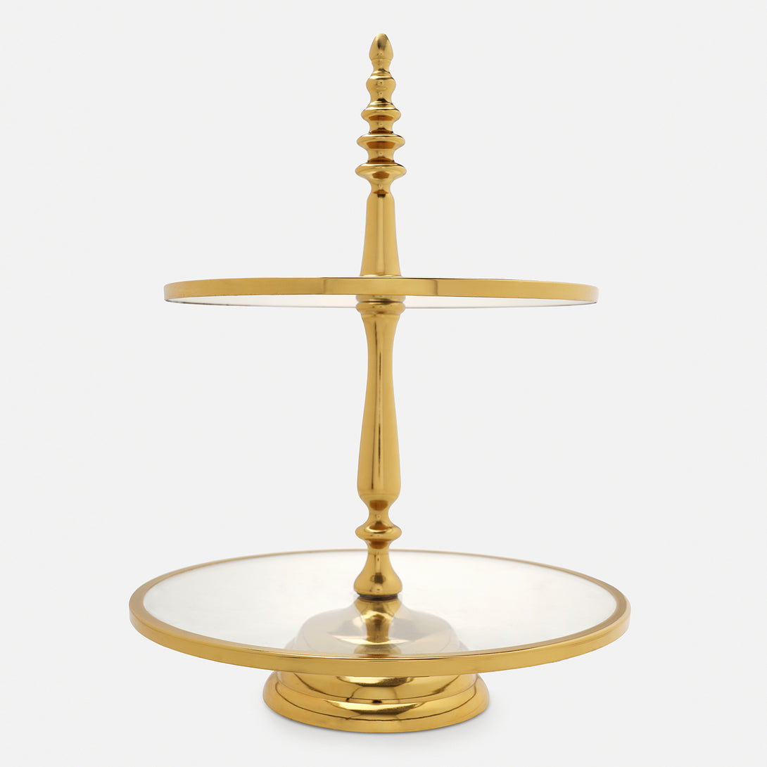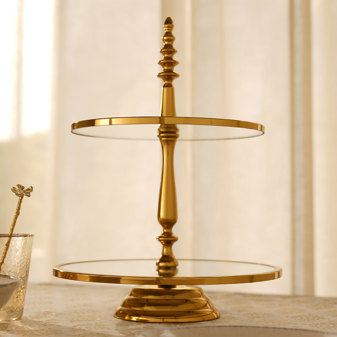 Add a touch of luxury to your table with this gold two-tiered glass cake stand, featuring mirrored tiers and a gleaming metallic finish. Perfect for displaying cakes, desserts, or hors dâoeuvres in timeless elegance.