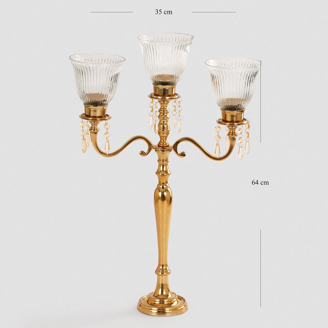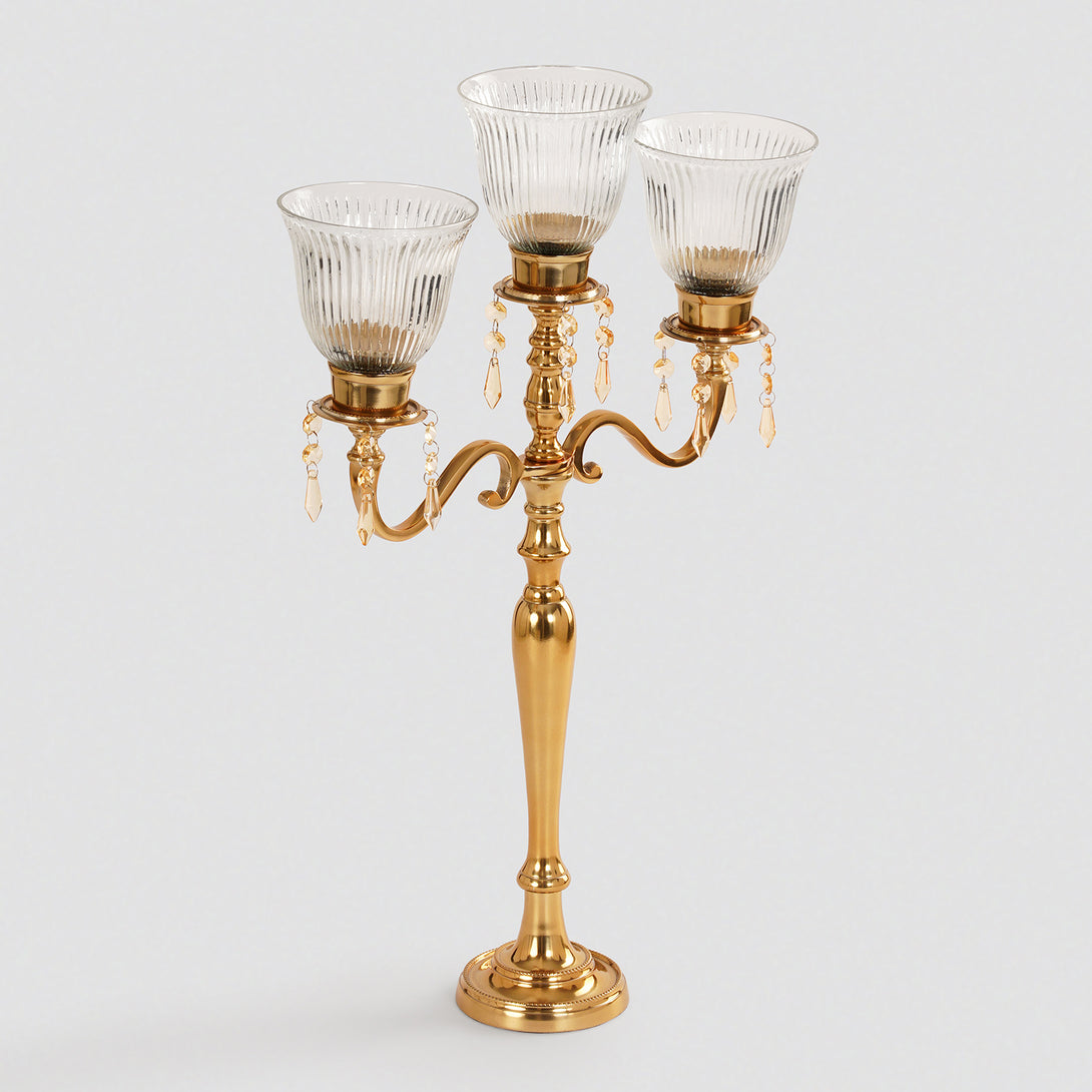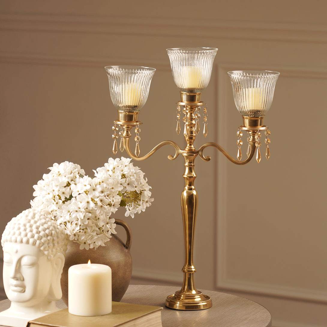 This gold-finished three-arm candelabra features ribbed glass votives and delicate crystal droplet accents for a regal touch. Perfect for creating a luxurious ambiance, it blends timeless elegance with sparkling detail.