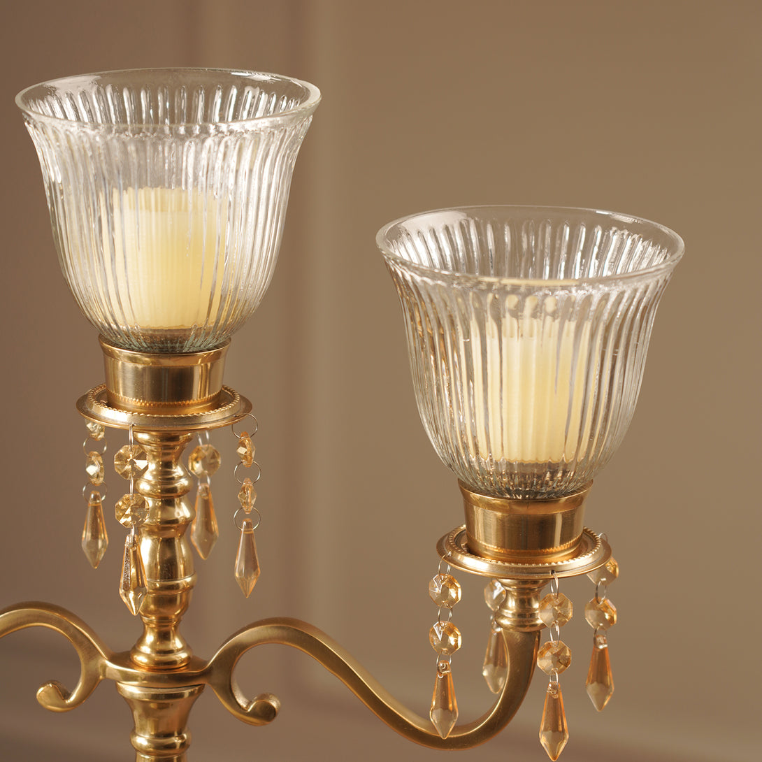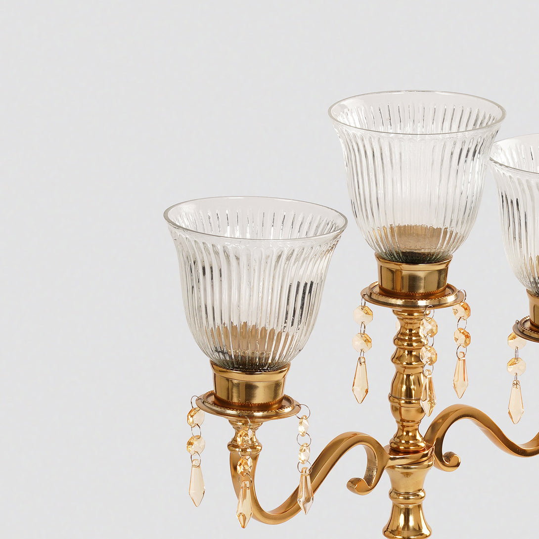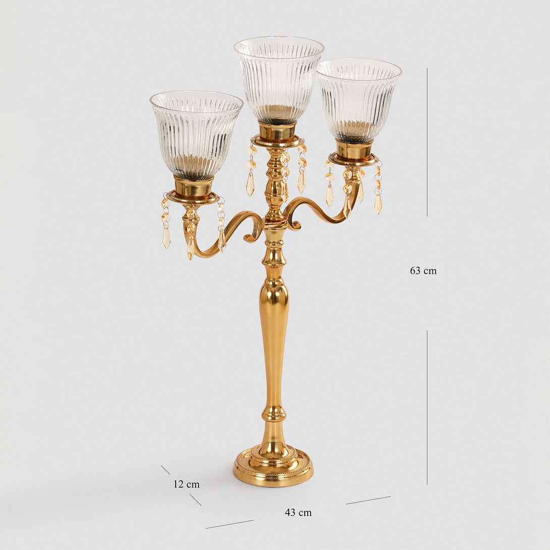 This gold-finished three-arm candelabra features ribbed glass votives and delicate crystal droplet accents for a regal touch. Perfect for creating a luxurious ambiance, it blends timeless elegance with sparkling detail.