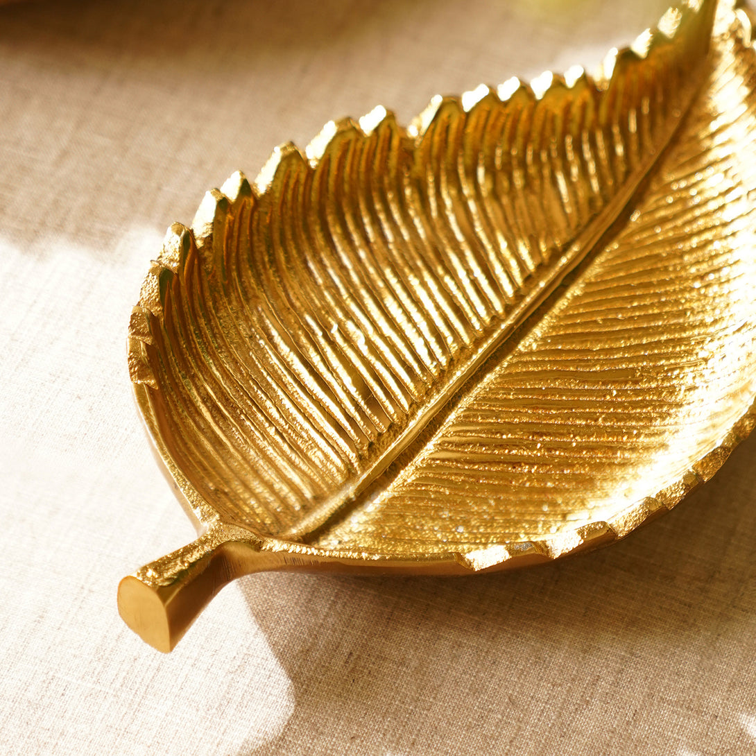 Pick this gold birch leaf platter to add a distinctive element to the entry table, bedside, mantel, or countertop. Crafted in aluminium, the platter features textured veins. Use it to display small finds or as an elevated catch-all.