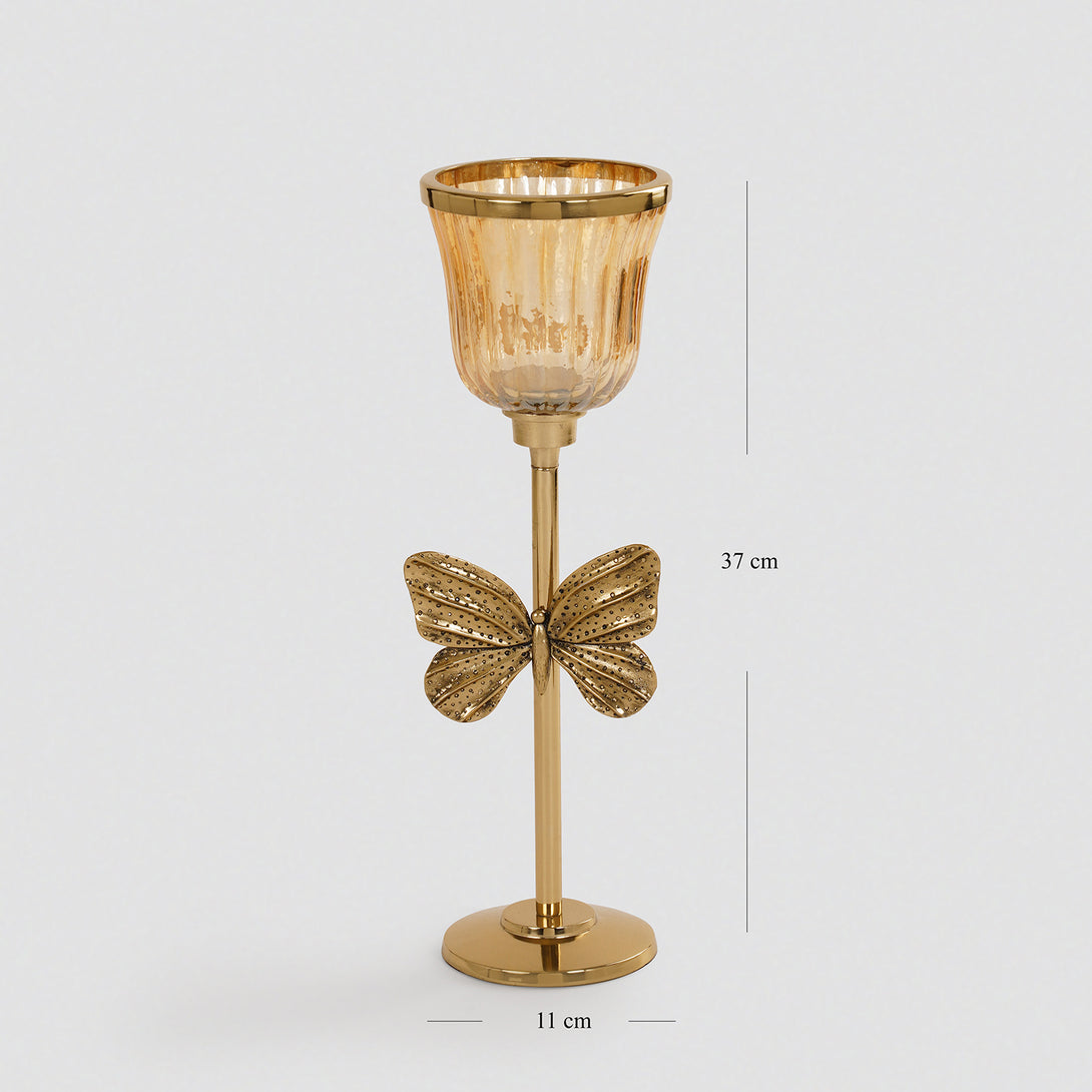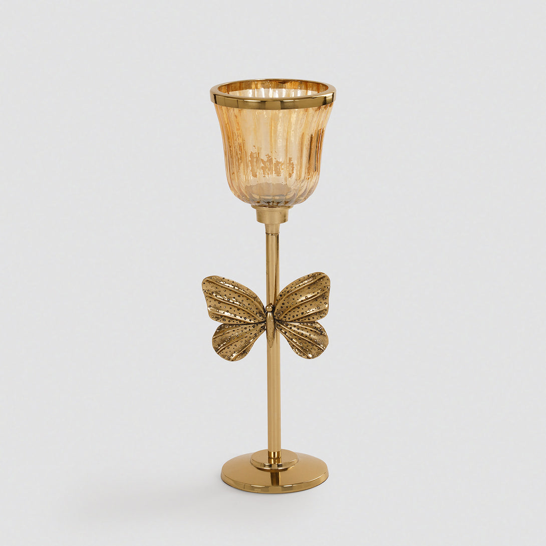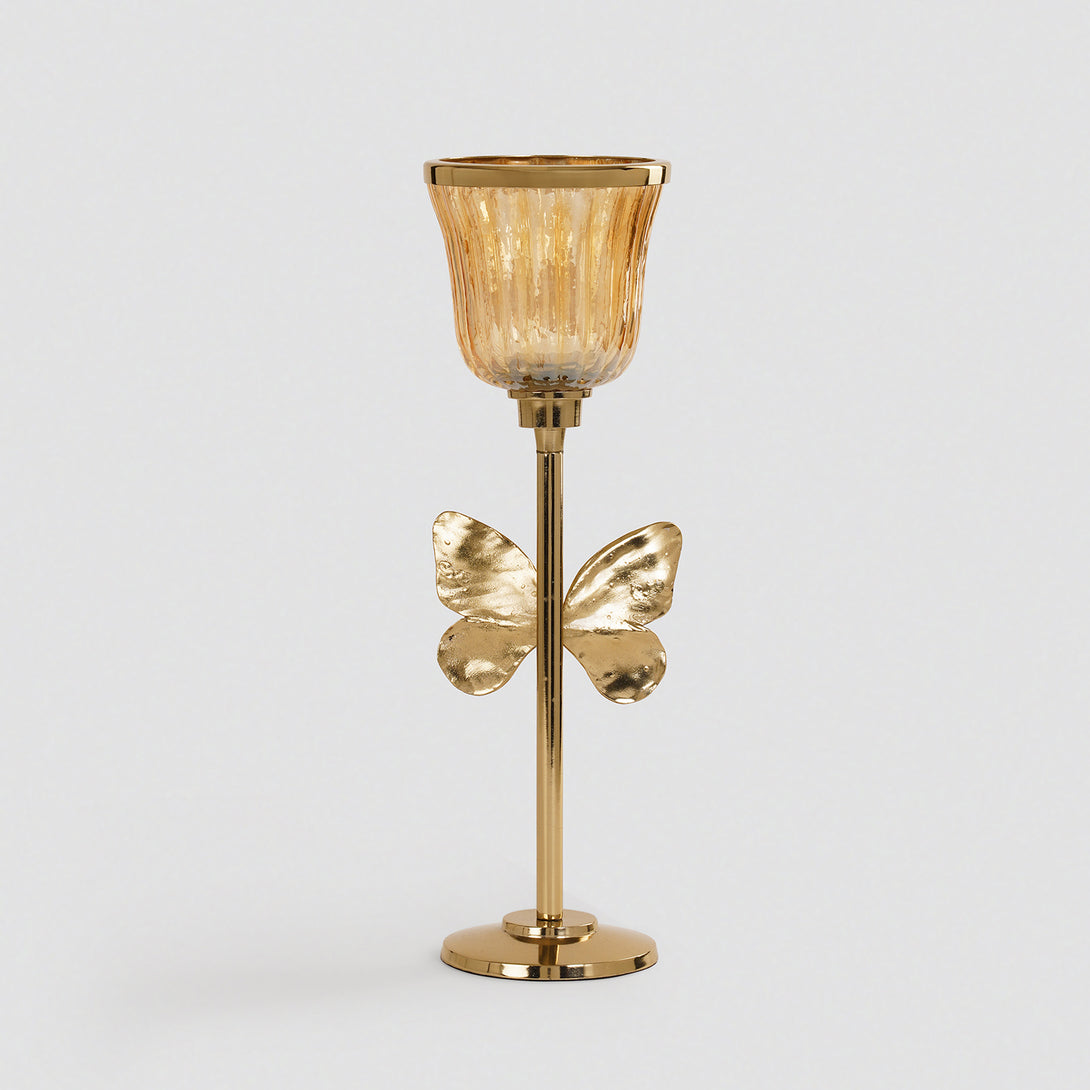 This elegant candle holder features a ribbed amber glass cup set on a golden stem with a butterfly accent. Combining grace and charm, it makes a delightful statement piece for both modern and classic décor.