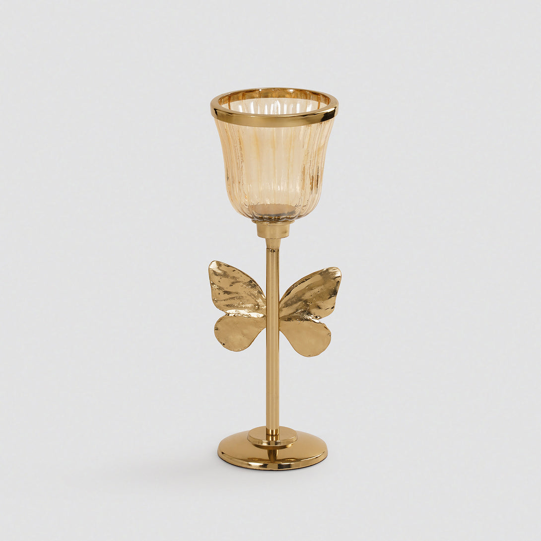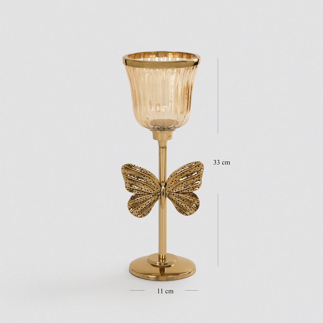 This elegant candle holder features a ribbed amber glass cup set on a golden stem with a butterfly accent. Combining grace and charm, it makes a delightful statement piece for both modern and classic décor.