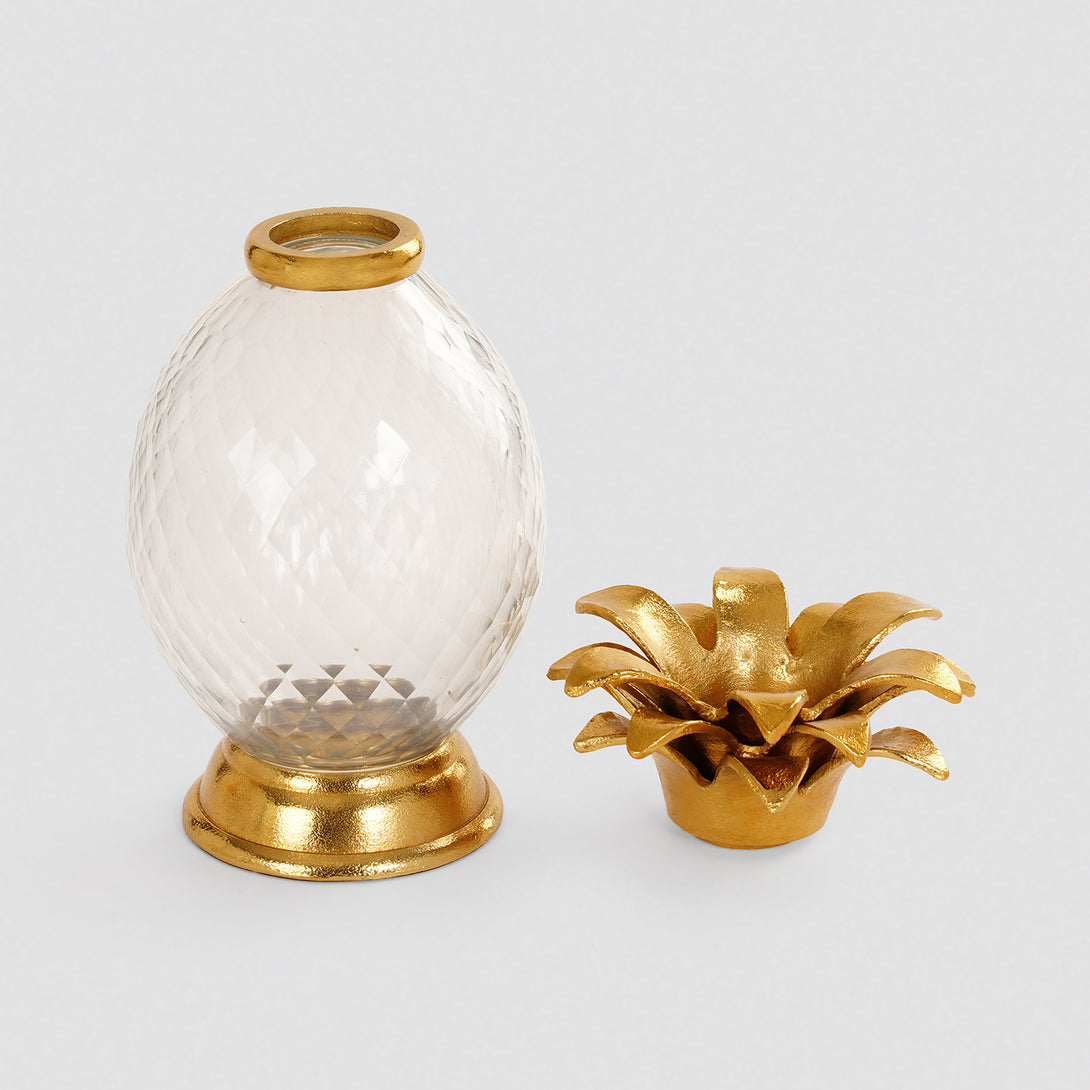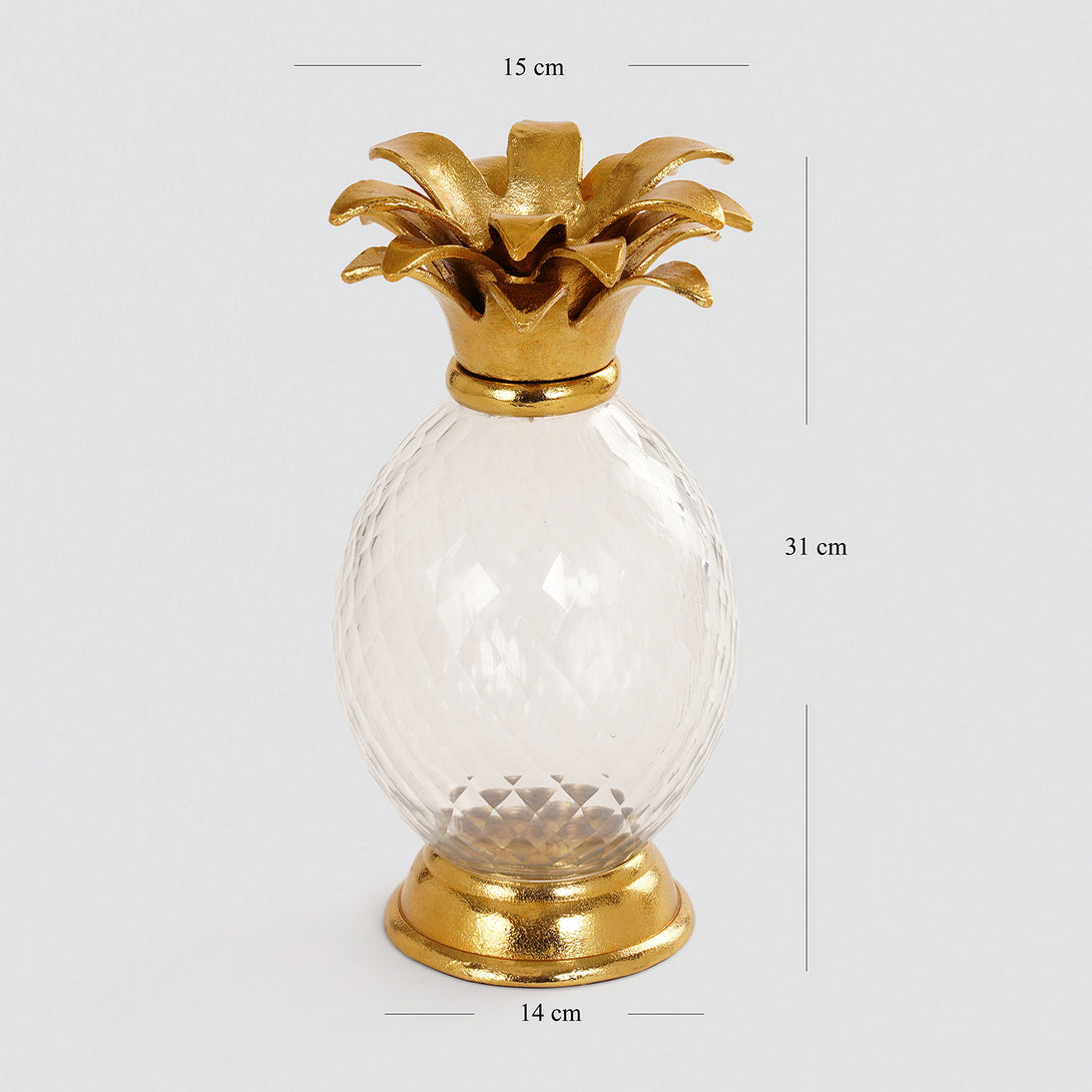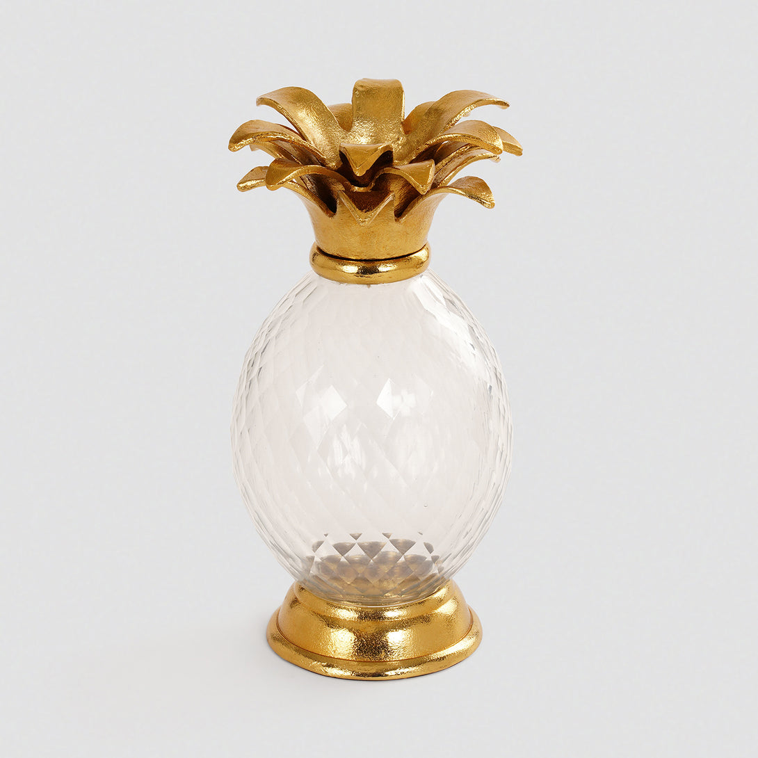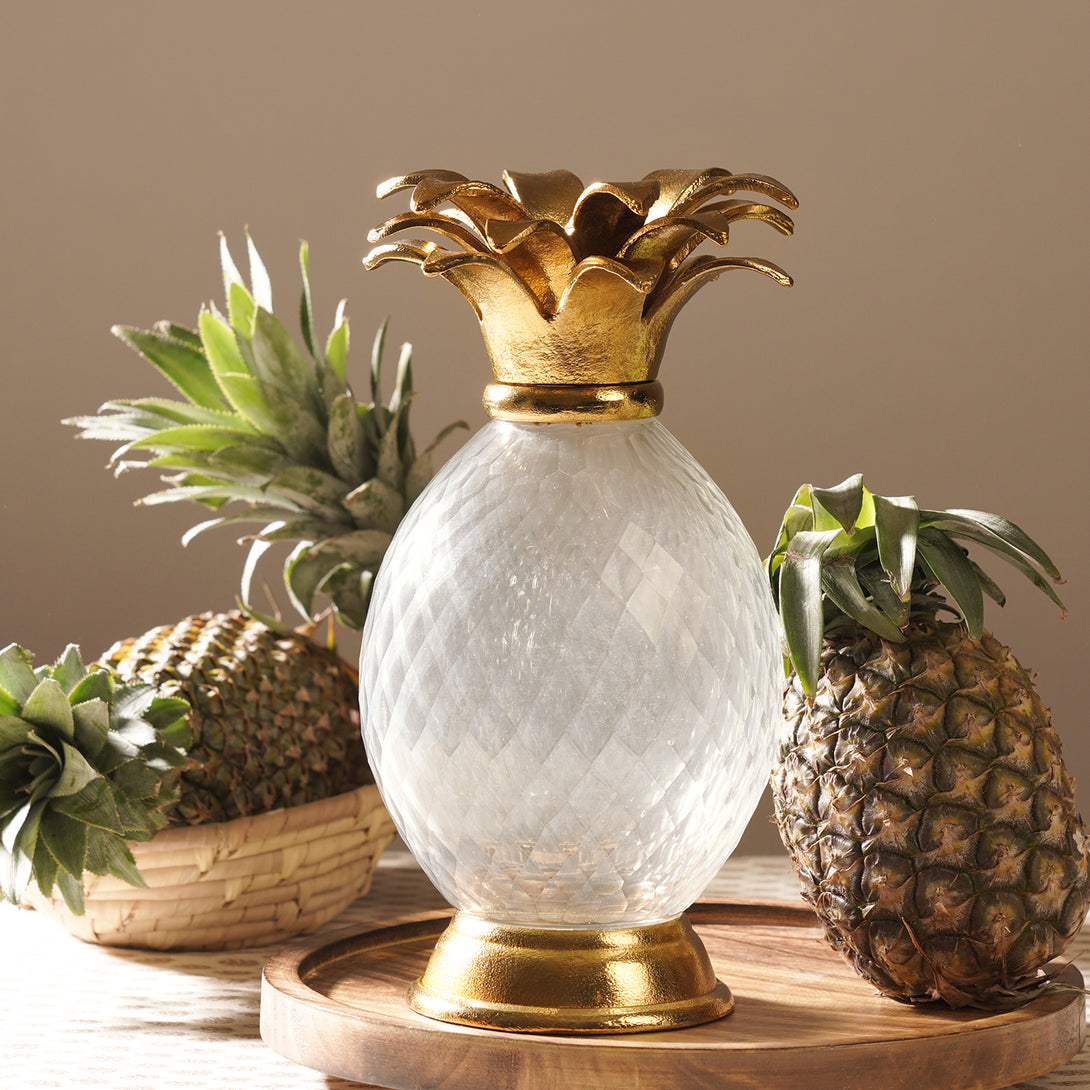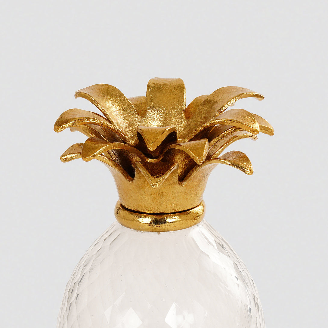 This pineapple-inspired dĂŠcor piece features a glass body paired with a gleaming gold crown. Elegant and symbolic of hospitality, it adds a touch of tropical luxury to any living space.