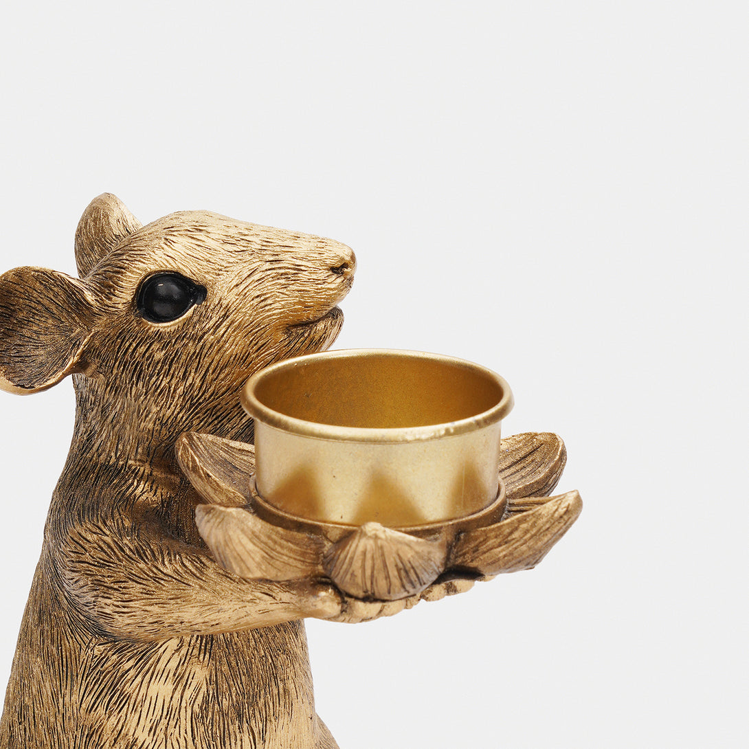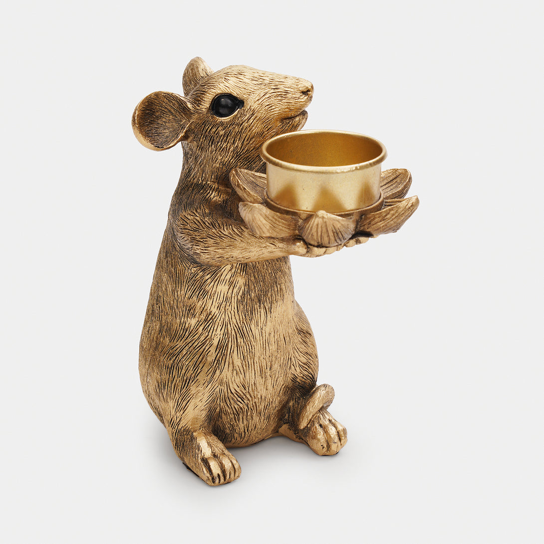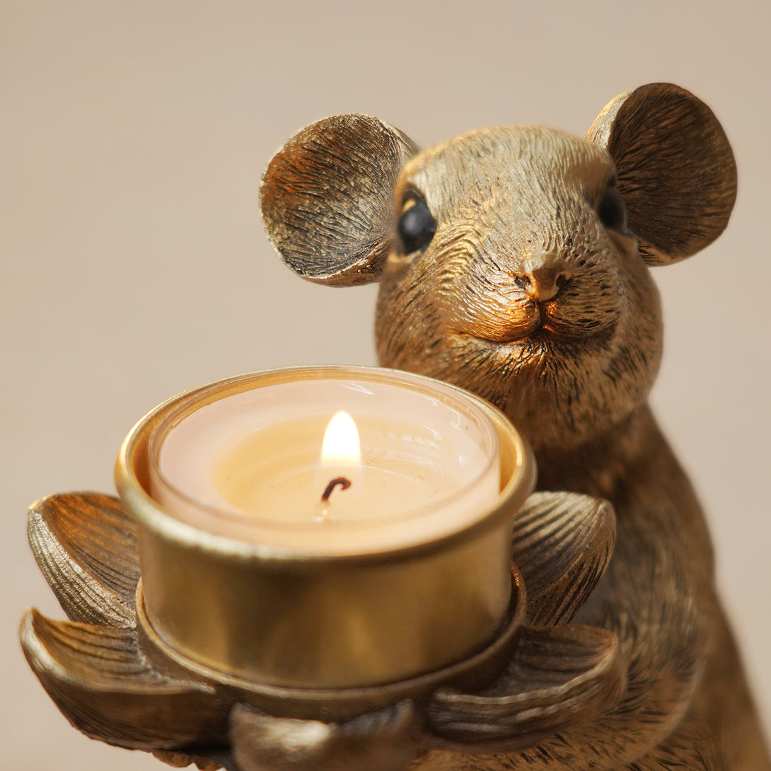 This charming mouse-shaped candle holder, finished in antique gold, blends whimsy with elegance perfect for Easter decor or a woodland-inspired centerpiece.