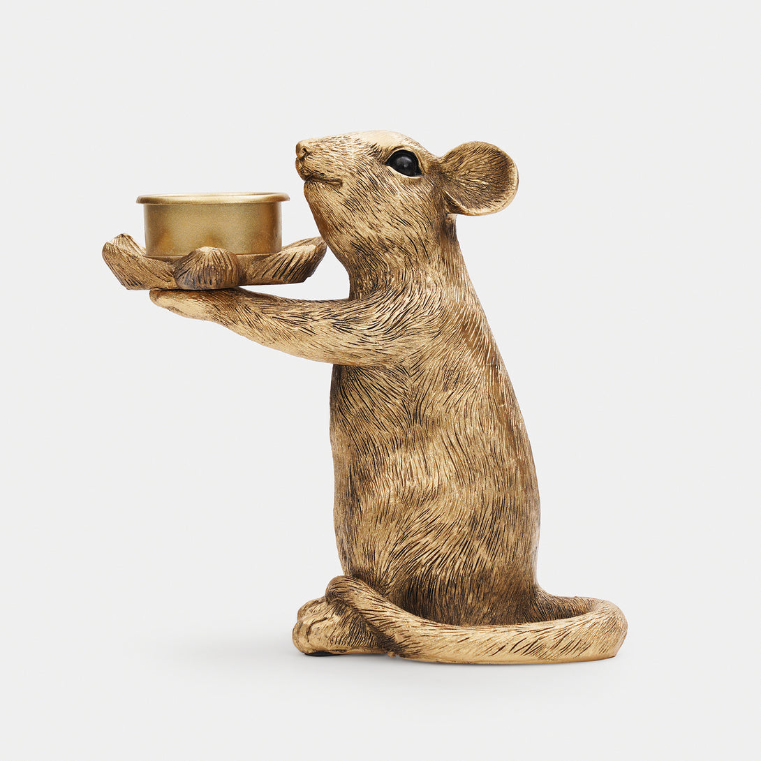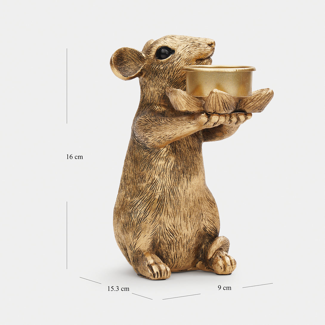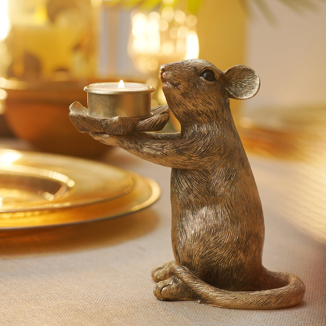This charming mouse-shaped candle holder, finished in antique gold, blends whimsy with elegance perfect for Easter decor or a woodland-inspired centerpiece.