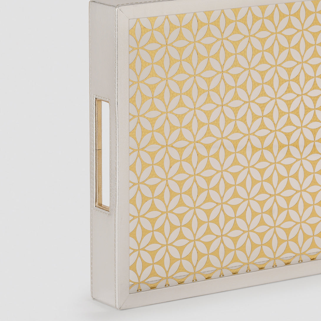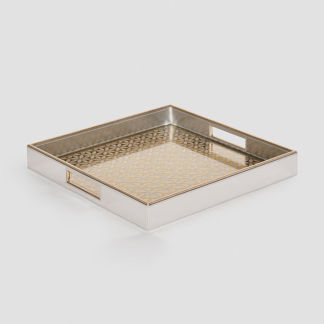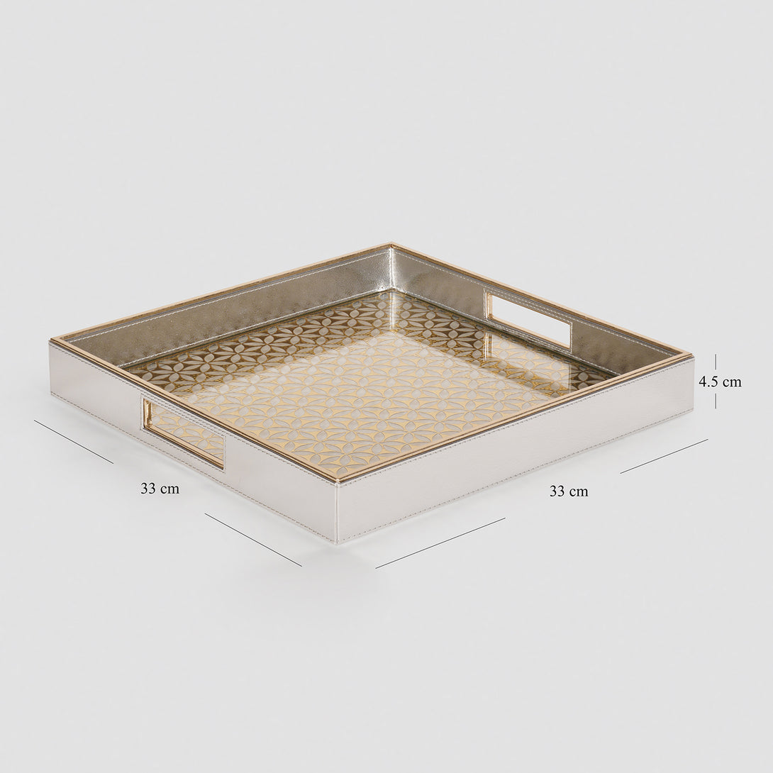 This elegant serving tray features a sleek metallic finish with intricate golden geometric patterns at the base, adding a touch of sophistication to any setting. Designed with sturdy cut-out handles, it combines style with practicality for effortless serving and décor use.