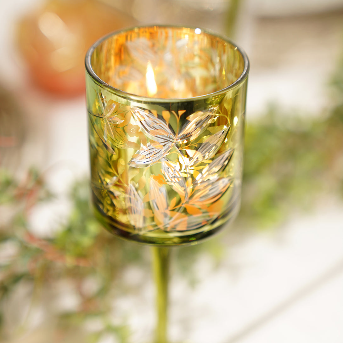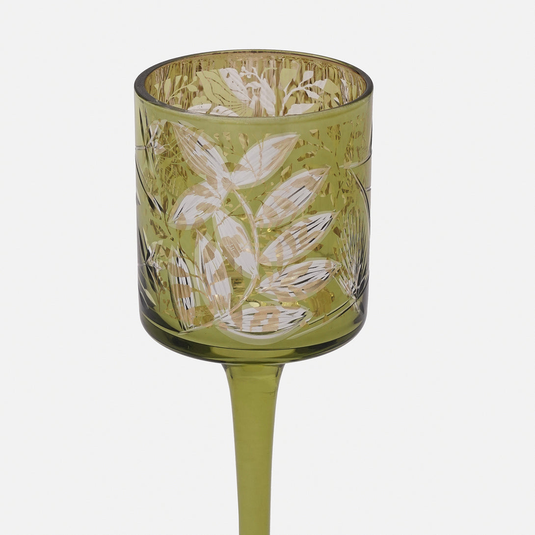 Green Floral Pattern Glass Stem Candle Holder - Small