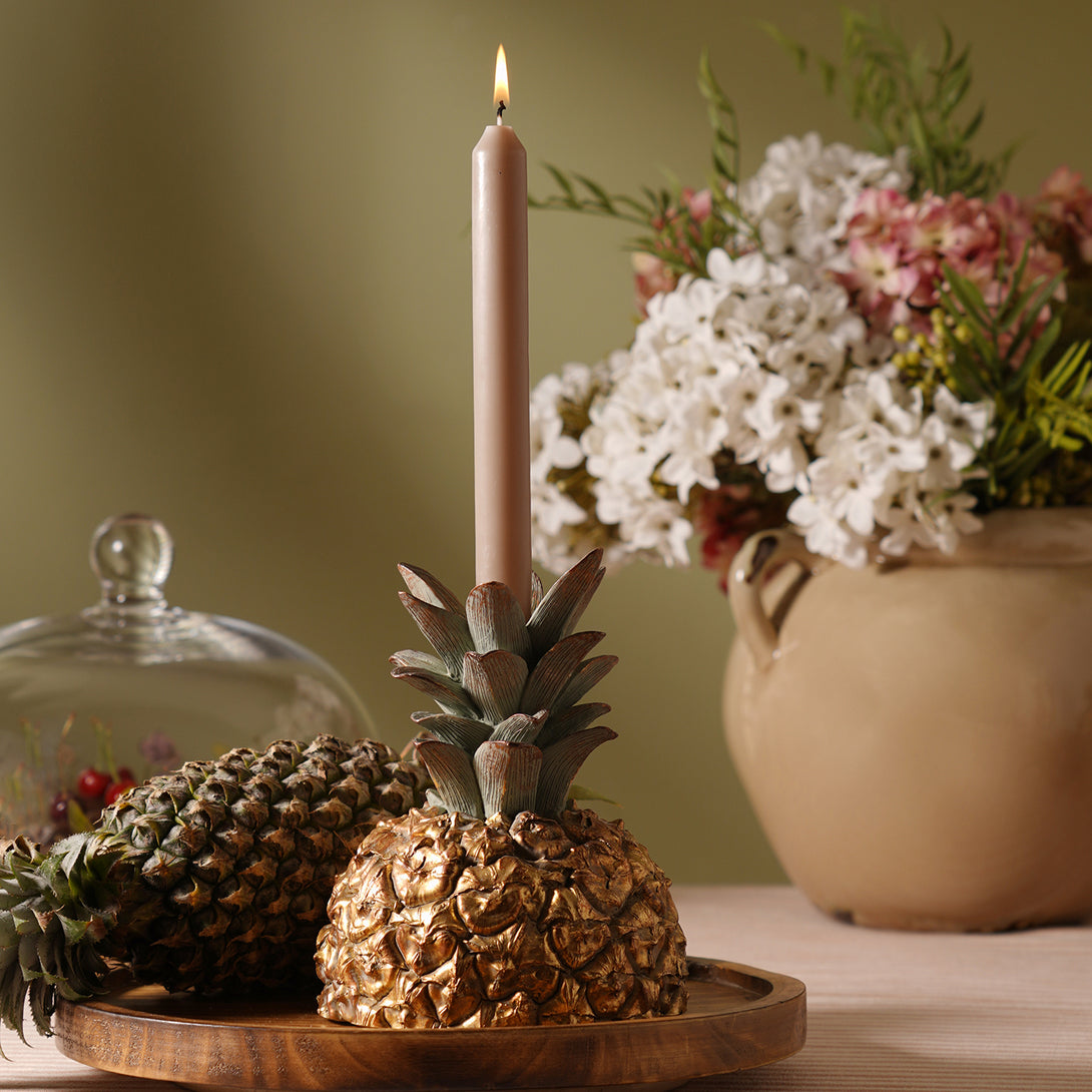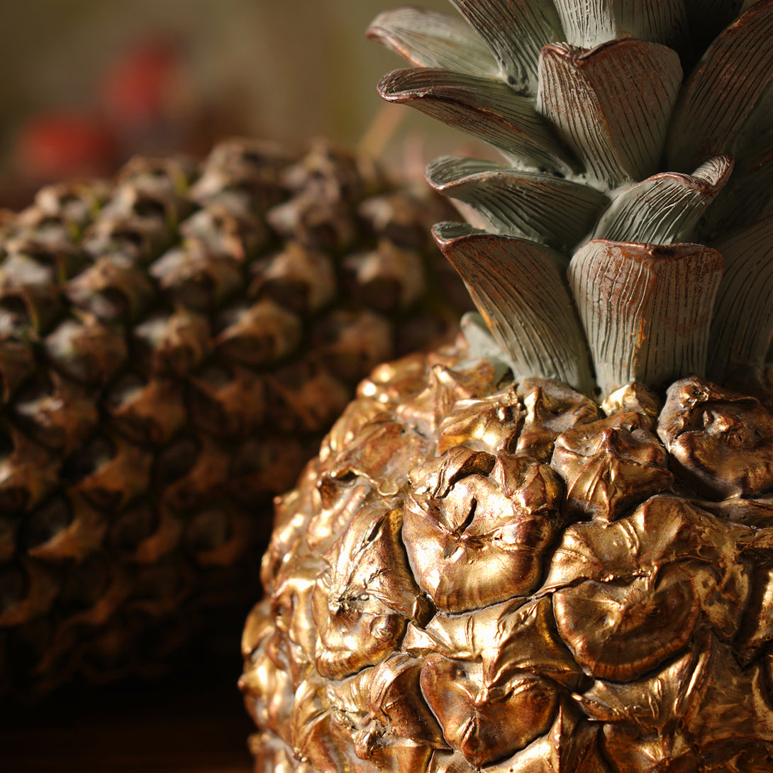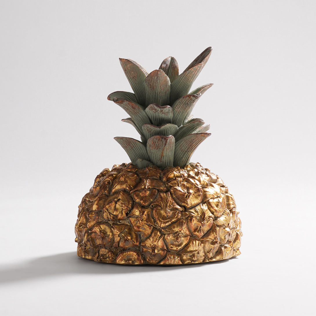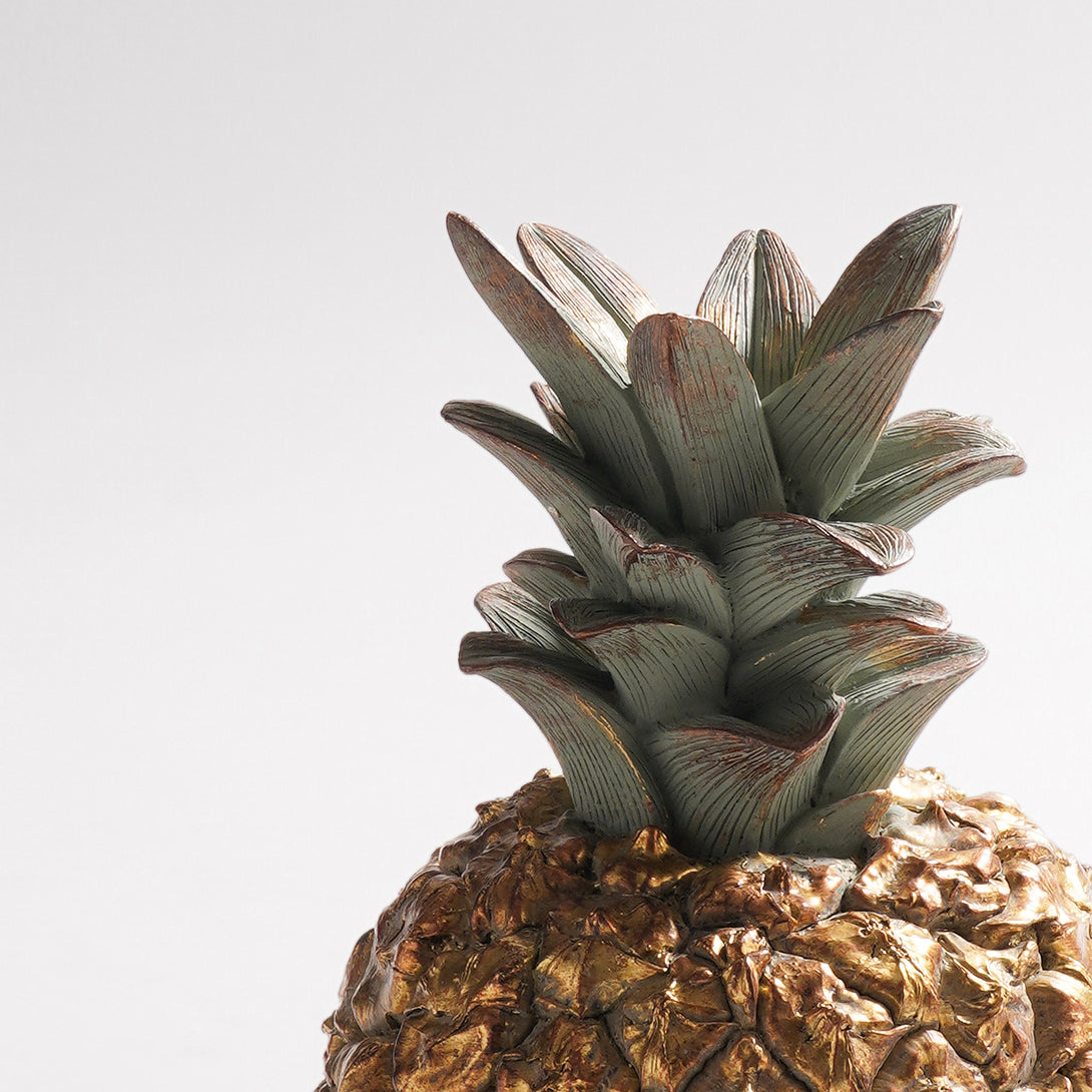 Bring home tropical luxe with this antique gold pineapple decor accent, featuring textured detailing and rustic green leaves.