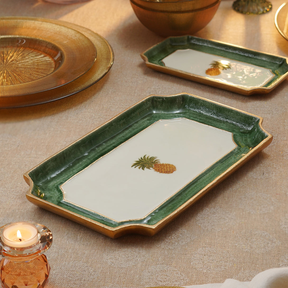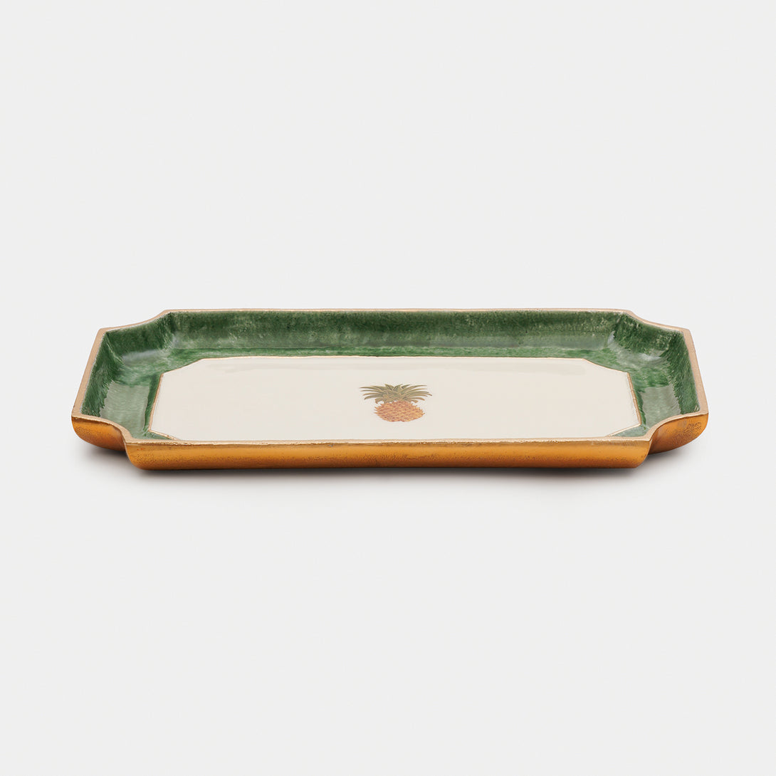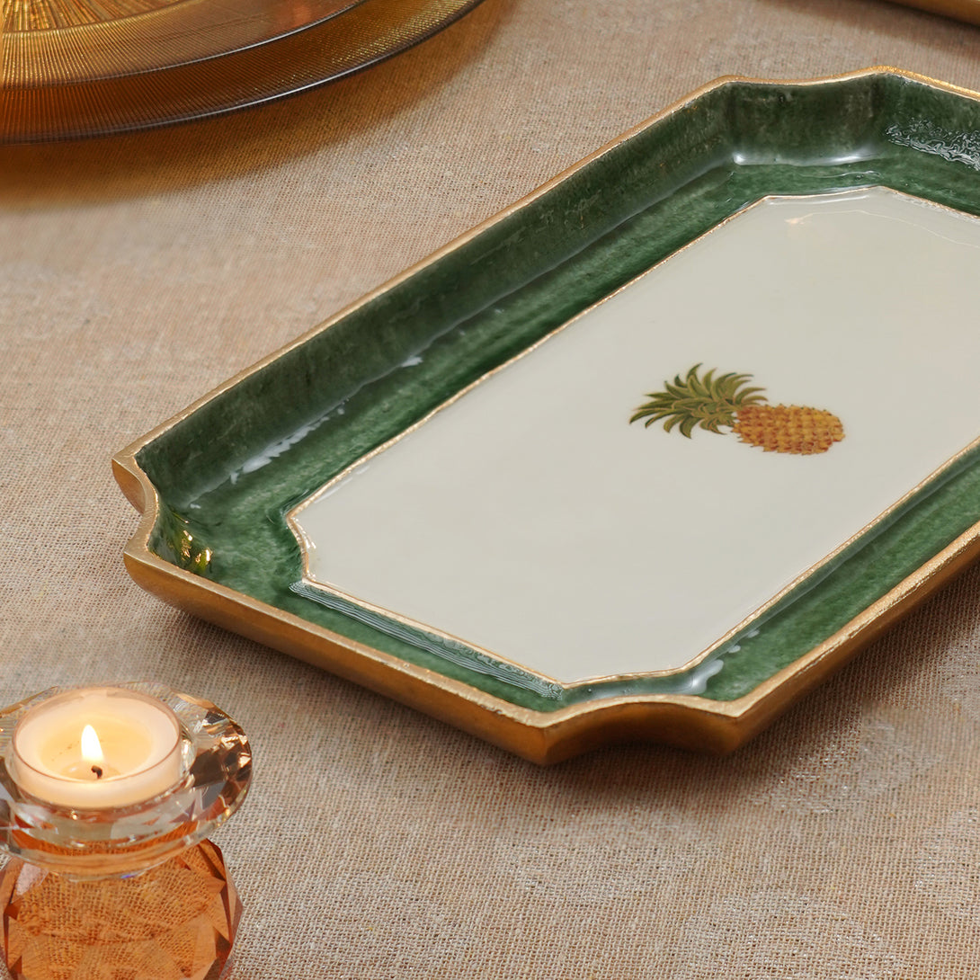 This elegant rectangular tray features a charming pineapple motif at its center, symbolizing warmth and hospitality. Accented with a green border and gold detailing, it adds a touch of tropical sophistication to your table setting.
