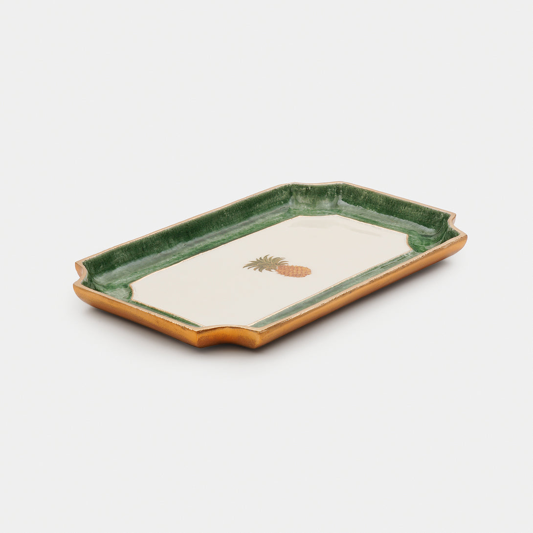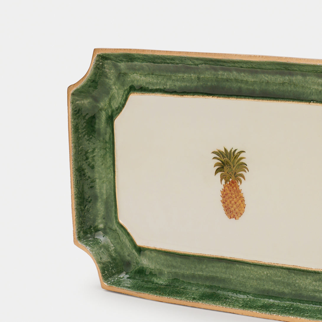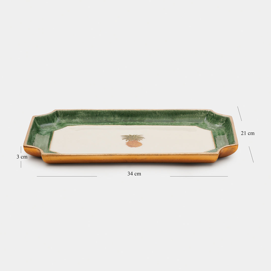 This elegant rectangular tray features a charming pineapple motif at its center, symbolizing warmth and hospitality. Accented with a green border and gold detailing, it adds a touch of tropical sophistication to your table setting.