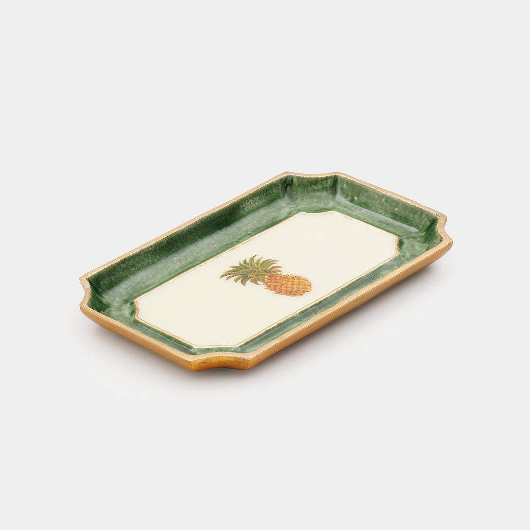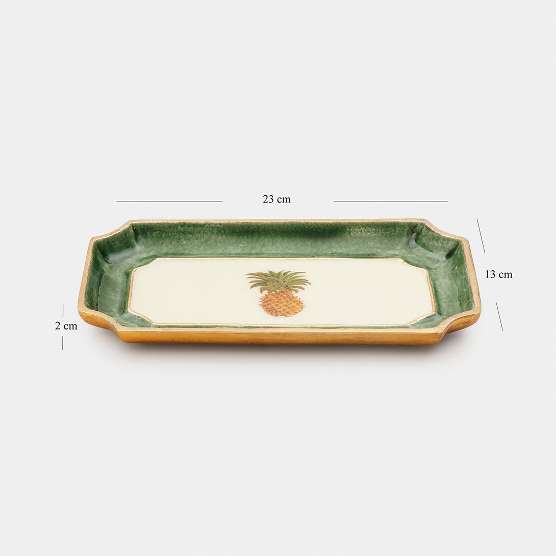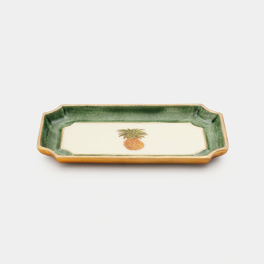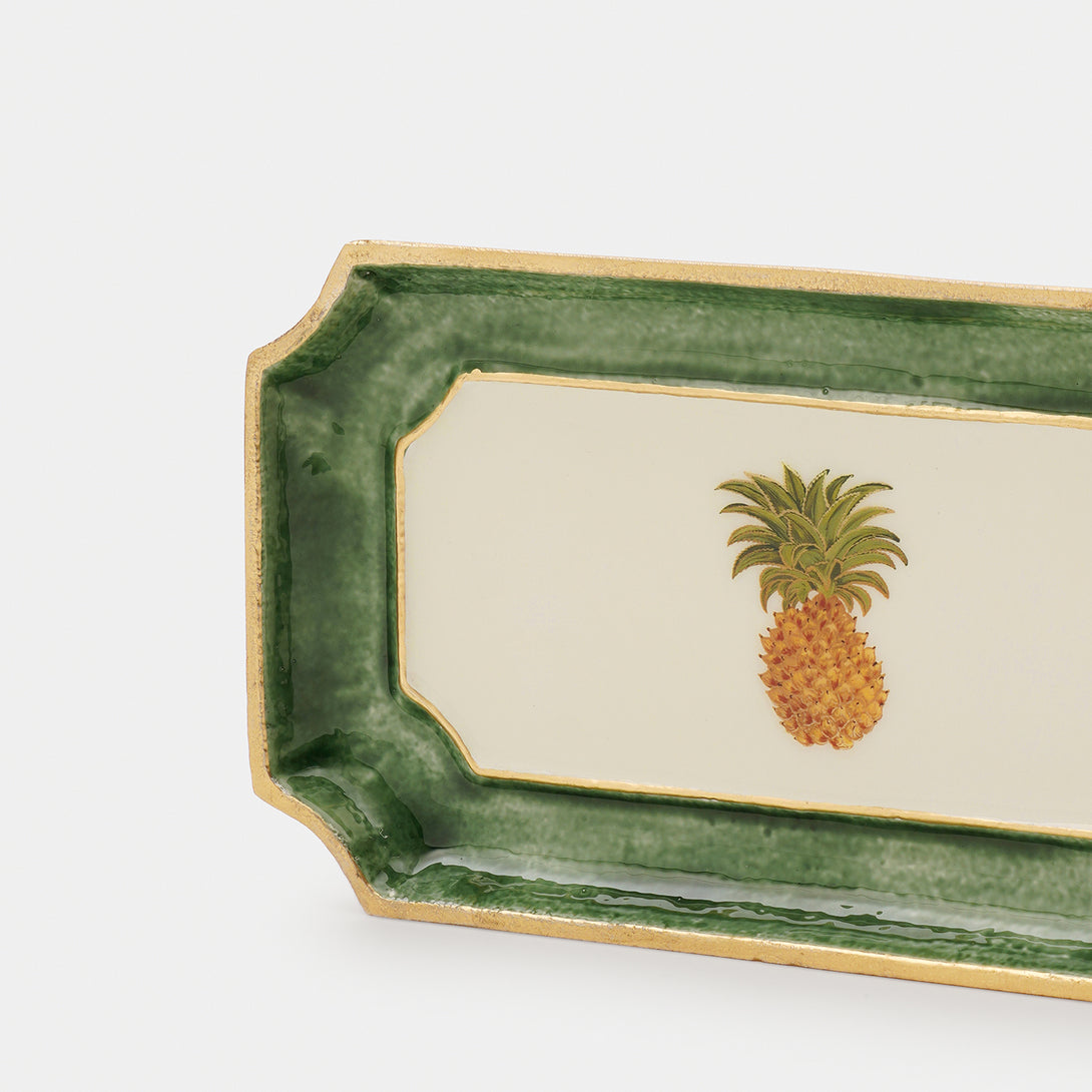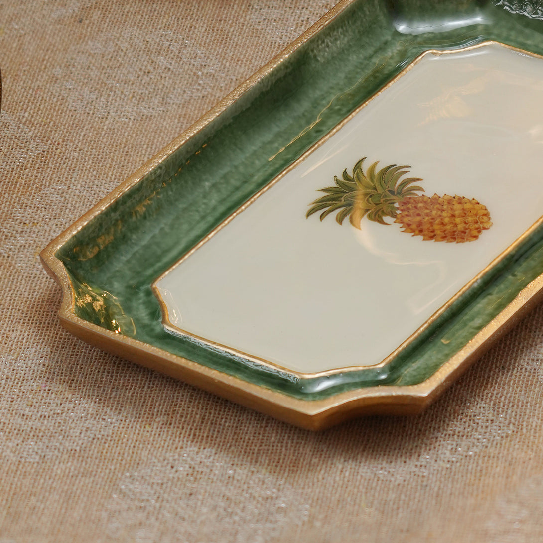This elegant rectangular tray features a charming pineapple motif at its center, symbolizing warmth and hospitality. Accented with a green border and gold detailing, it adds a touch of tropical sophistication to your table setting.