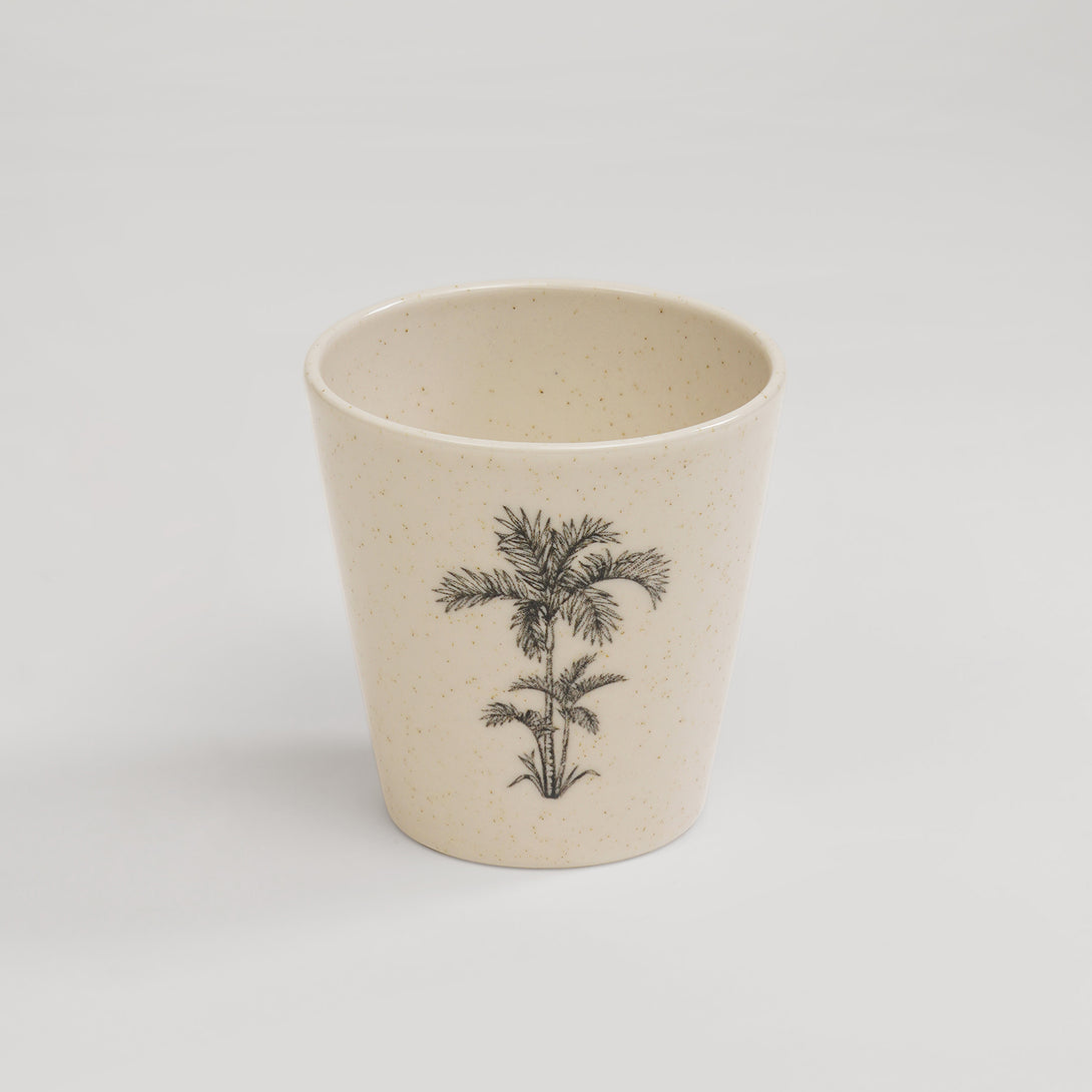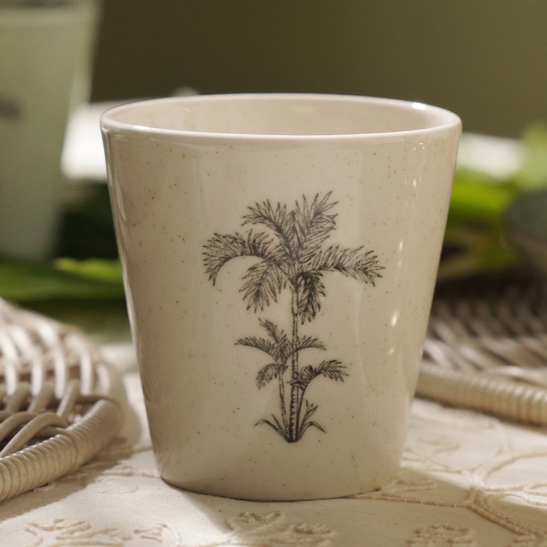 Bring a touch of the tropics to your beverage moments with this ceramic tumbler, adorned with a finely illustrated palm tree motif. Its speckled finish and soft ivory tone offer a warm, earthy charm ideal for cozy sips.