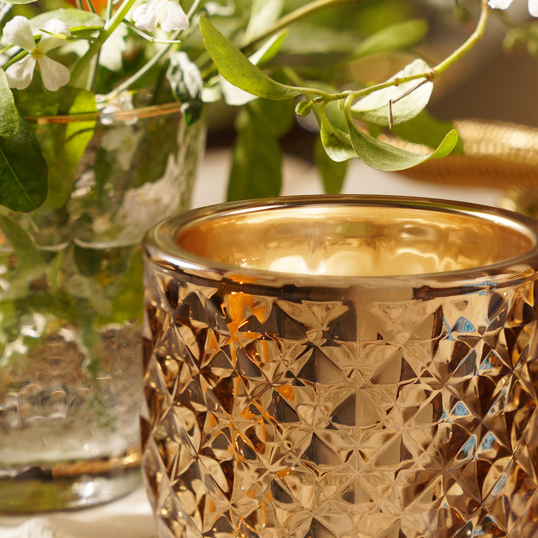 Decorate your beautiful home with this sophisticated and enchanting light amber glass tealight holder. When illuminated, the diamond pattern creates a stunning play of light and shadow, casting a warm, inviting glow.