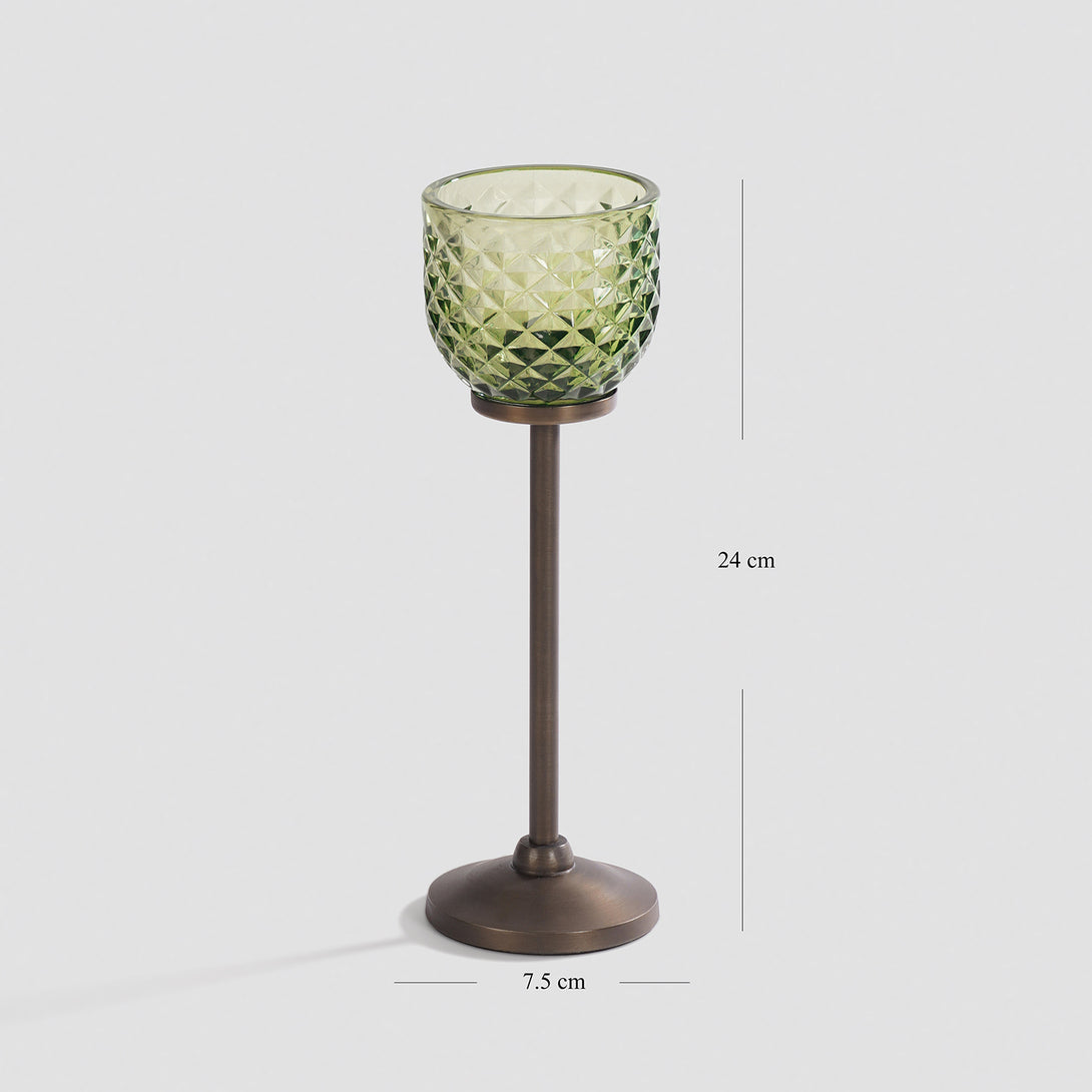 This light green glass votive holder on a tall metallic stand brings a warm, golden glow to any space. Its diamond texture beautifully reflects candlelight, creating a striking play of light and shadow that feels both modern and timeless.